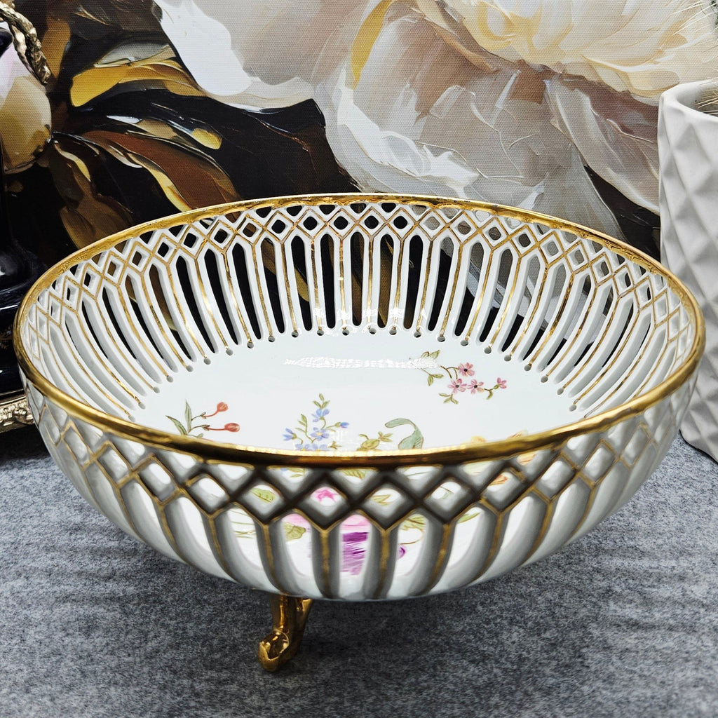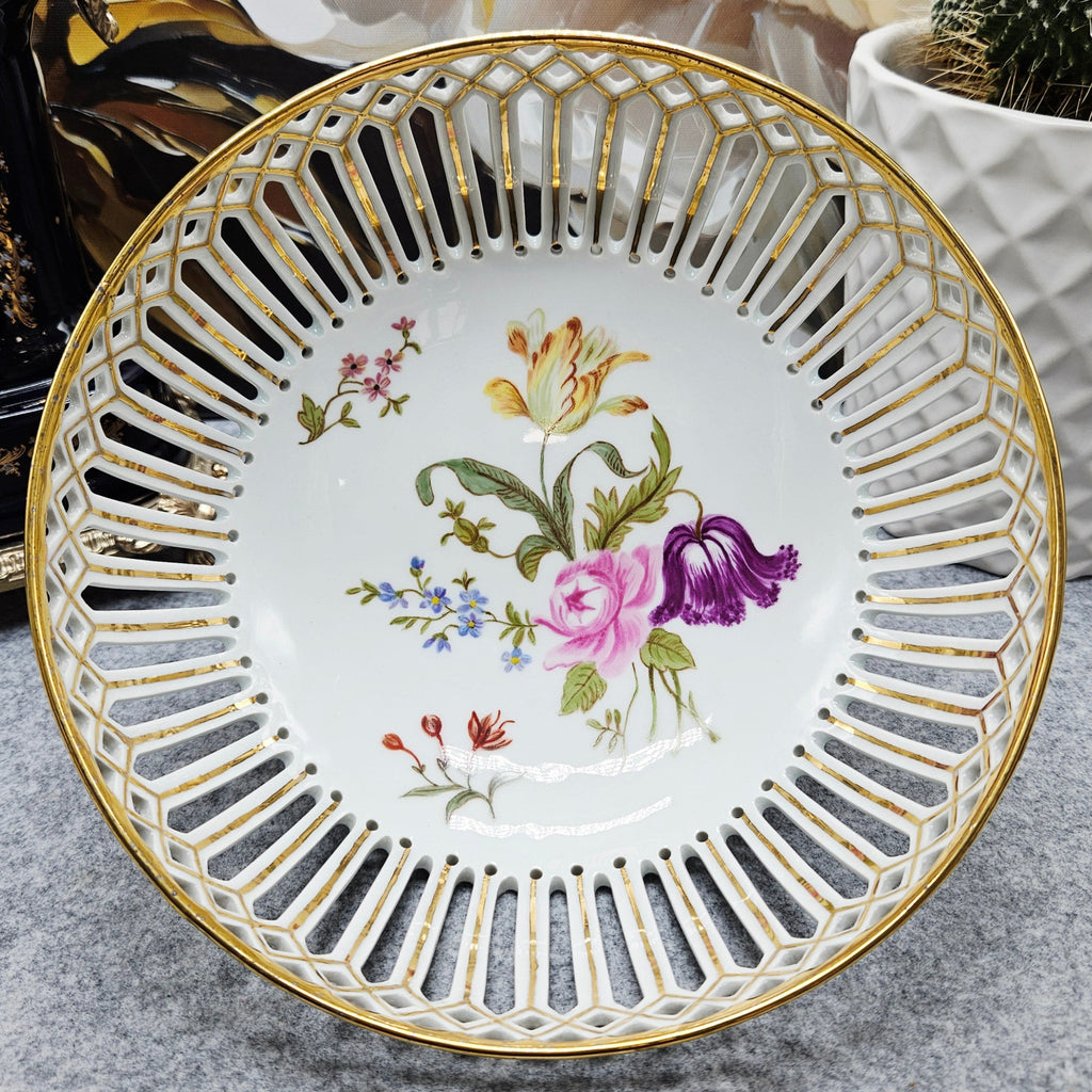 Porzellanschale mit durchbrochenem Rand, polychromer Malerei und vergoldeten Füßen