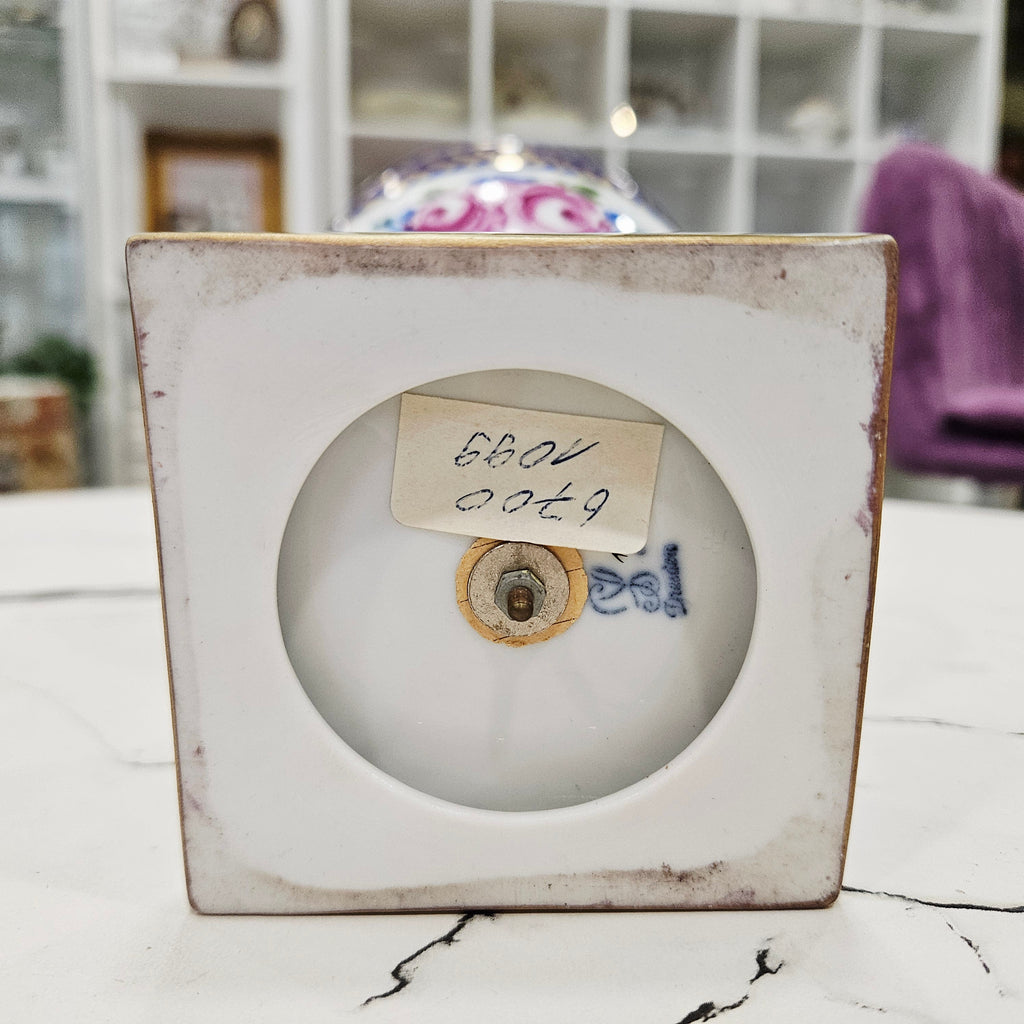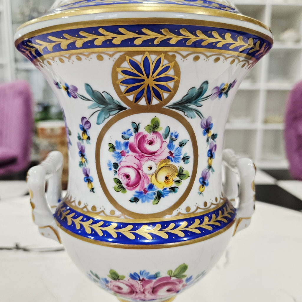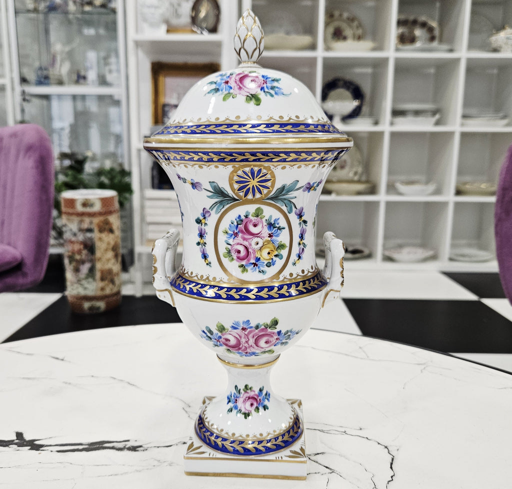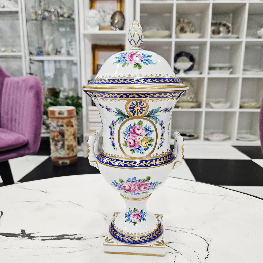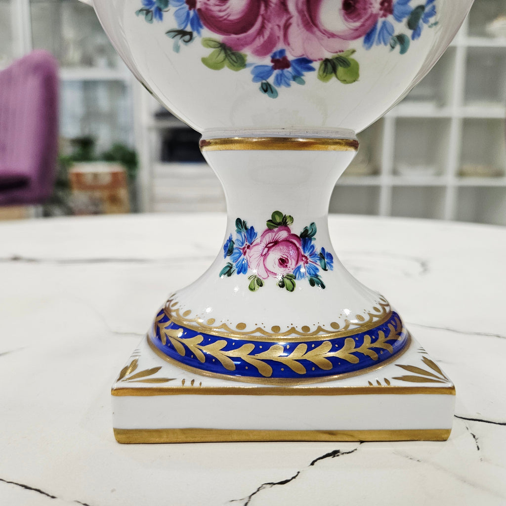 Exquisite, luxuriöse Porzellanvase mit Deckel, verziert mit handgemalten floralen Motiven. Die Vase ist amphorenförmig und steht auf einem quadratischen Sockel mit zwei dekorativen Henkeln an den Seiten.