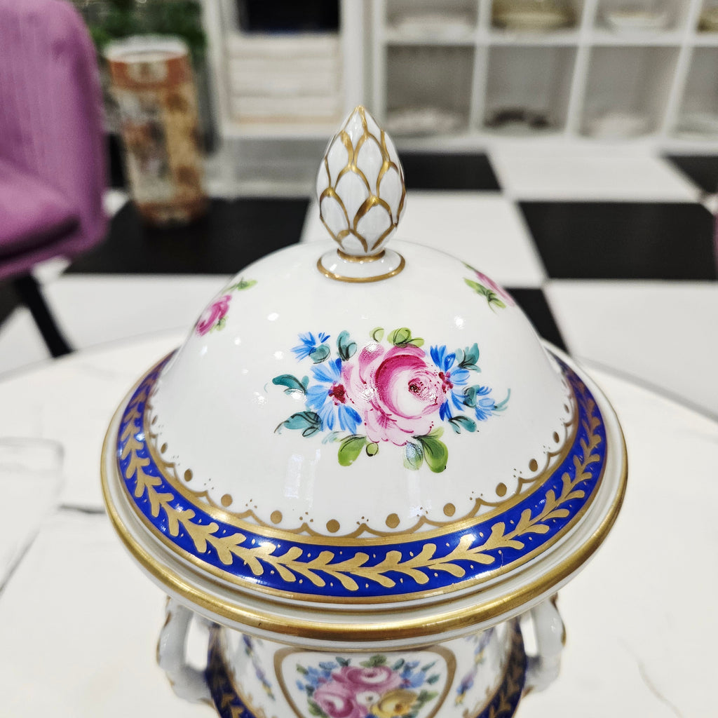 Das Dekor wird von einem satten Kobaltblau dominiert, das reich mit Goldornamenten und Kränzen verziert ist. Die kreisförmige Komposition in der Mitte ist mit mehrfarbigen Rosen- und anderen Blumensträußen verziert, die der Vase eine besondere dekorative Note verleihen. Der Deckel ist mit einem durchbrochenen Goldknauf versehen, der ebenfalls mit Blumenbouquets und Goldornamenten verziert ist.