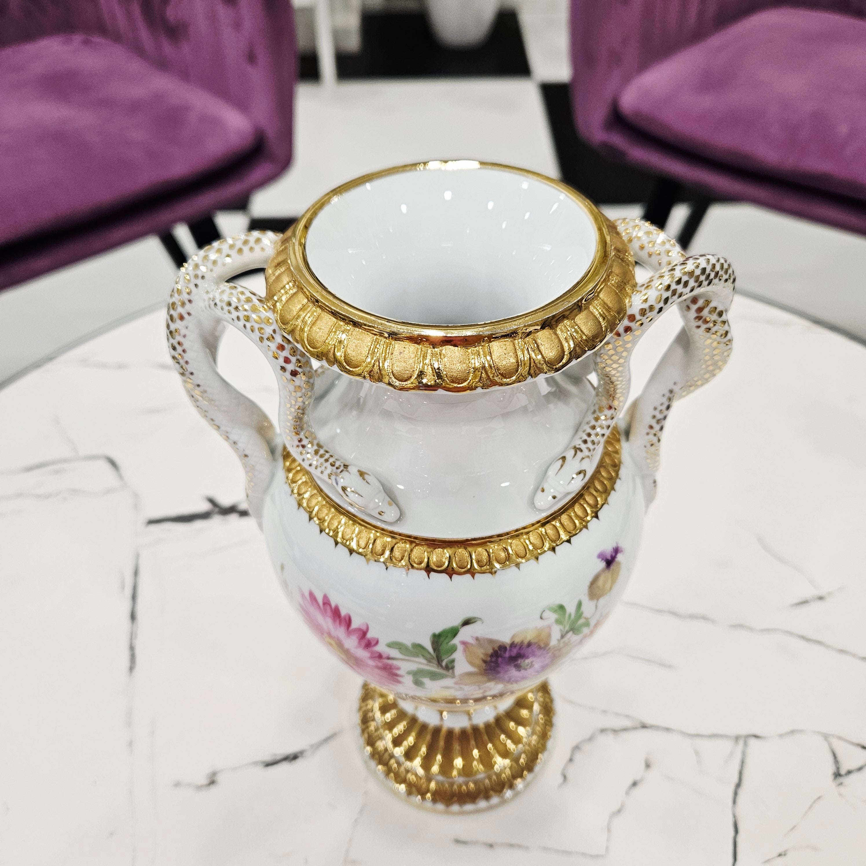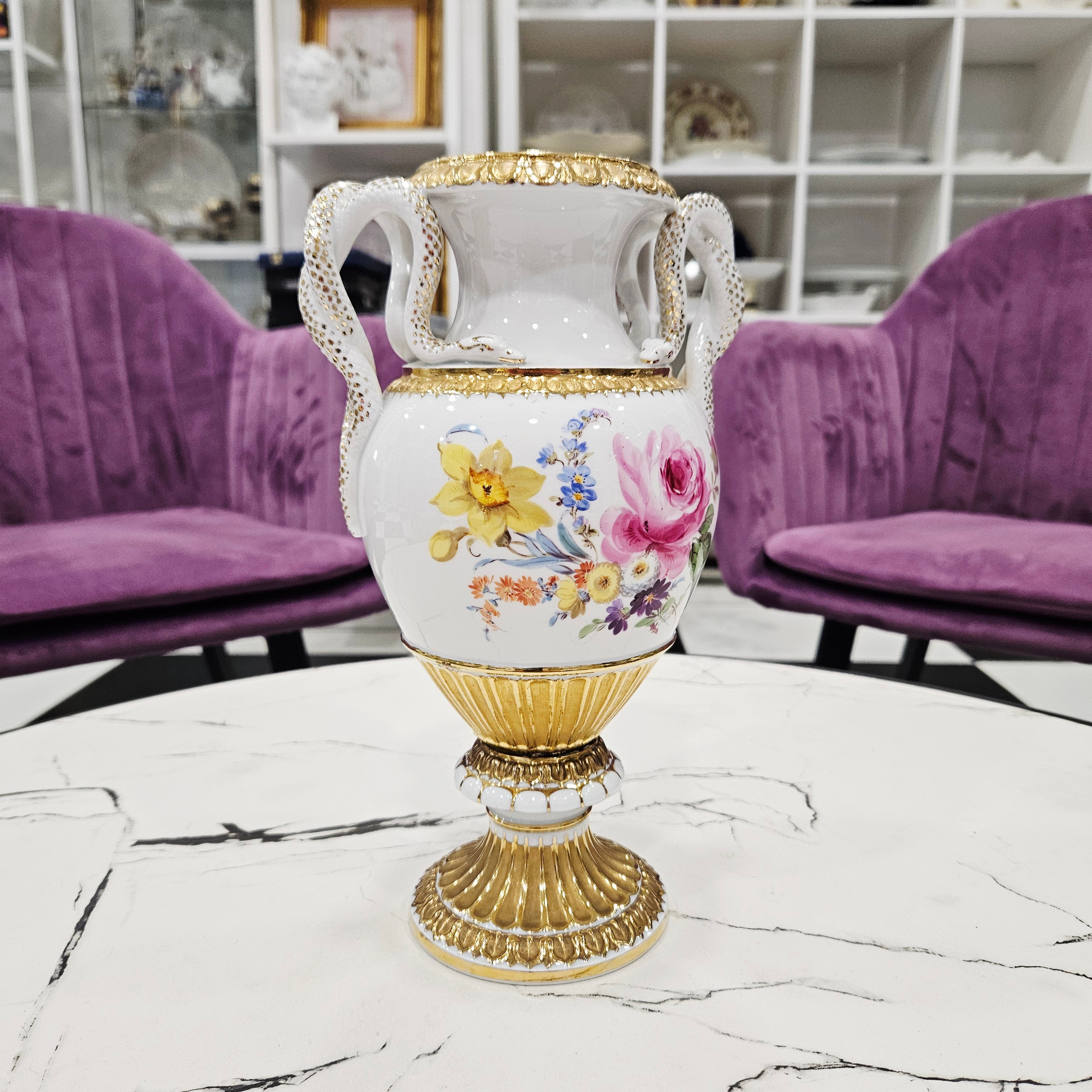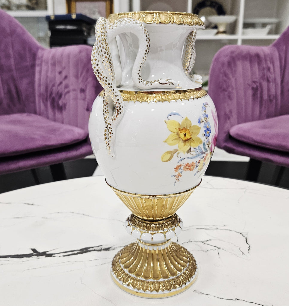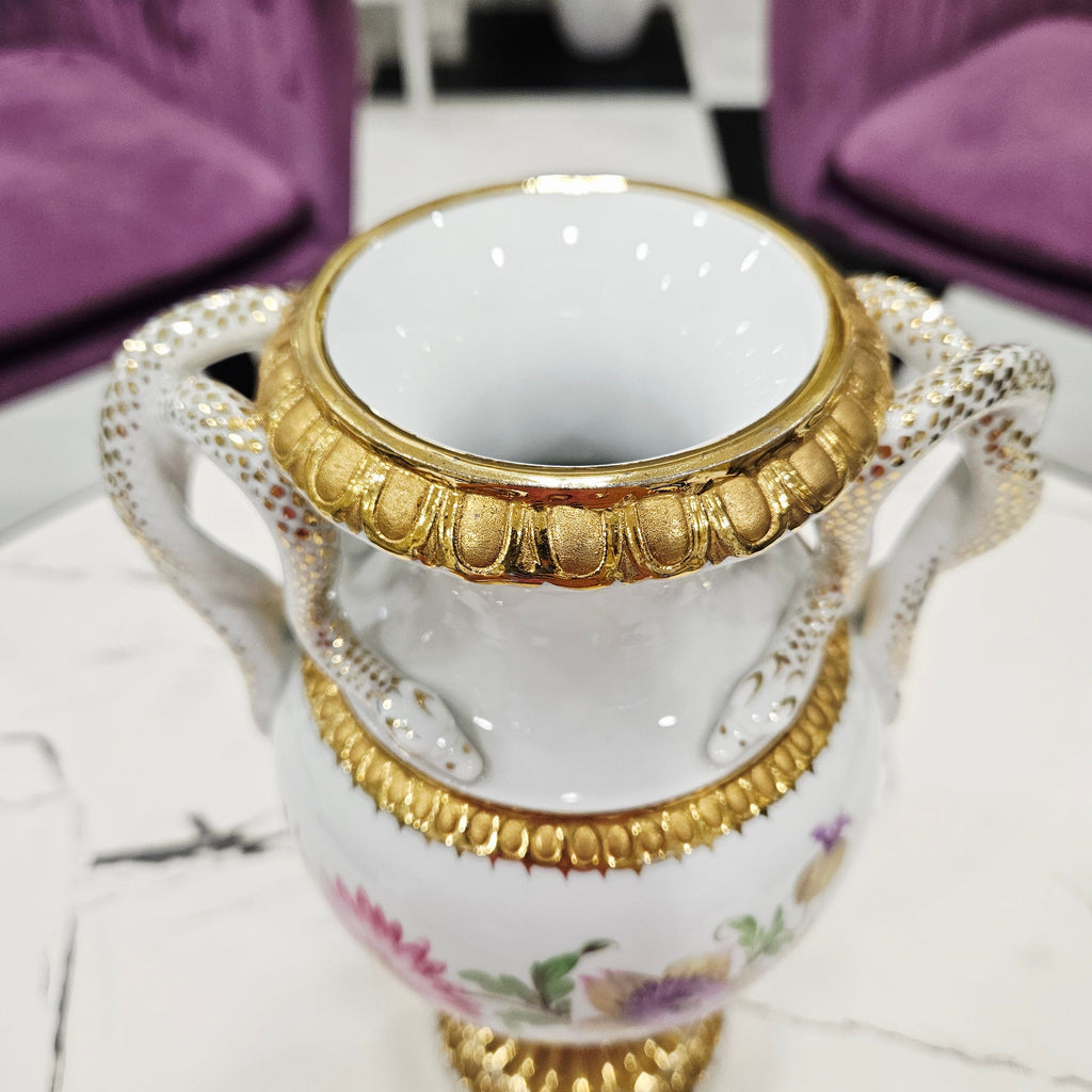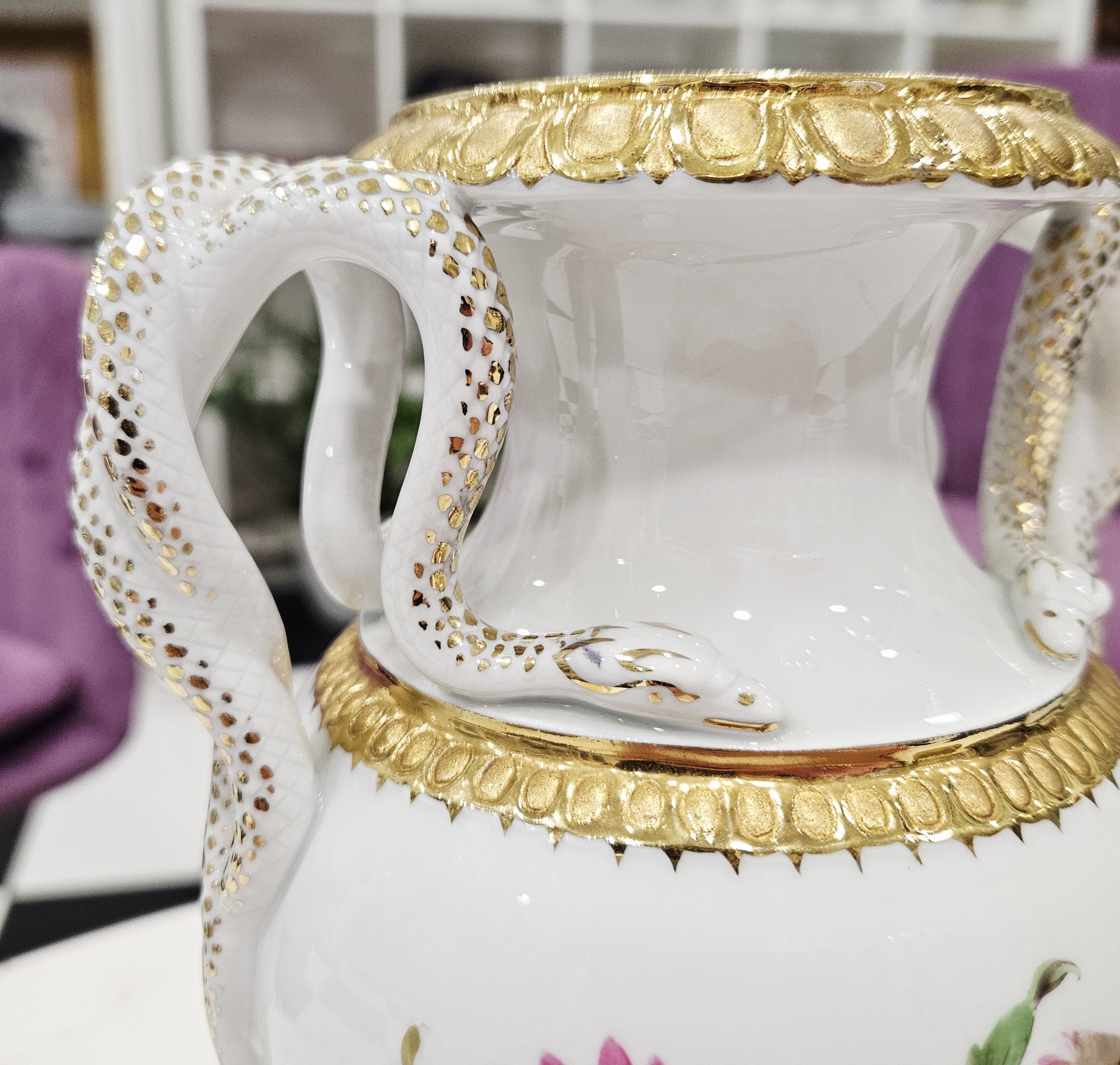 Ein besonderes Highlight sind die raffinierten schlangenförmigen Henkel, die Weisheit und Ewigkeit symbolisieren. Sie sind mit einem zarten Gittermuster und goldenen Details verziert, die die Dynamik der Form unterstreichen. Die Vase ist mit einem handgemalten floralen Ensemble verziert, das eine harmonische Farbsymphonie auf dem weißen Porzellangrund bildet.