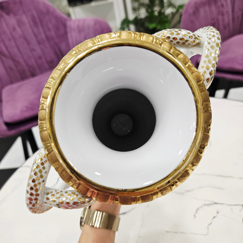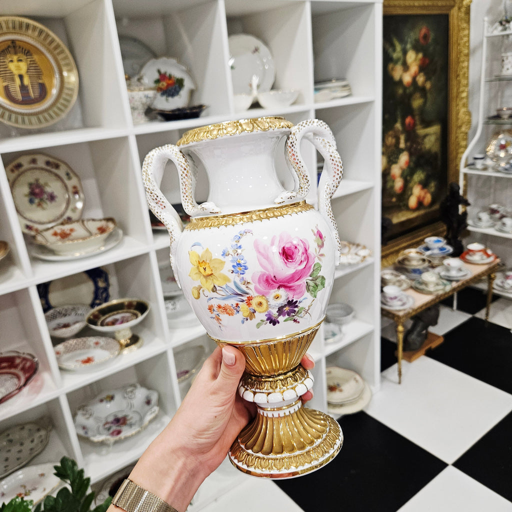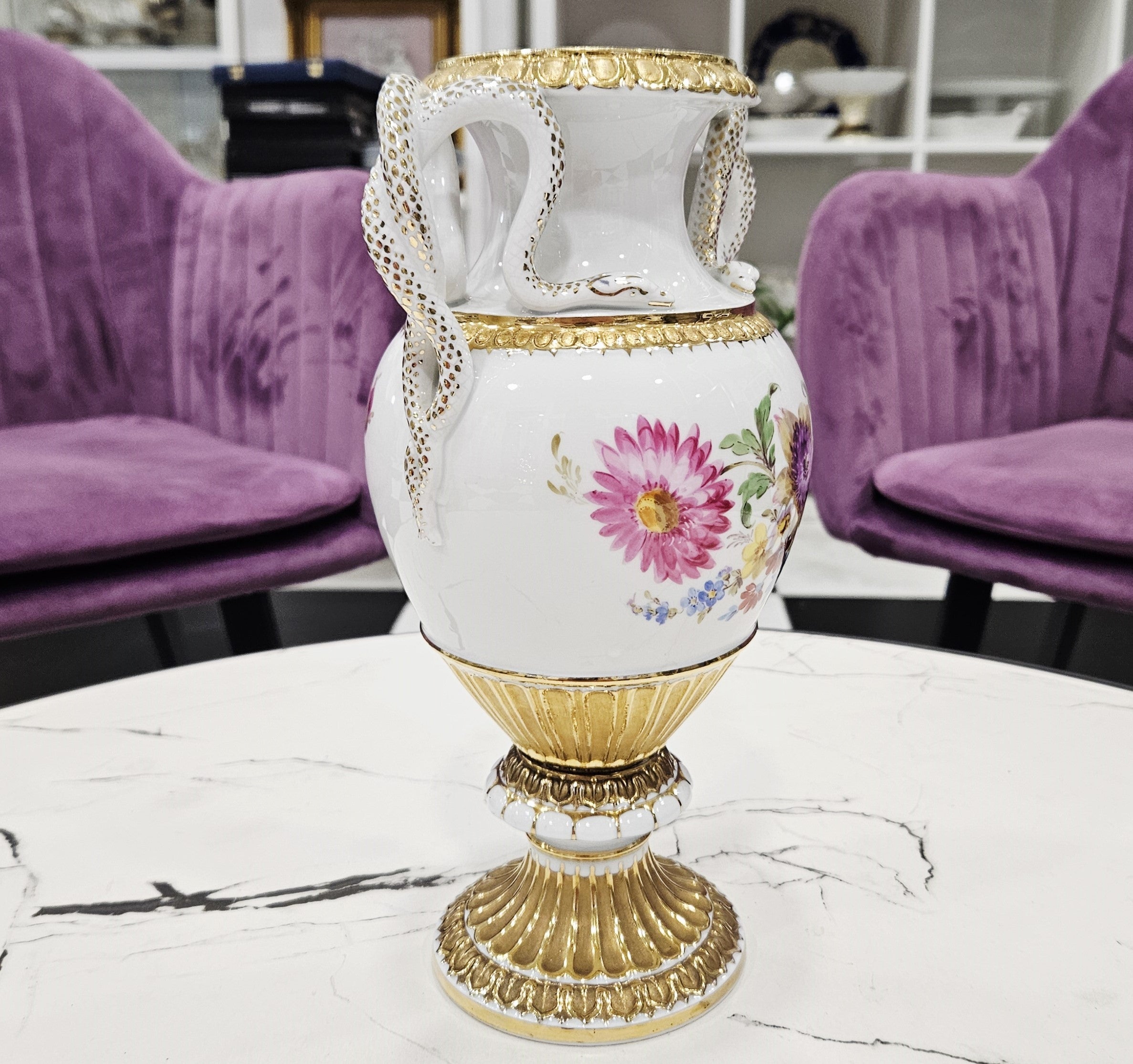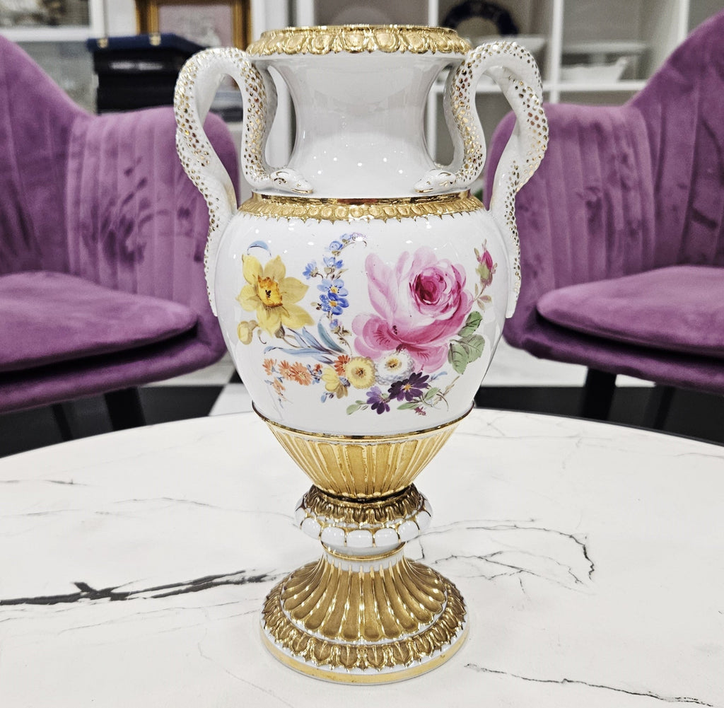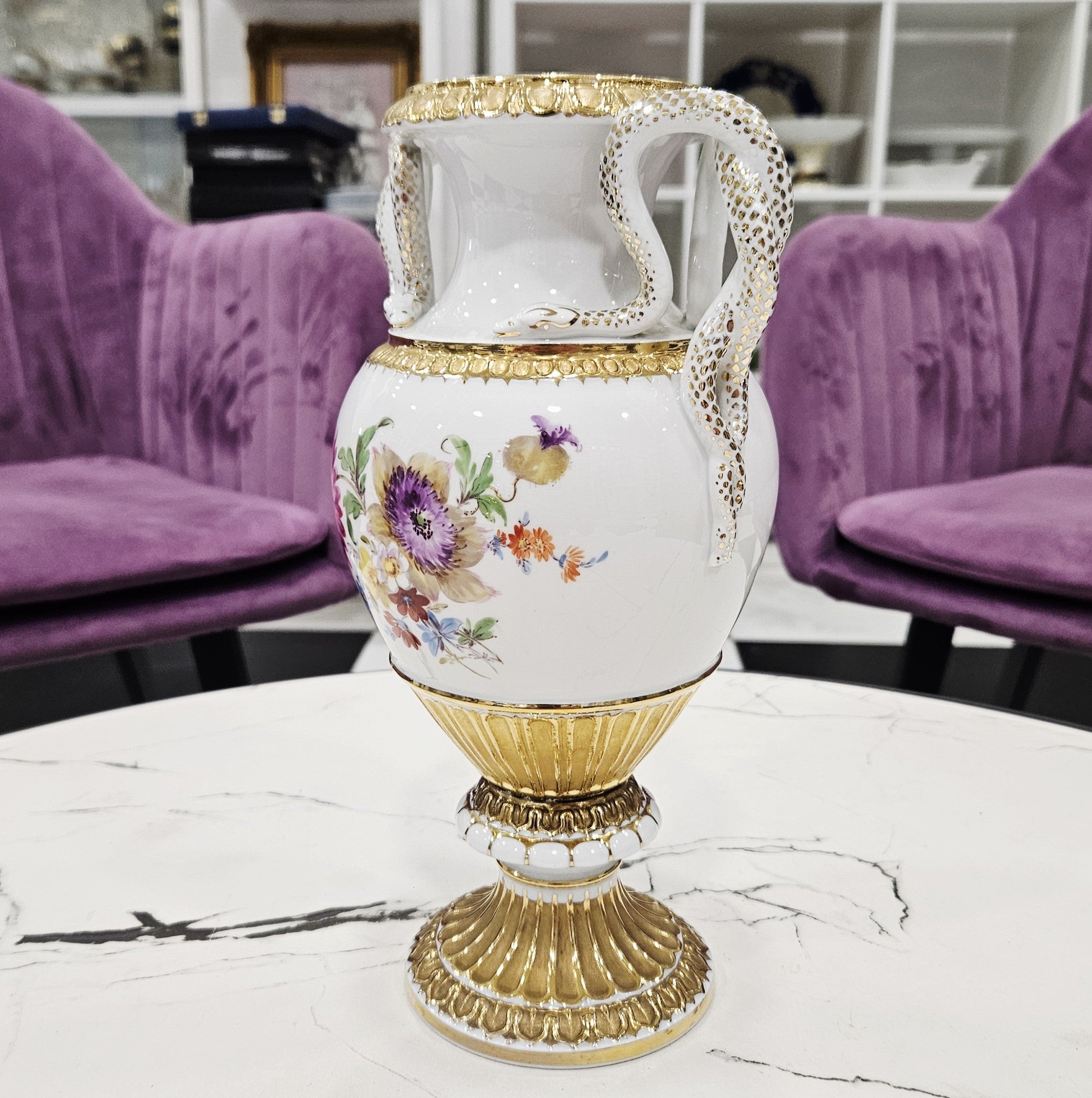 Ein besonderes Highlight sind die raffinierten schlangenförmigen Henkel, die Weisheit und Ewigkeit symbolisieren. Sie sind mit einem zarten Gittermuster und goldenen Details verziert, die die Dynamik der Form unterstreichen. Die Vase ist mit einem handgemalten floralen Ensemble verziert, das eine harmonische Farbsymphonie auf dem weißen Porzellangrund bildet.