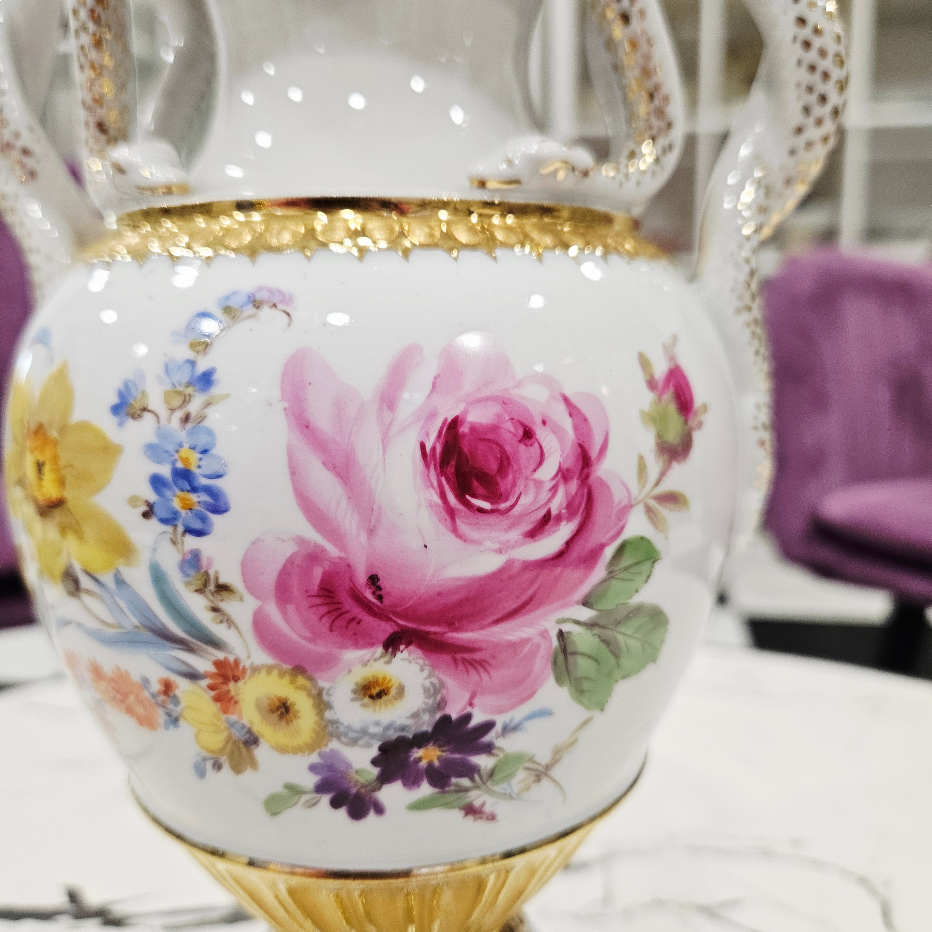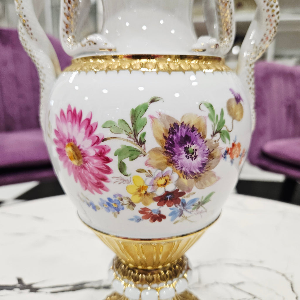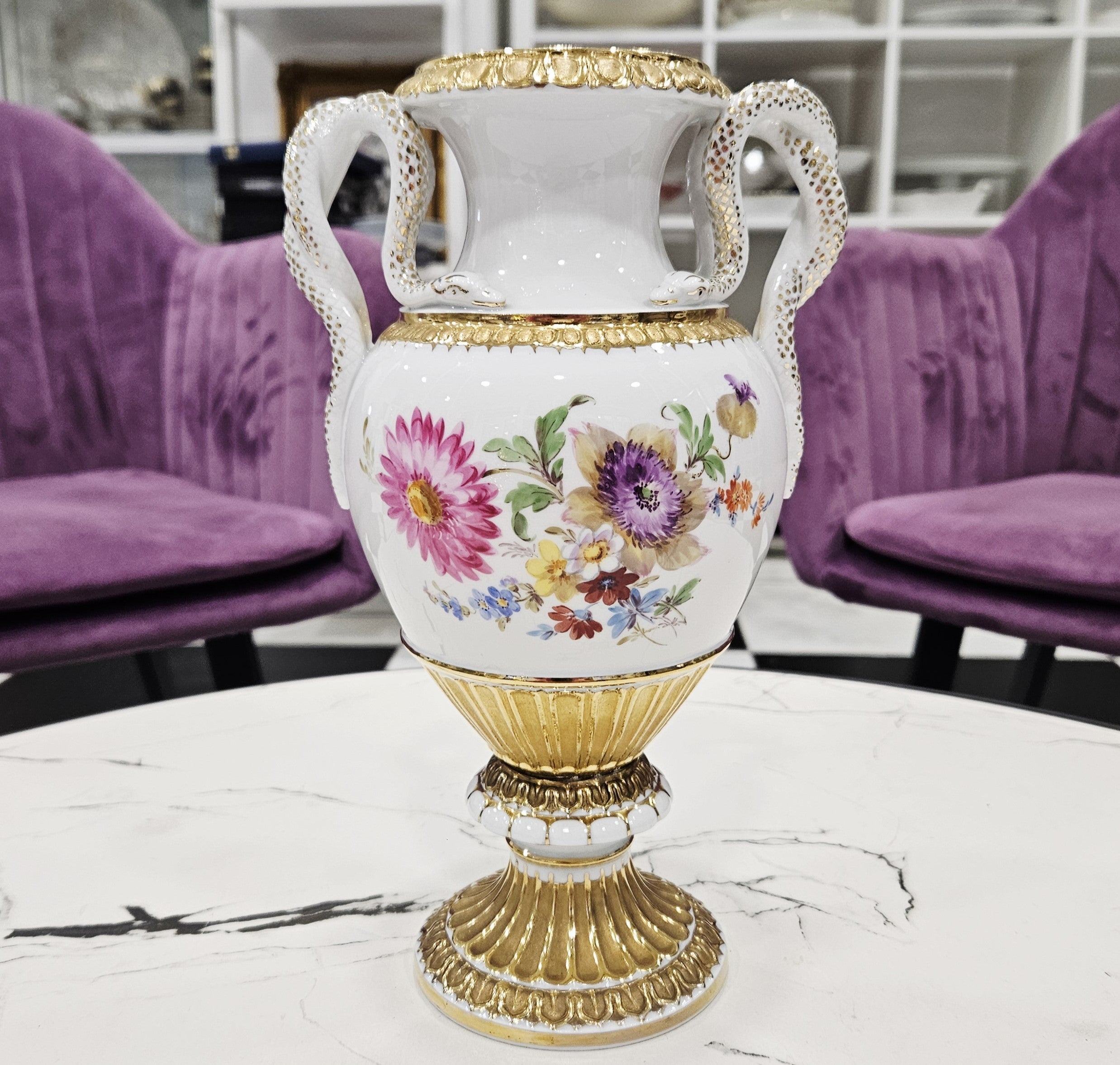 Die Meissener Porzellanvase von außergewöhnlicher Handwerkskunst ist ein wahres Kunstwerk, das die höchste Stufe deutscher Porzellantradition und raffinierter Ästhetik widerspiegelt. Verziert mit handgemalten floralen Motiven und 24 Karat vergoldeten Ornamenten strahlt diese luxuriöse Vase Eleganz und Exklusivität aus.