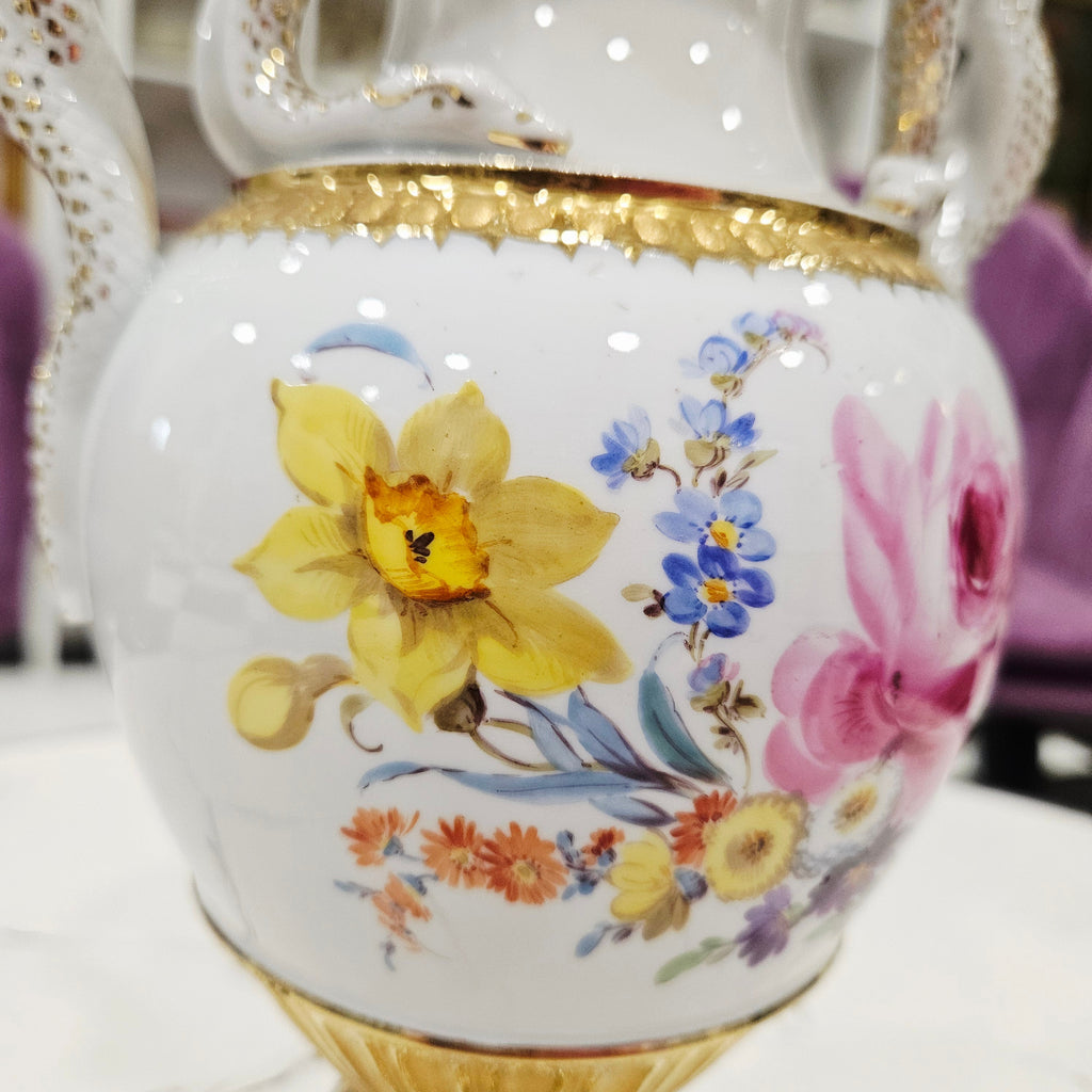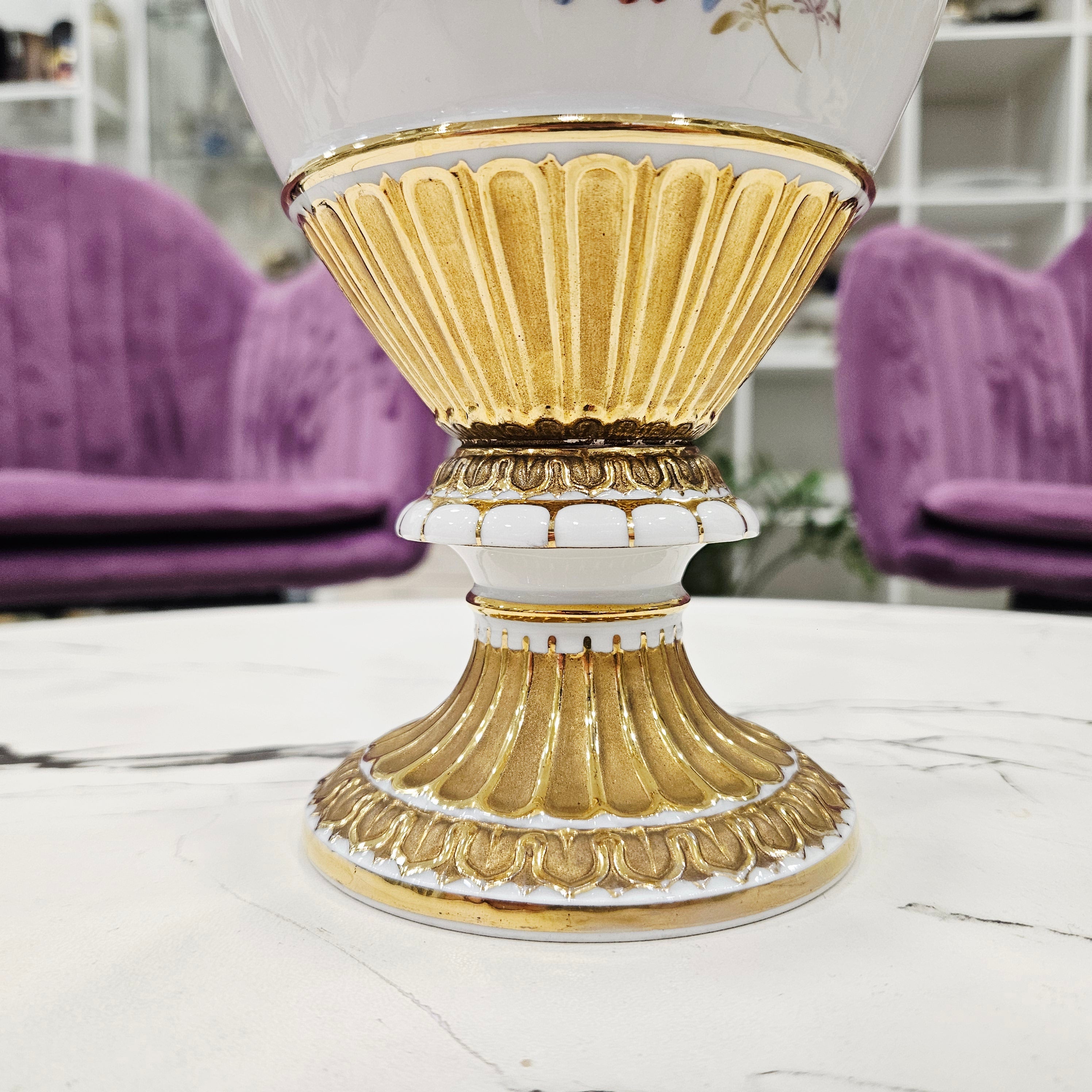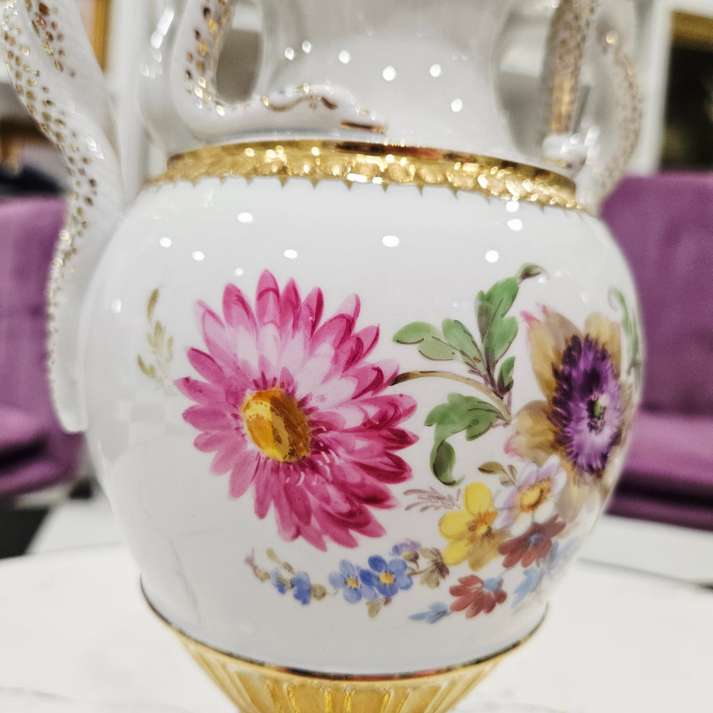 Die Meissener Porzellanvase von außergewöhnlicher Handwerkskunst ist ein wahres Kunstwerk, das die höchste Stufe deutscher Porzellantradition und raffinierter Ästhetik widerspiegelt. Verziert mit handgemalten floralen Motiven und 24 Karat vergoldeten Ornamenten strahlt diese luxuriöse Vase Eleganz und Exklusivität aus.