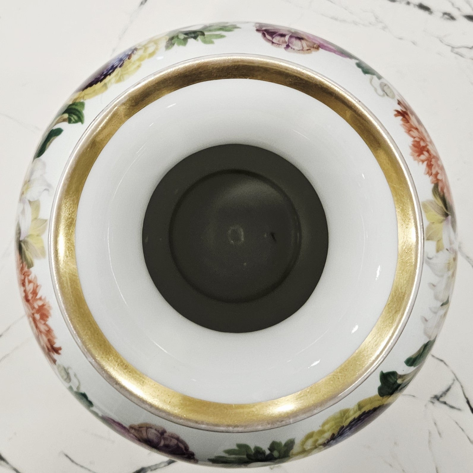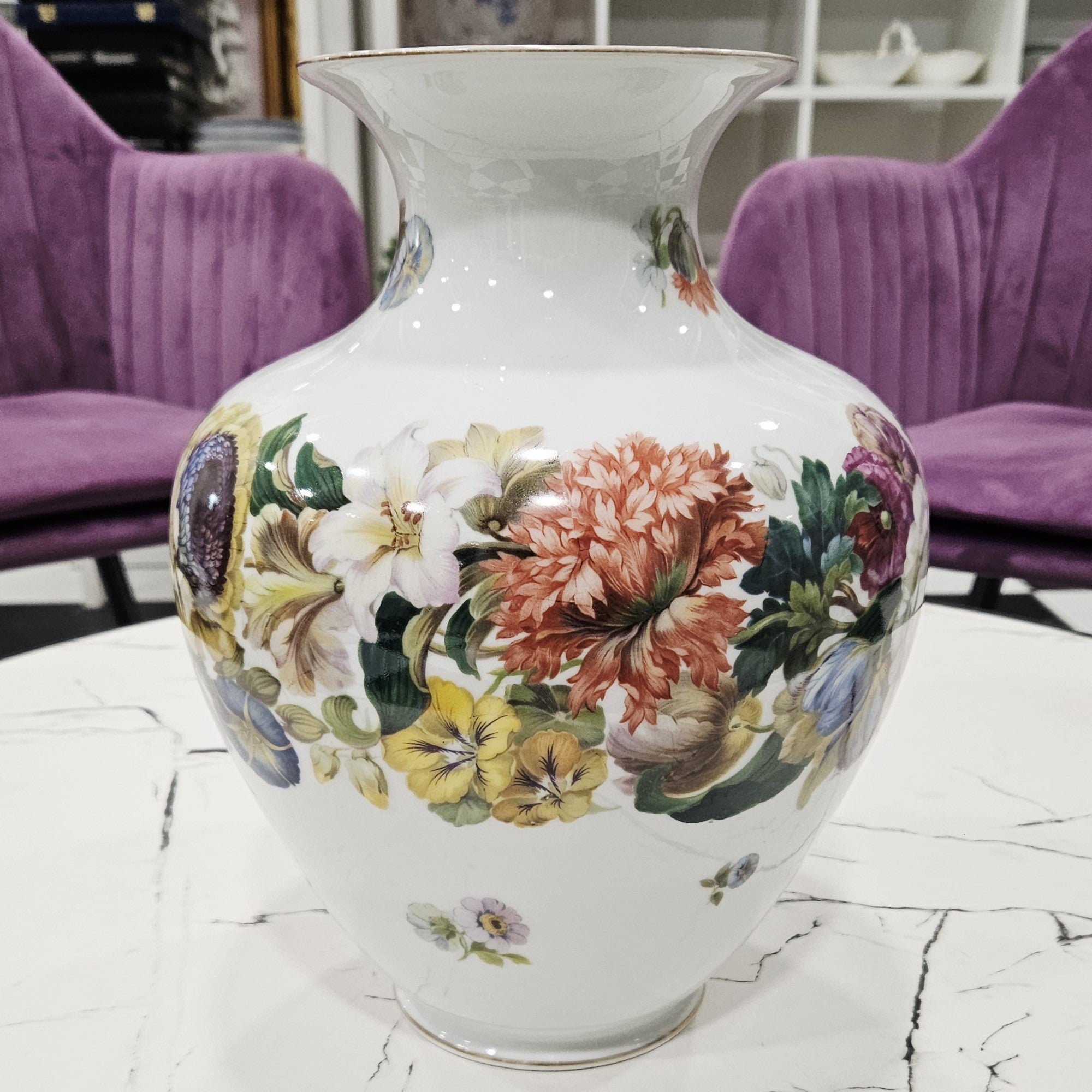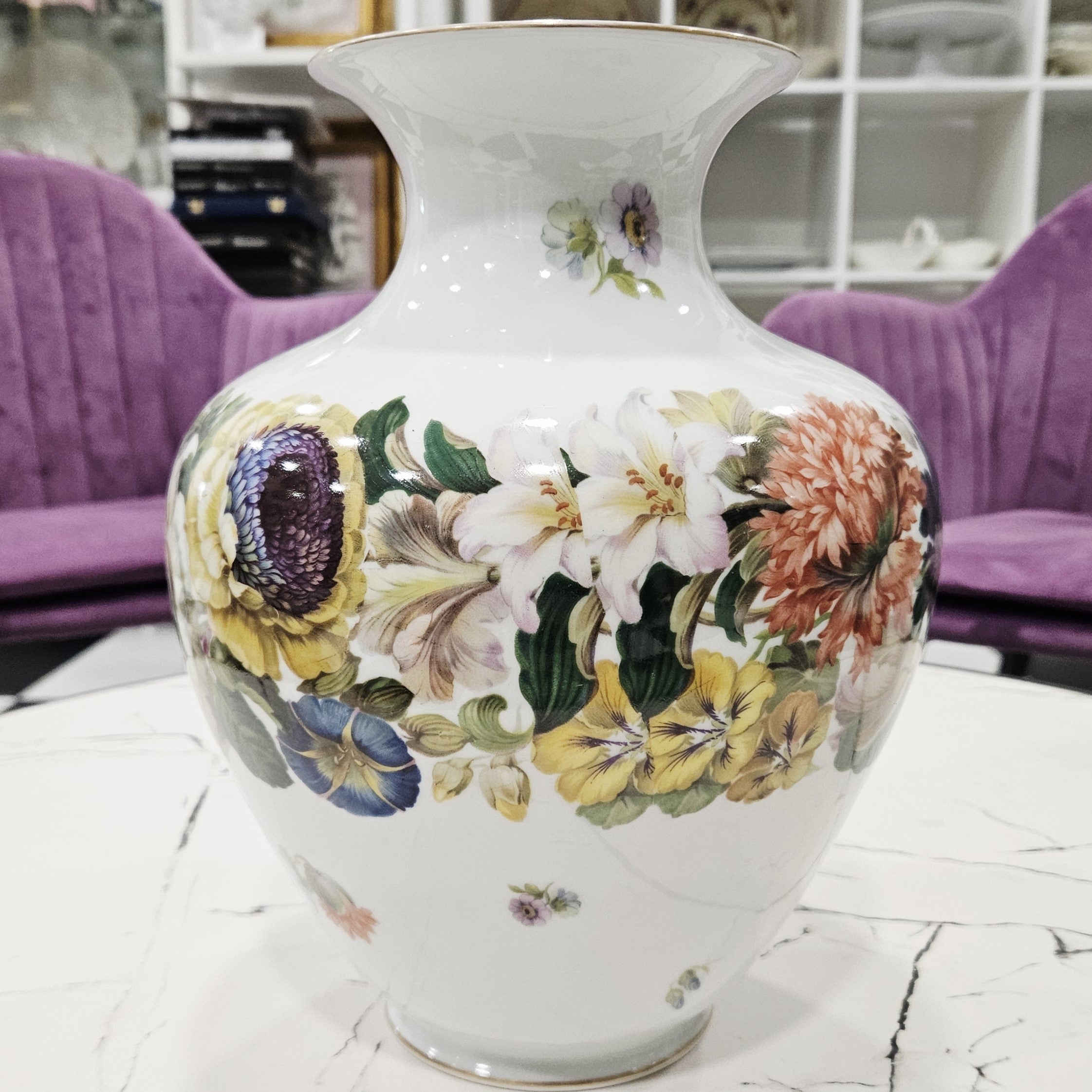 Eine Thomas Bavaria Porzellanvase von außergewöhnlicher Schönheit, verziert mit einer farbenprächtigen Blumengirlande, die zart mit goldenen Linien umrandet ist.Das weiße Porzellan und die hellen Farbtöne der Blumen verschmelzen harmonisch zu einer warmen und romantischen Ästhetik.