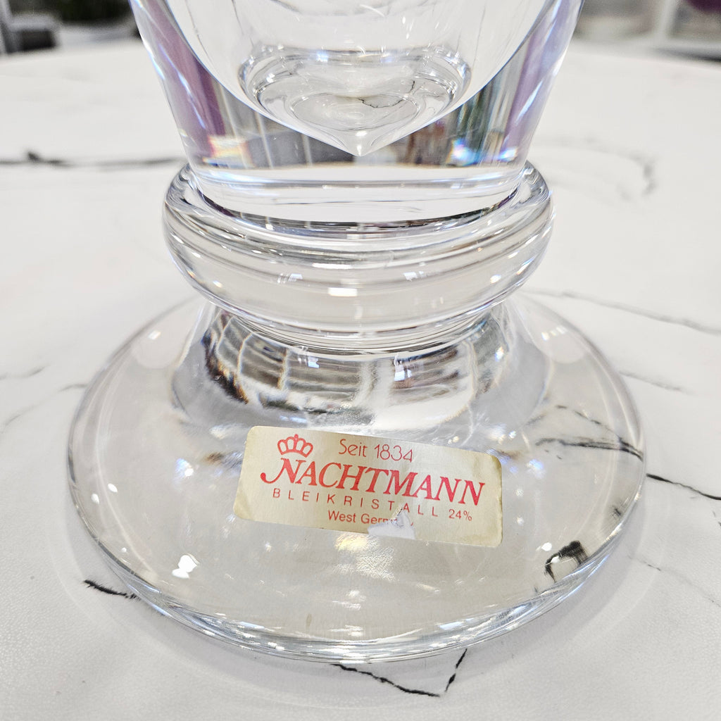 Elegante Nachtmann-Kristallvase aus 24%igem Bleikristall (Bleikristall). Die Vase hat eine ausdrucksstarke, transparente Form mit dekorativen Relieflinien, die das Licht subtil brechen und schimmernde Reflexe erzeugen.