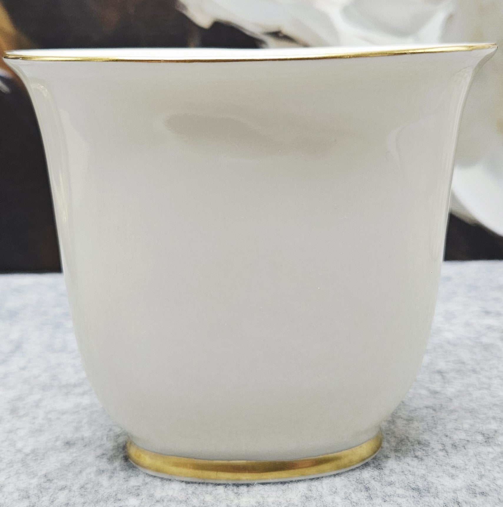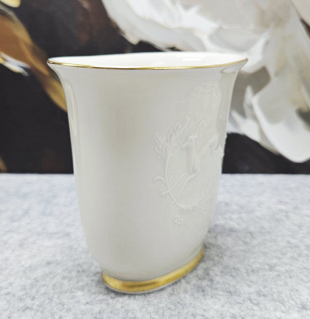 Kleine, klassisch geformte Porzellanvase mit goldenen Linien und einem reliefierten Tiermotiv.