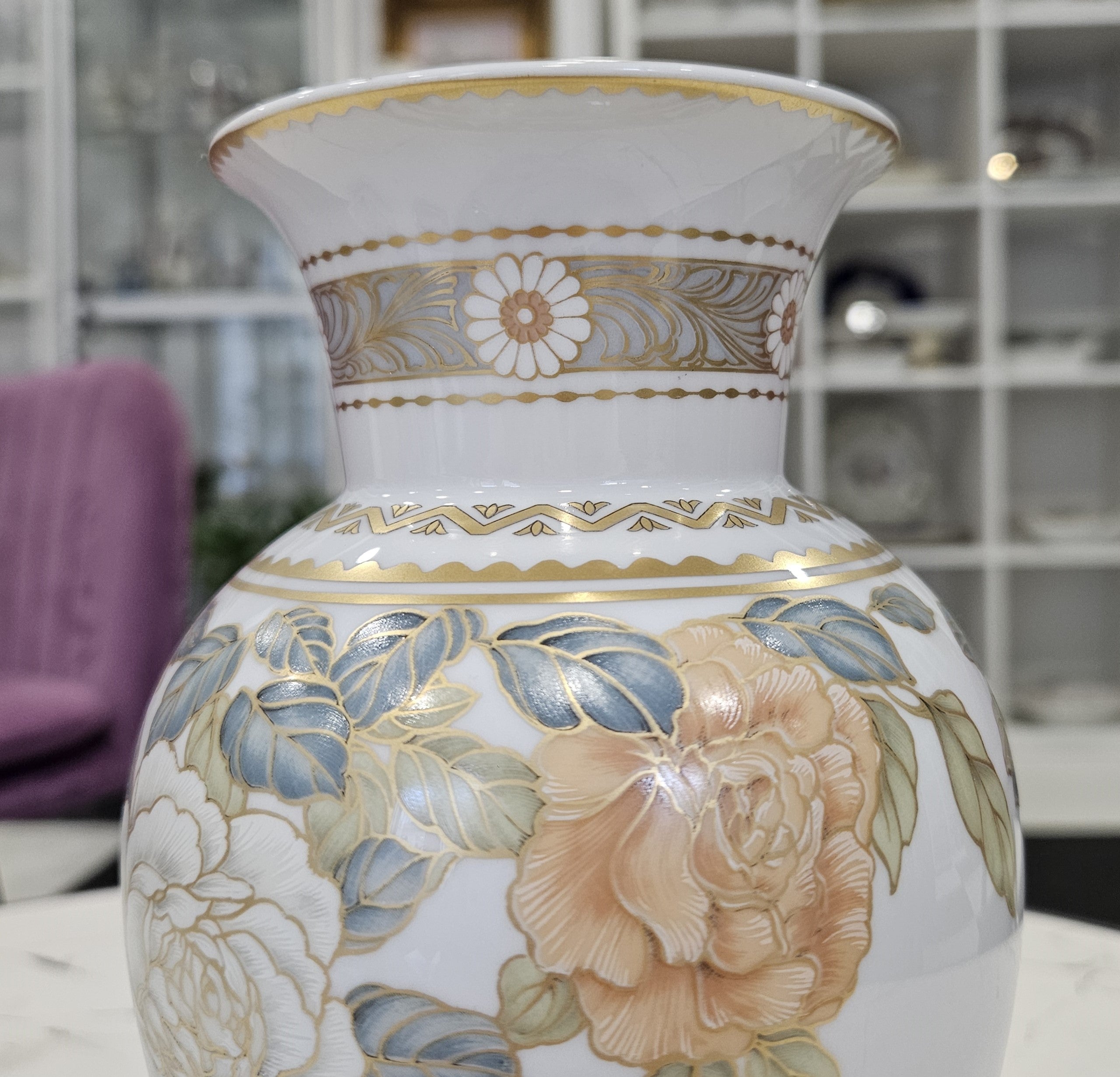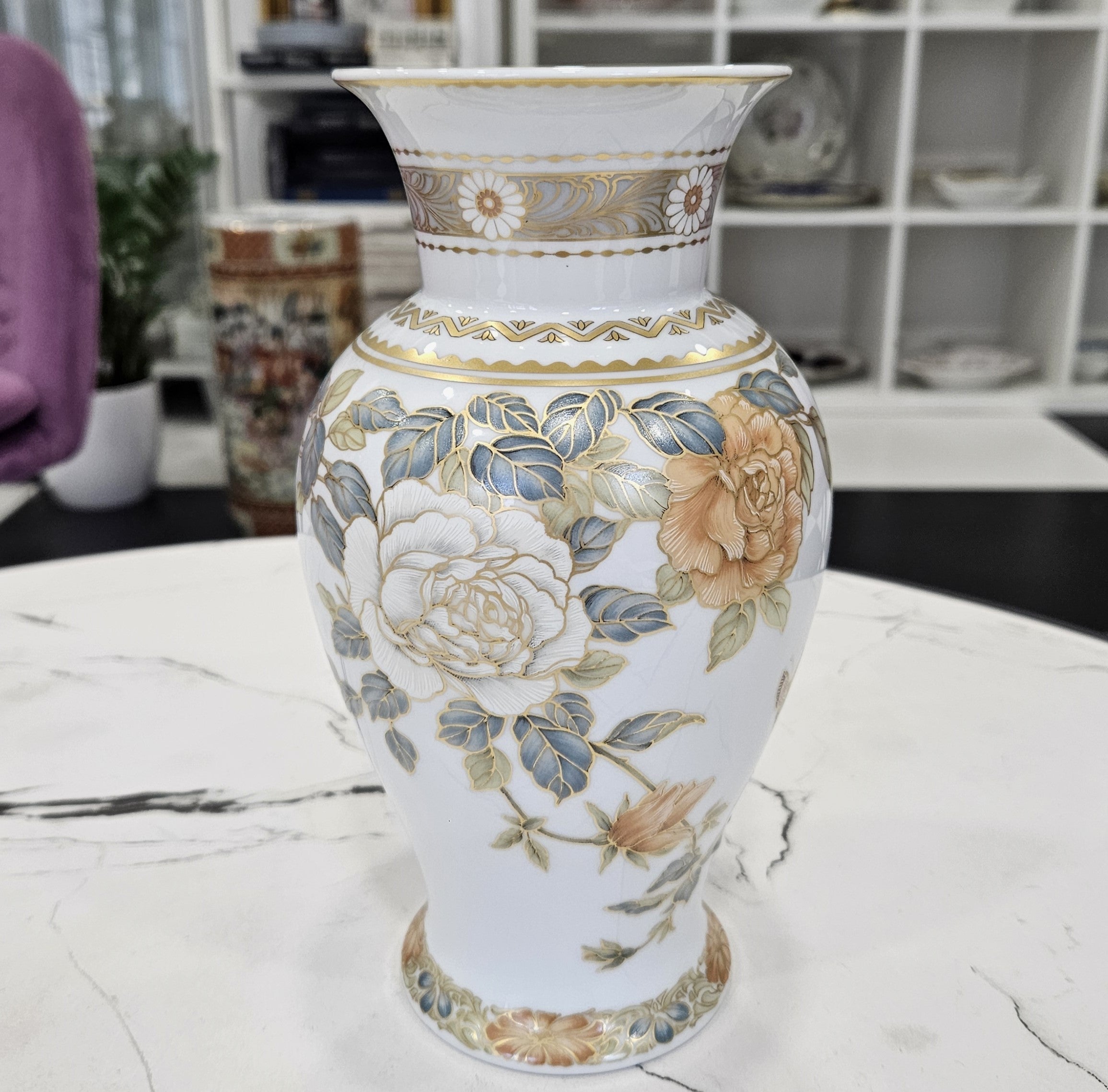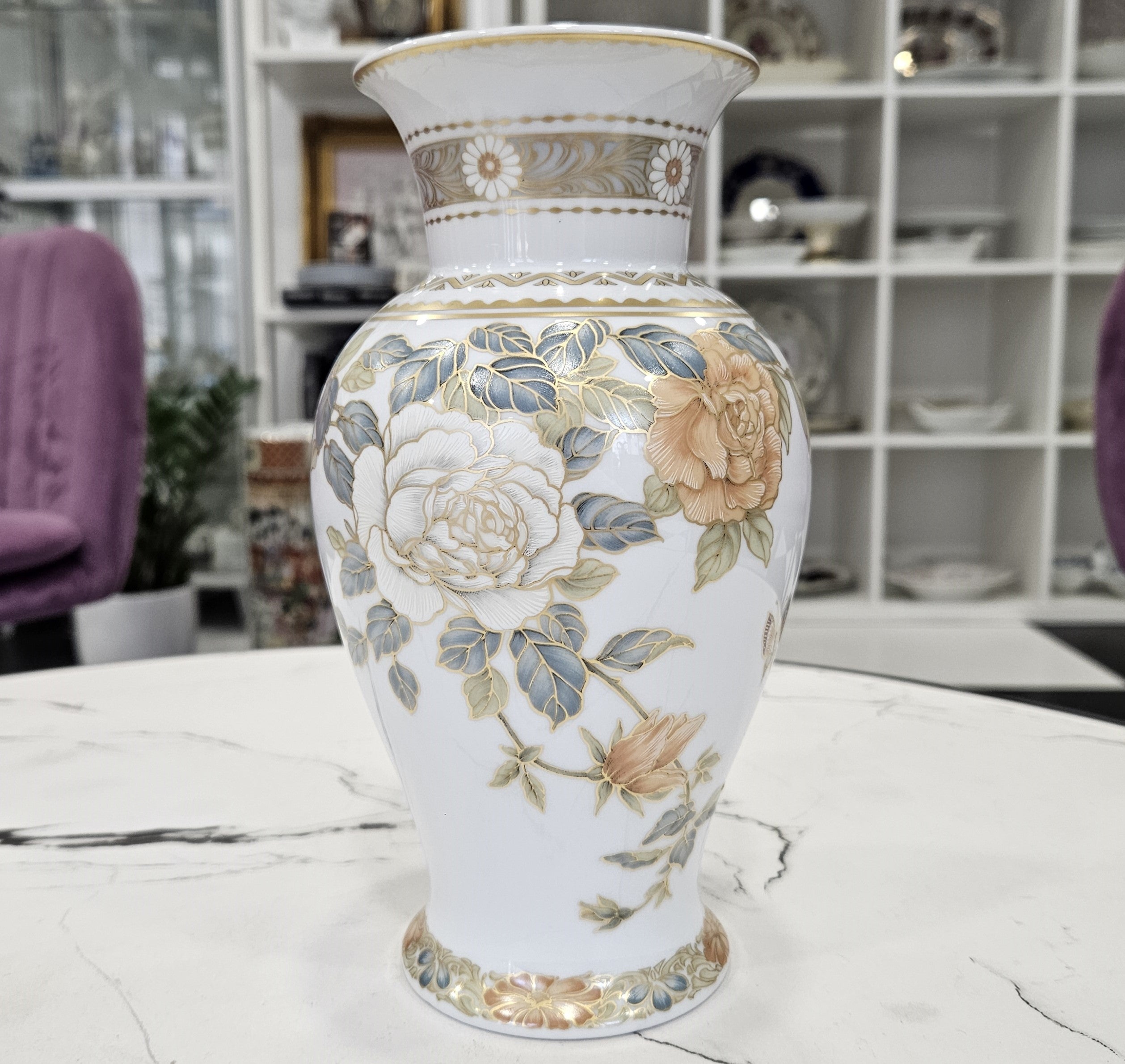 Die Porzellanvase Osaka ist eine außergewöhnlich schöne Porzellanvase, die von dem berühmten Designer Kurt Nossek in der deutschen Porzellanmanufaktur Kaiser entworfen wurde. Die Vase zeichnet sich durch ihre goldenen Ornamente, zarte Blumenkompositionen in einer Kombination aus sanften Pfirsich- und Weißtönen und den luxuriösen Glanz der Glasur aus.