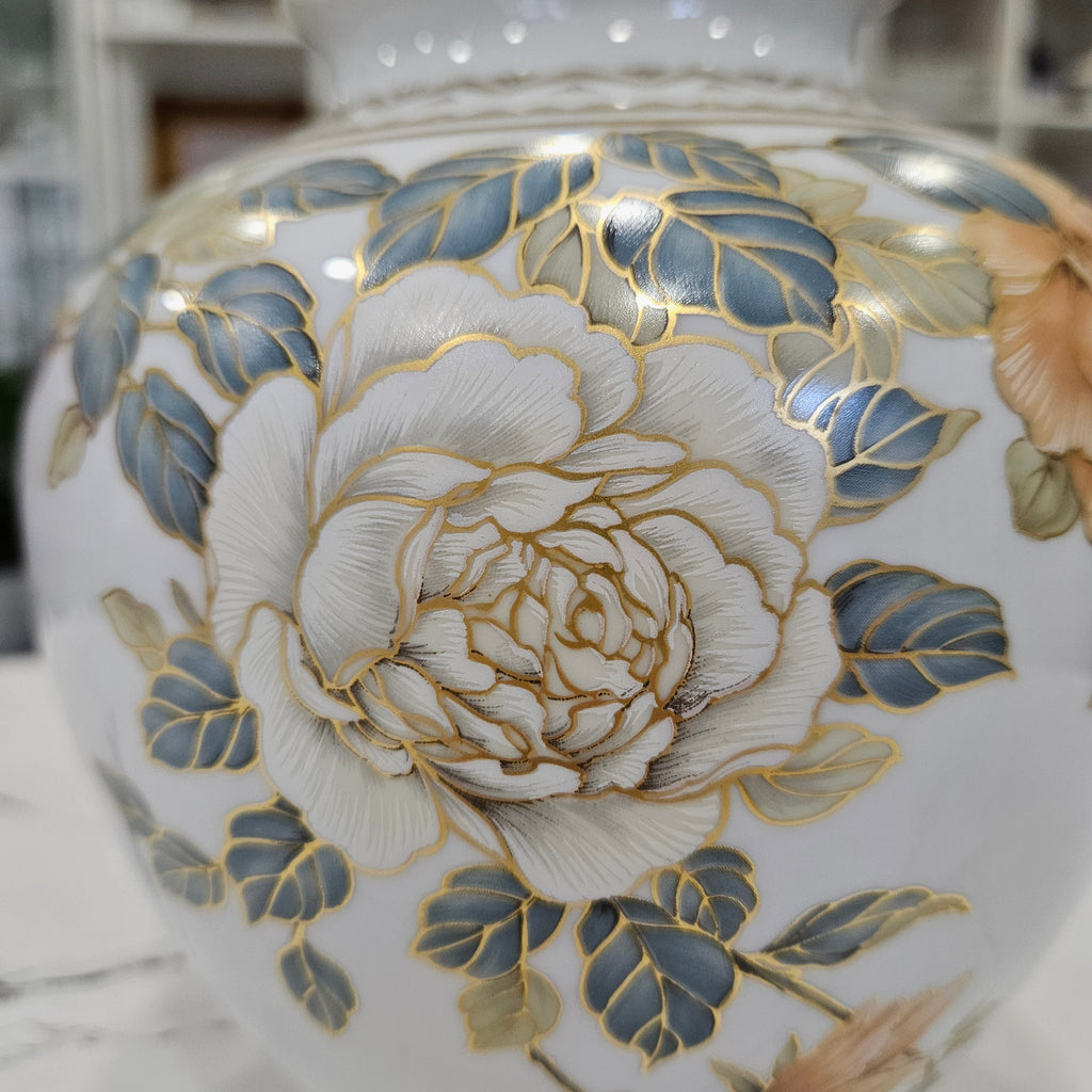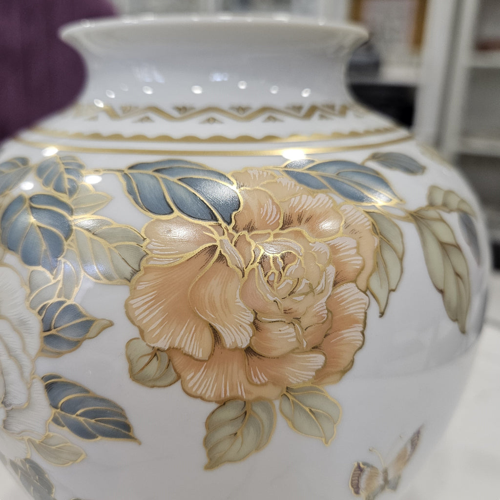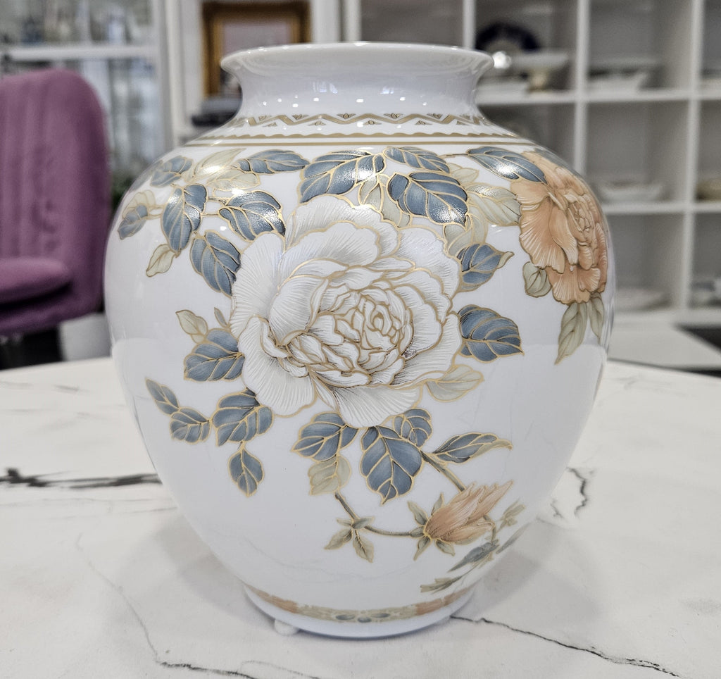 Die Porzellanvase Osaka ist eine außergewöhnlich schöne Porzellanvase, die von dem berühmten Designer Kurt Nossek in der deutschen Porzellanmanufaktur Kaiser entworfen wurde. Die Vase zeichnet sich durch ihre goldenen Ornamente, zarte Blumenkompositionen in einer Kombination aus sanften Pfirsich- und Weißtönen und den luxuriösen Glanz der Glasur aus.