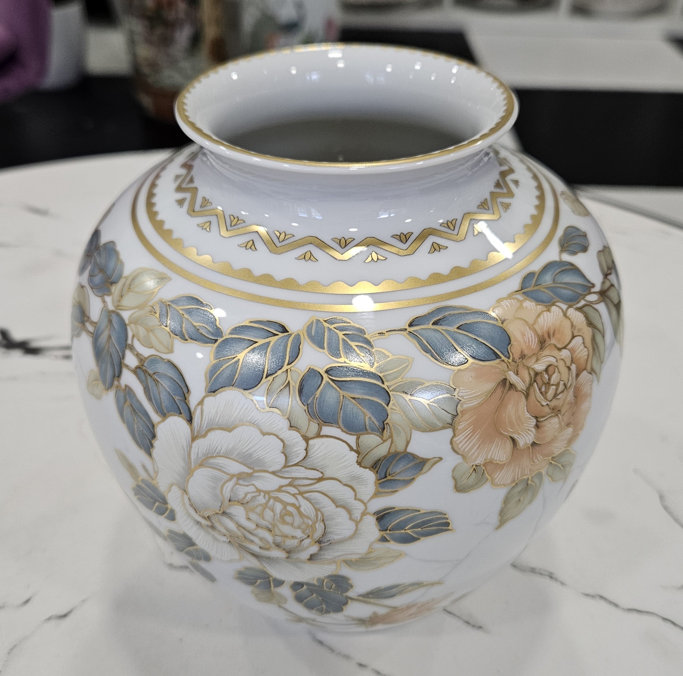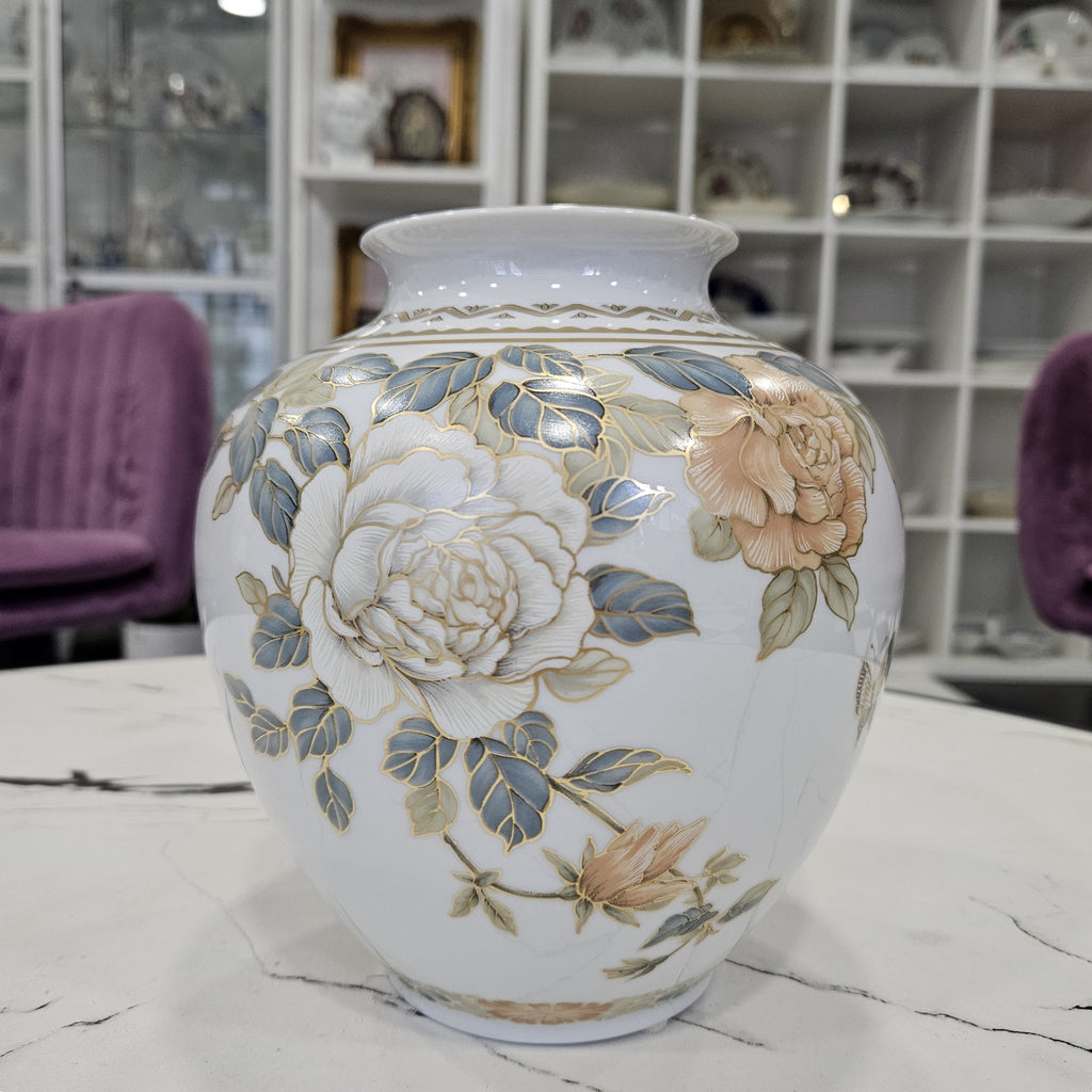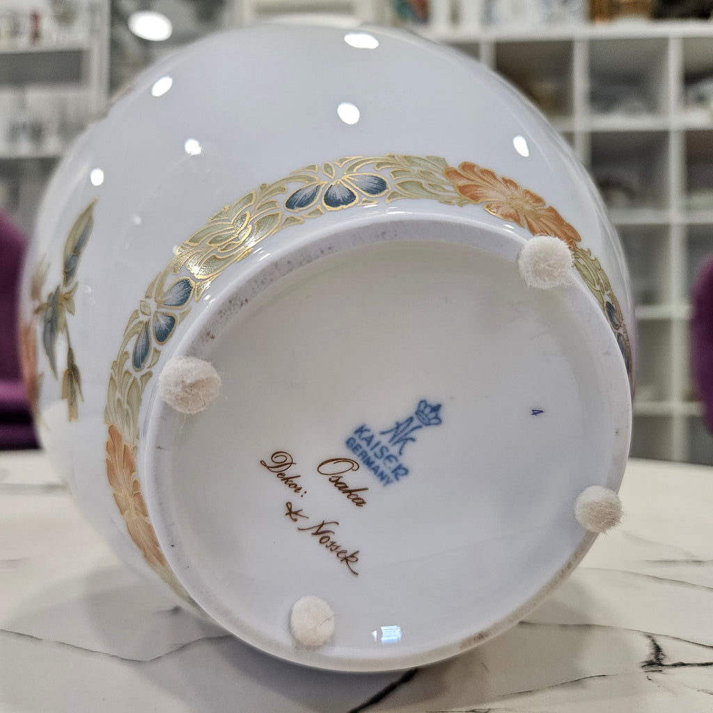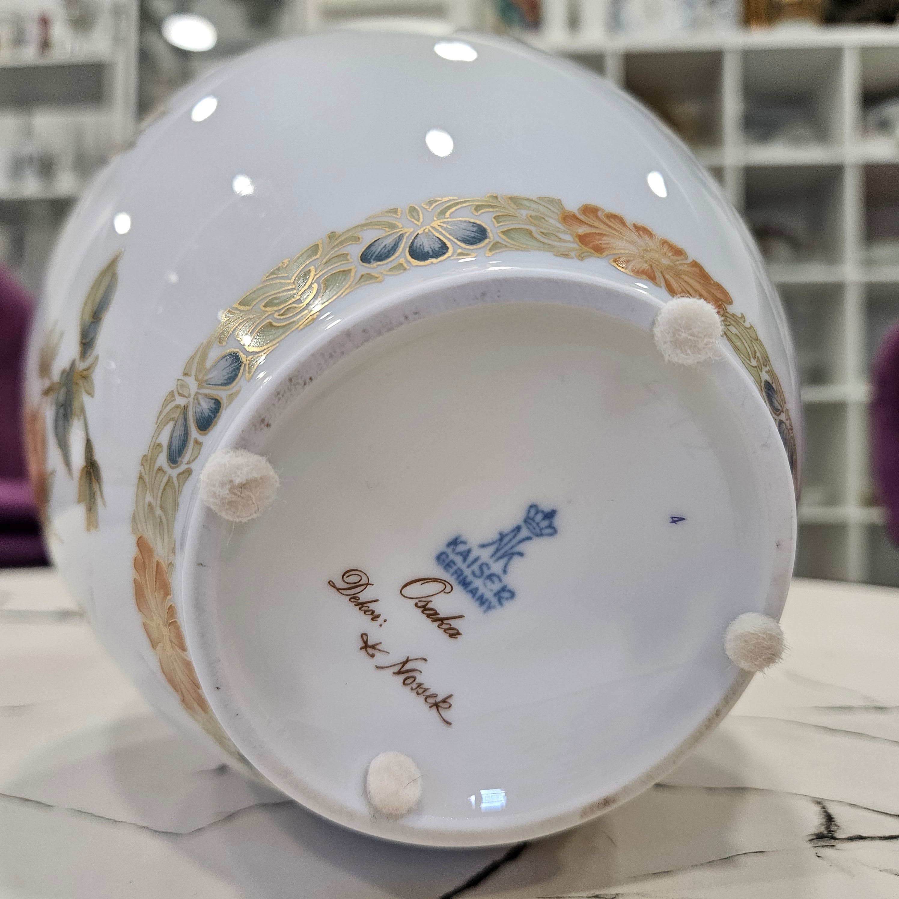 Die Porzellanvase Osaka ist eine außergewöhnlich schöne Porzellanvase, die von dem berühmten Designer Kurt Nossek in der deutschen Porzellanmanufaktur Kaiser entworfen wurde. Die Vase zeichnet sich durch ihre goldenen Ornamente, zarte Blumenkompositionen in einer Kombination aus sanften Pfirsich- und Weißtönen und den luxuriösen Glanz der Glasur aus.
