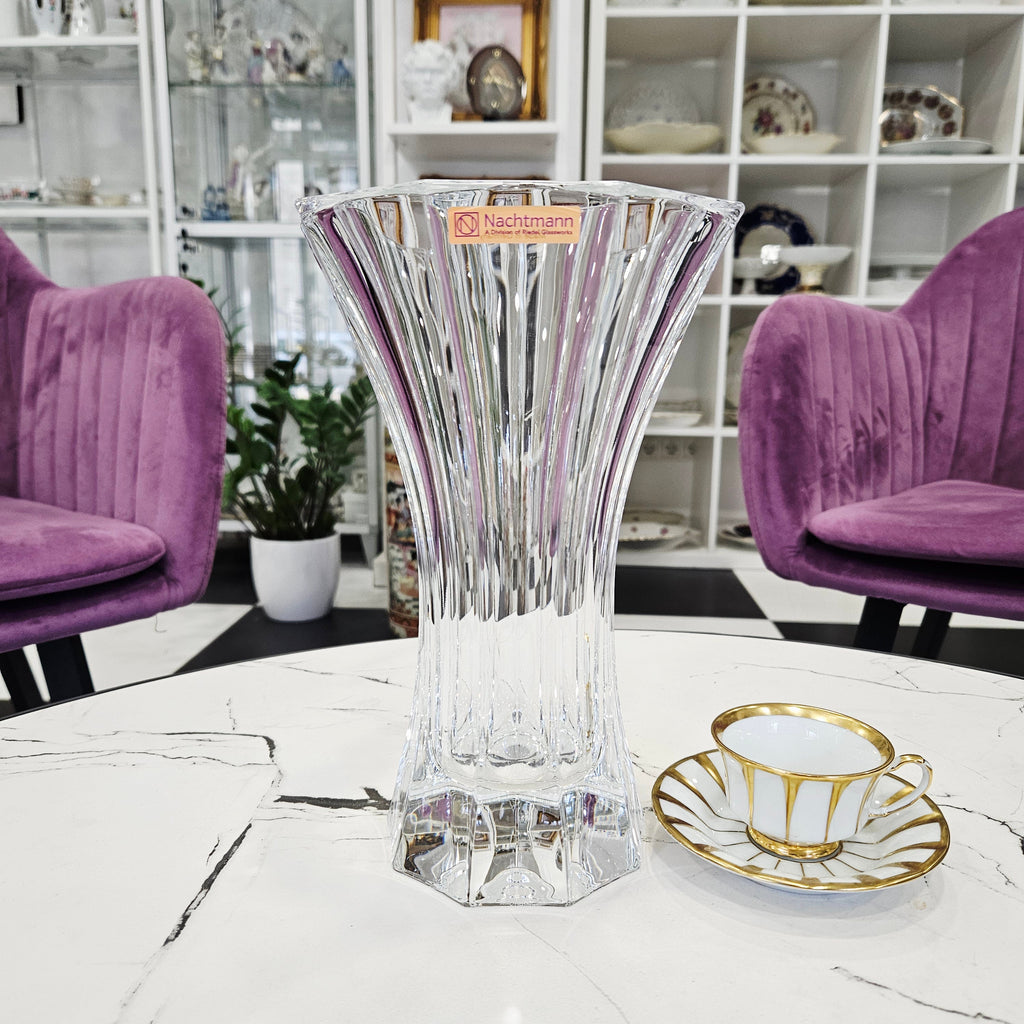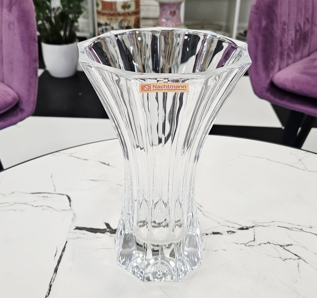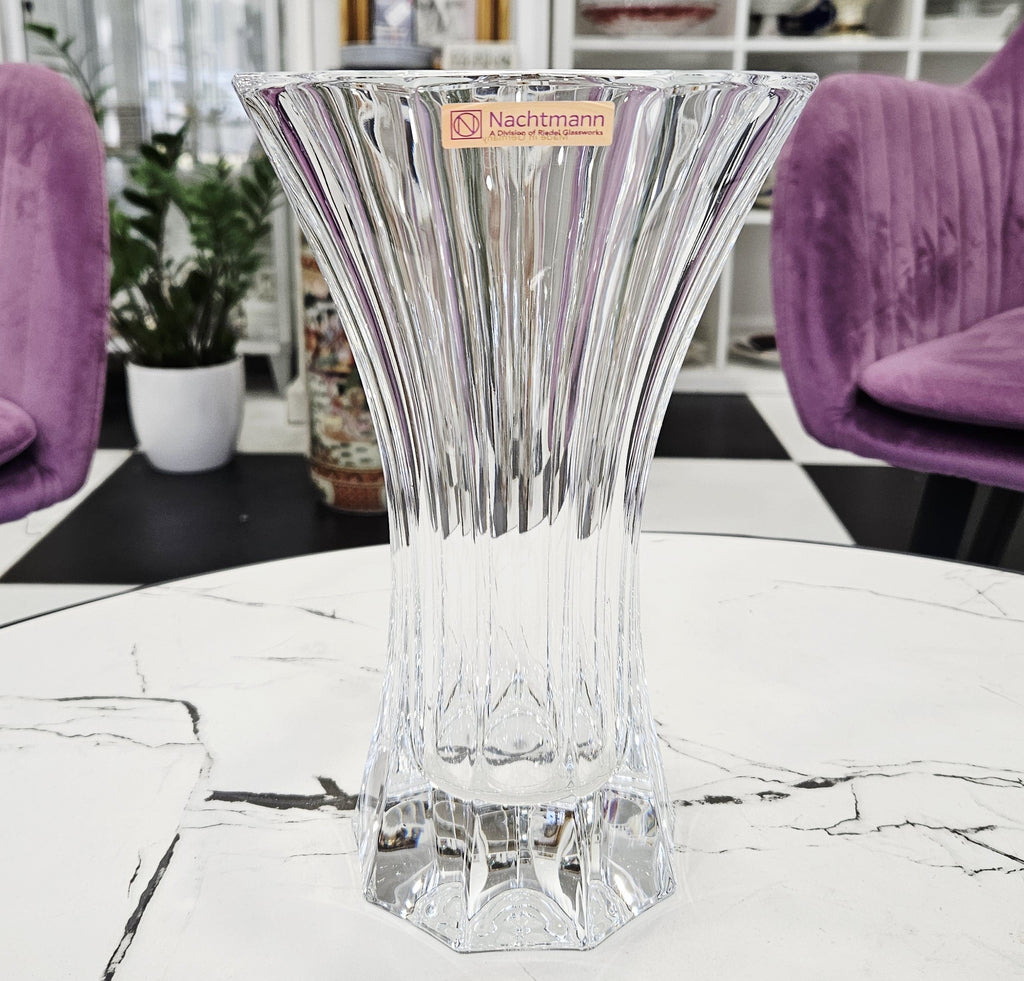 Moderne und eleganteNachtmann Kristallvase aus hochwertigem klarem Kristall. Das Design zeichnet sich durch vertikale Ränder aus, die das Licht auf subtile Weise brechen und der Vase ihren außergewöhnlichen Glanz und ihre raffinierte Form verleihen. Die klassische Form, die sich nach oben hin verbreitert, eignet sich sowohl für einzelne Blumen als auch für größere Sträuße.