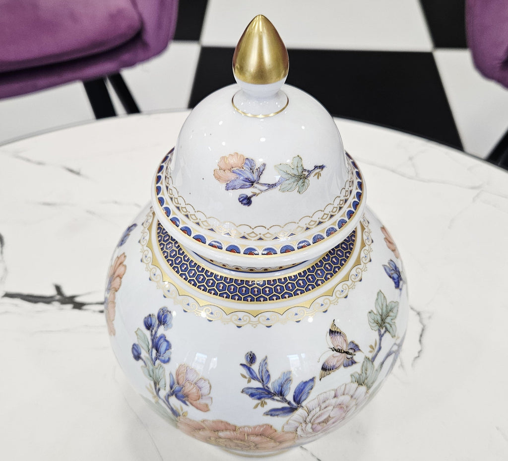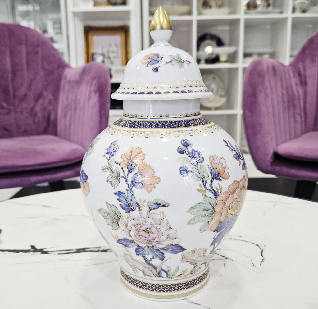 Derartige Deckelvasen stammen aus der Antike, wo sie als Zeichen von erlesenem Geschmack und Luxus galten. In der Antike schmückten diese Gefäße nicht nur Räume, sondern hatten auch eine praktische Funktion: Sie dienten zur Aufbewahrung von Duftmischungen, kostbaren Ölen oder Blütenblättern. Später, im 17. und 19. Jahrhundert, griffen die europäischen Porzellanmanufakturen diese Form auf und machten sie zu einem unverwechselbaren dekorativen Akzent und einem Statussymbol. Der Deckel bot nicht nur Schutz, sondern auch eine besondere Eleganz, und dieses Detail ist ein Attribut der klassischen Ästhetik geblieben, das die Exklusivität und die Verbindung zur Geschichte betont.