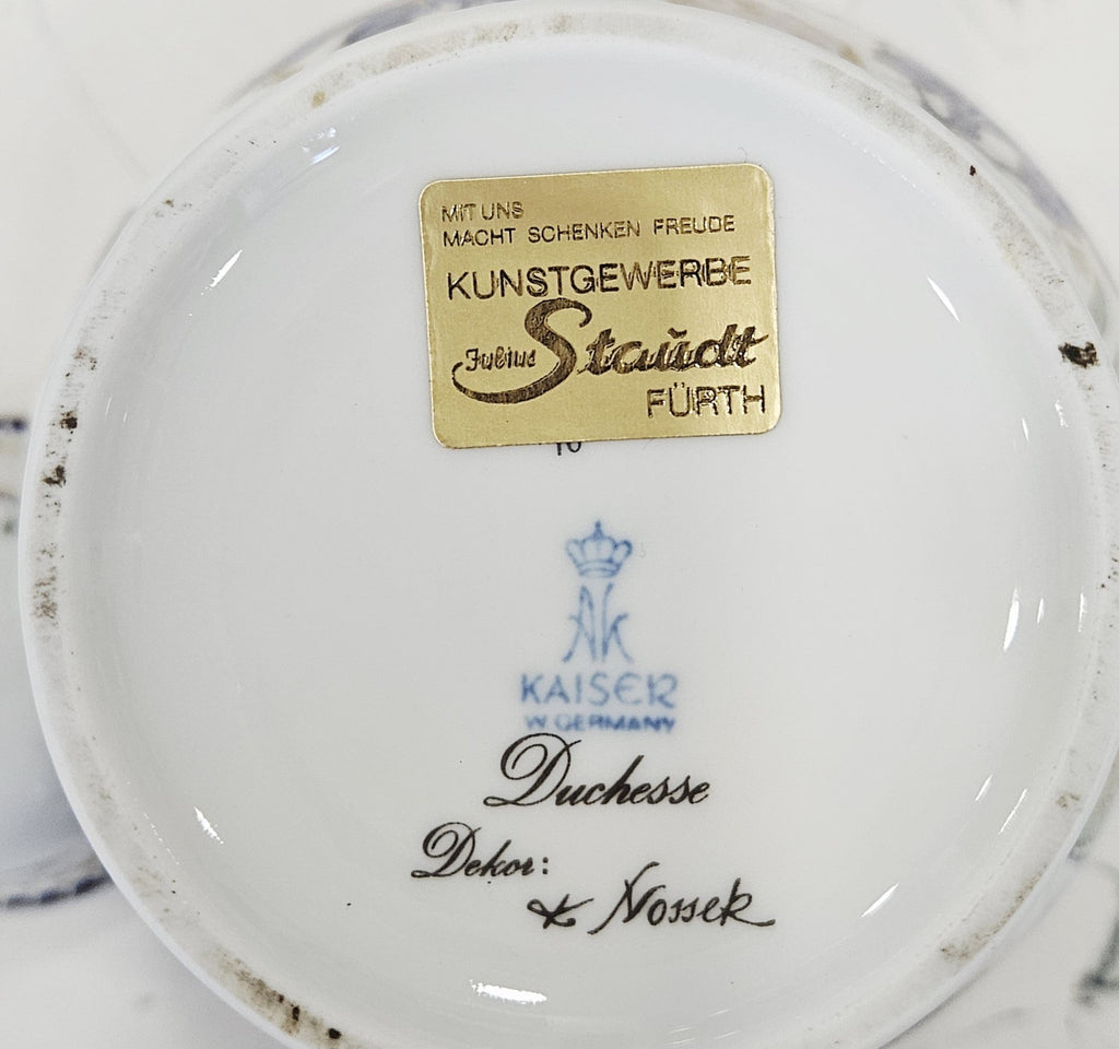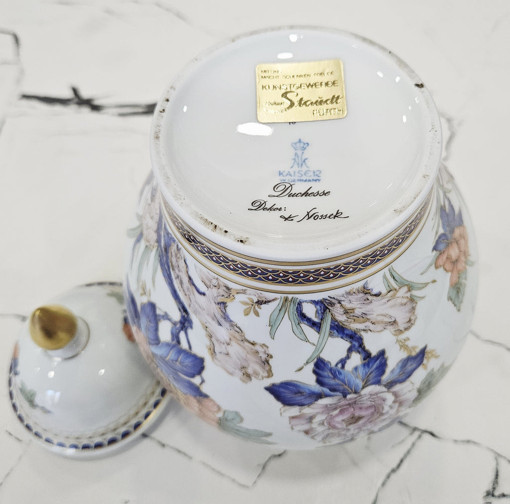 Luxuriöse Porzellanvase mit Deckel, hergestellt in der Kaiser Porzellan Manufaktur, Deutschland. Modell Duchesse, dekoriert von K. Nossek. Die Vase zeichnet sich durch ihre raffinierte klassische Form und ihr beeindruckendes polychromes Blumendekor aus Rosen, Pfingstrosen, blauen Blumen und zarten Schmetterlingsakzenten aus. Die Pastellfarben Rosa, Violett und Blau mit goldenen Akzenten sorgen für ein elegantes und harmonisches Erscheinungsbild.