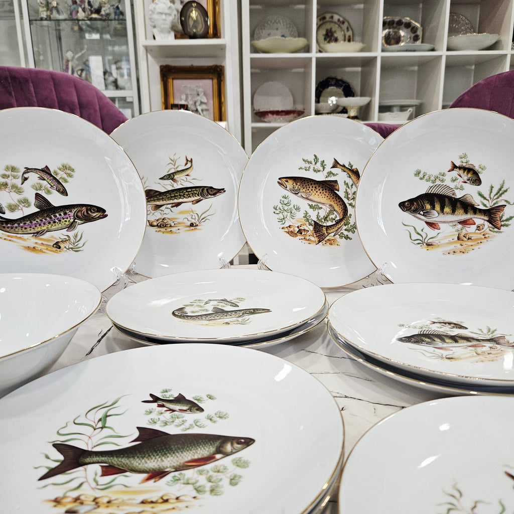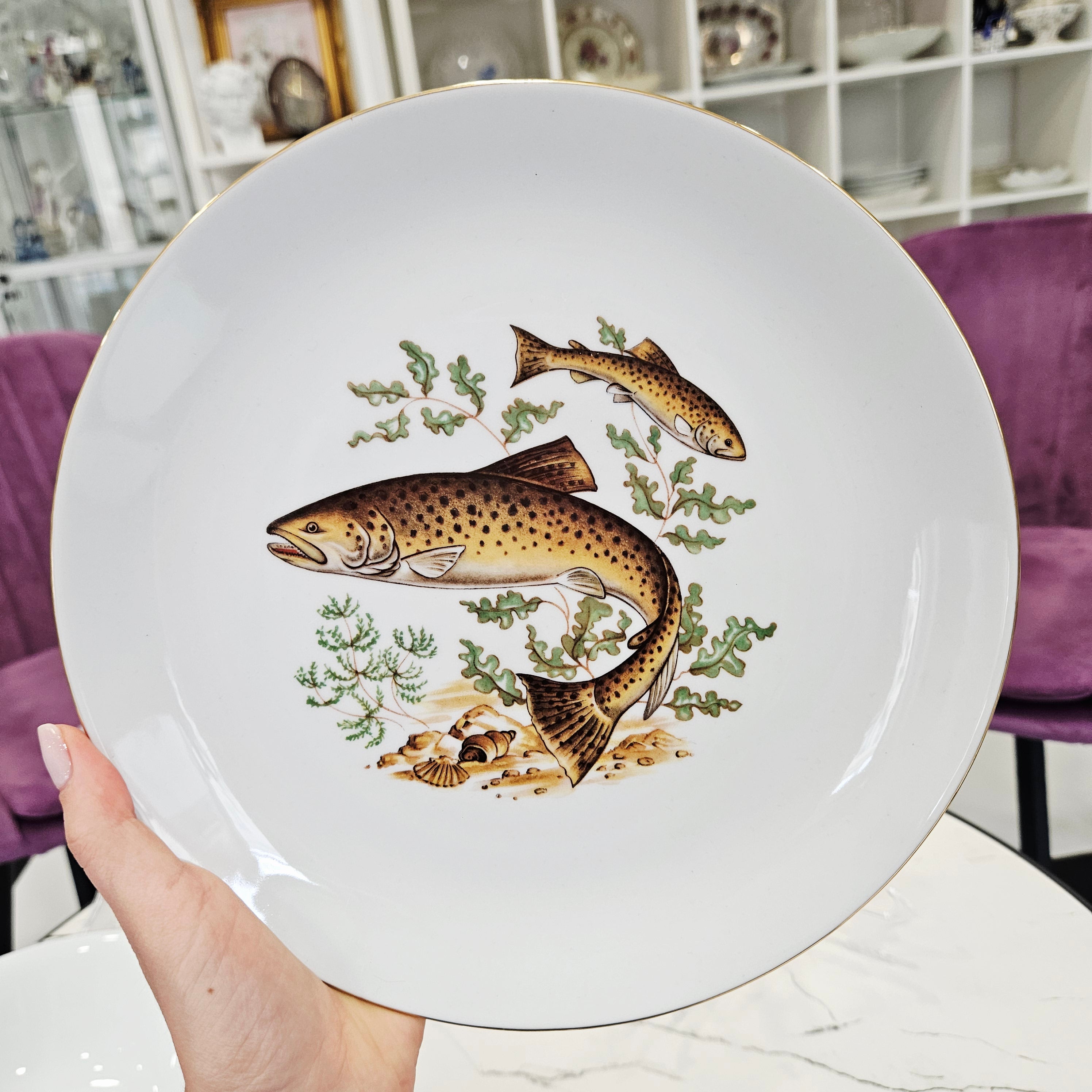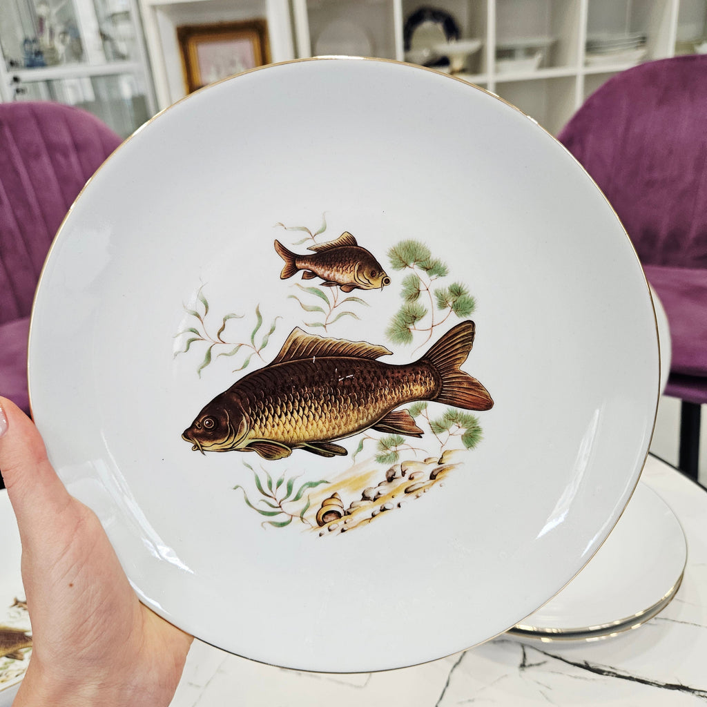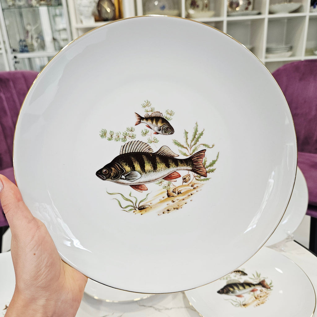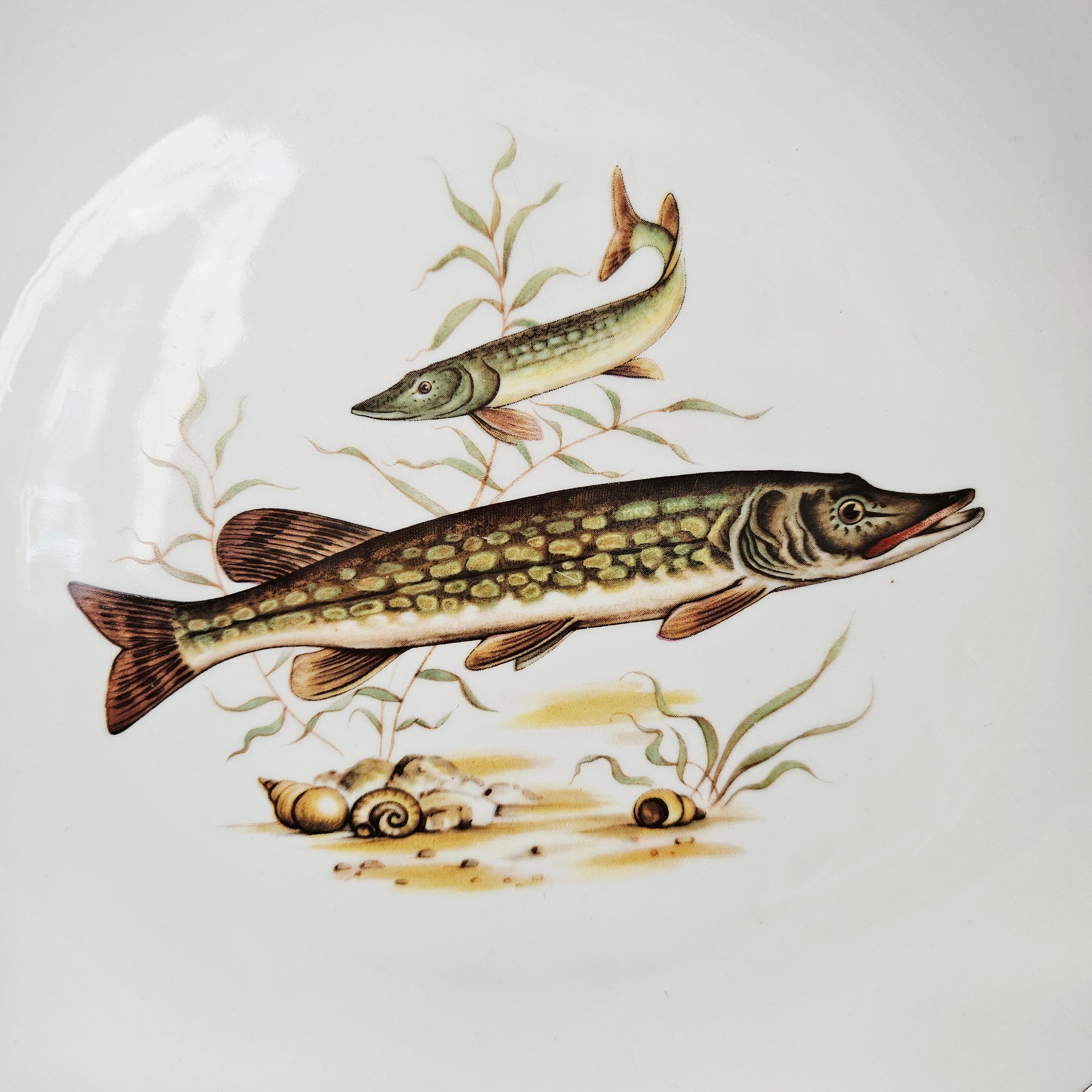 Jeder Teller ist mit realistischen Darstellungen verschiedener Süßwasserfischarten wie Hecht, Barsch, Brasse, Forelle, Karausche, Koi und anderen verziert. Die farbenfrohen Zeichnungen zeigen die natürlichen Schattierungen der Fische und die Details der Unterwasservegetation.