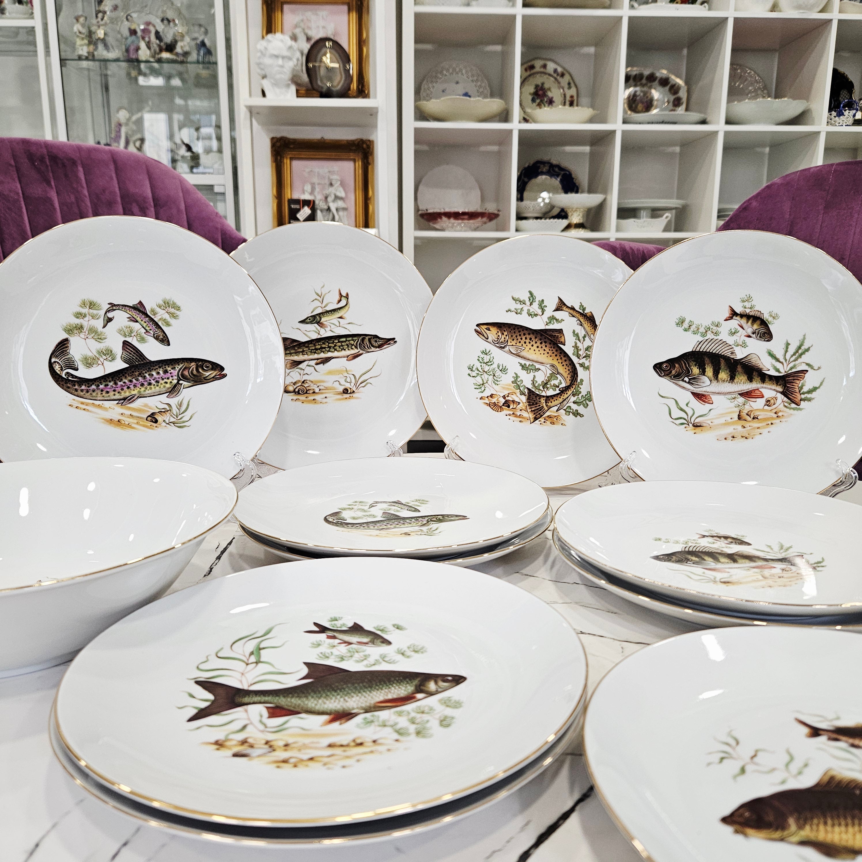 Die goldene Umrandung verleiht diesem Service einen subtilen Luxus, während das glatte weiße Porzellan die detaillierte Kunst der Dekoration zur Geltung bringt. Eine außergewöhnliche Wahl für Liebhaber des Fischfangs oder Sammler, die klassisches bayerisches Porzellan mit einem thematischen Dekor suchen.