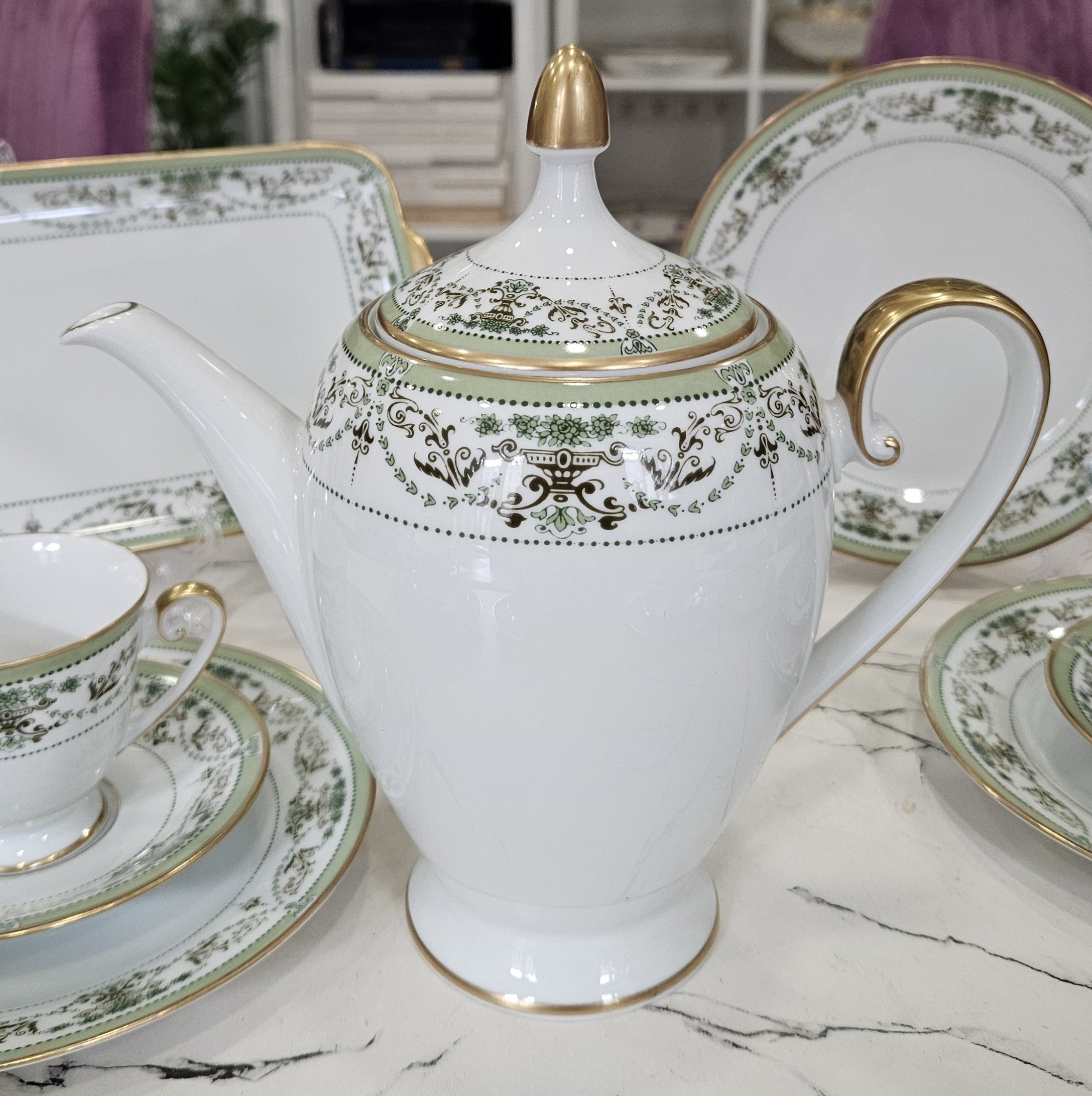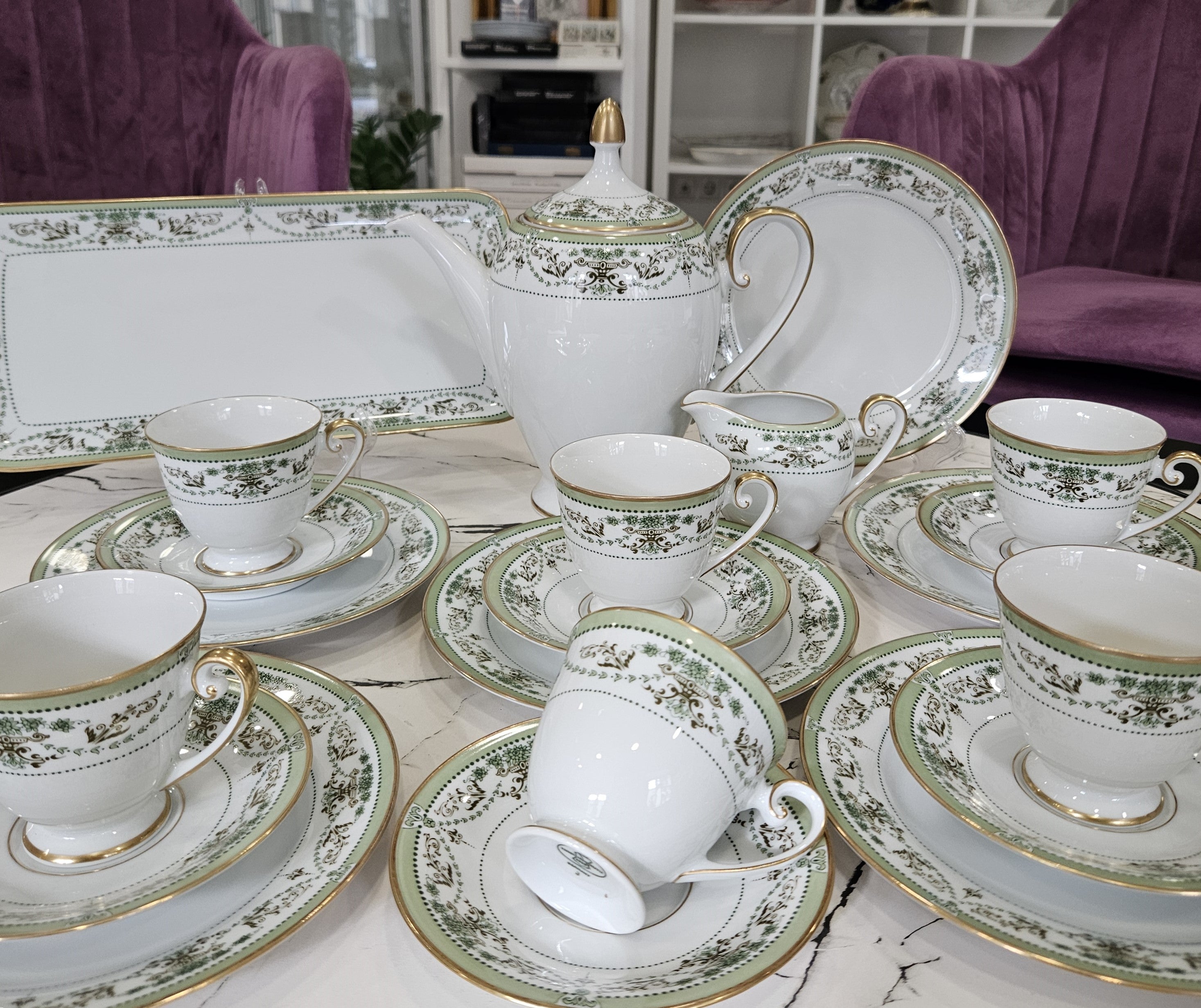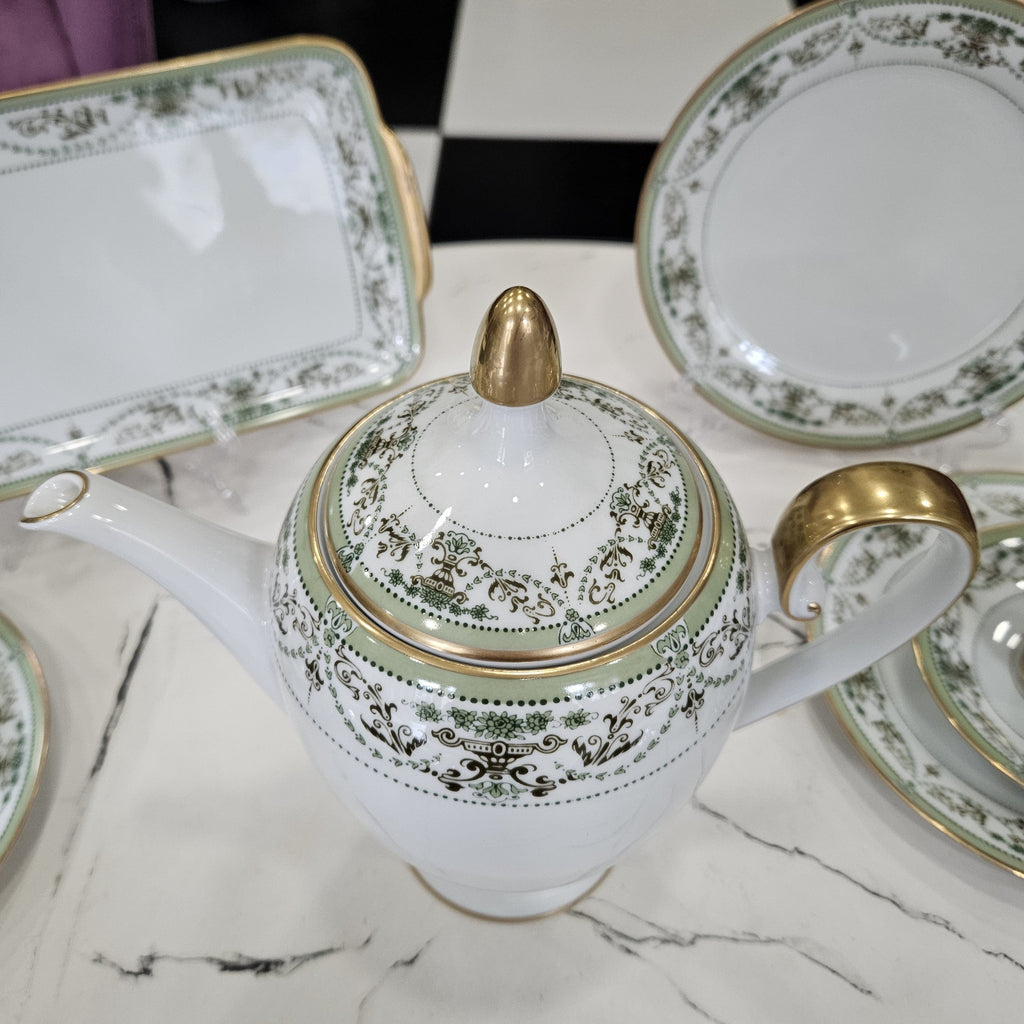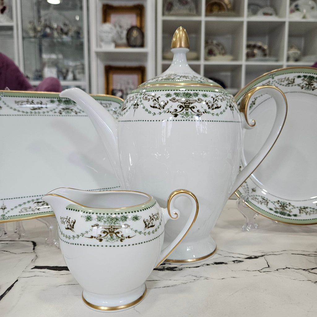 Elegantes Kaffee-/Teeservice aus Tirschenreuther Porzellan von 1838 von außergewöhnlicher Schönheit. Der weiße Porzellanhintergrund ist mit zarten grünen Ornamenten und goldenen Akzenten verziert und verleiht dem Set ein luxuriöses und raffiniertes Aussehen.