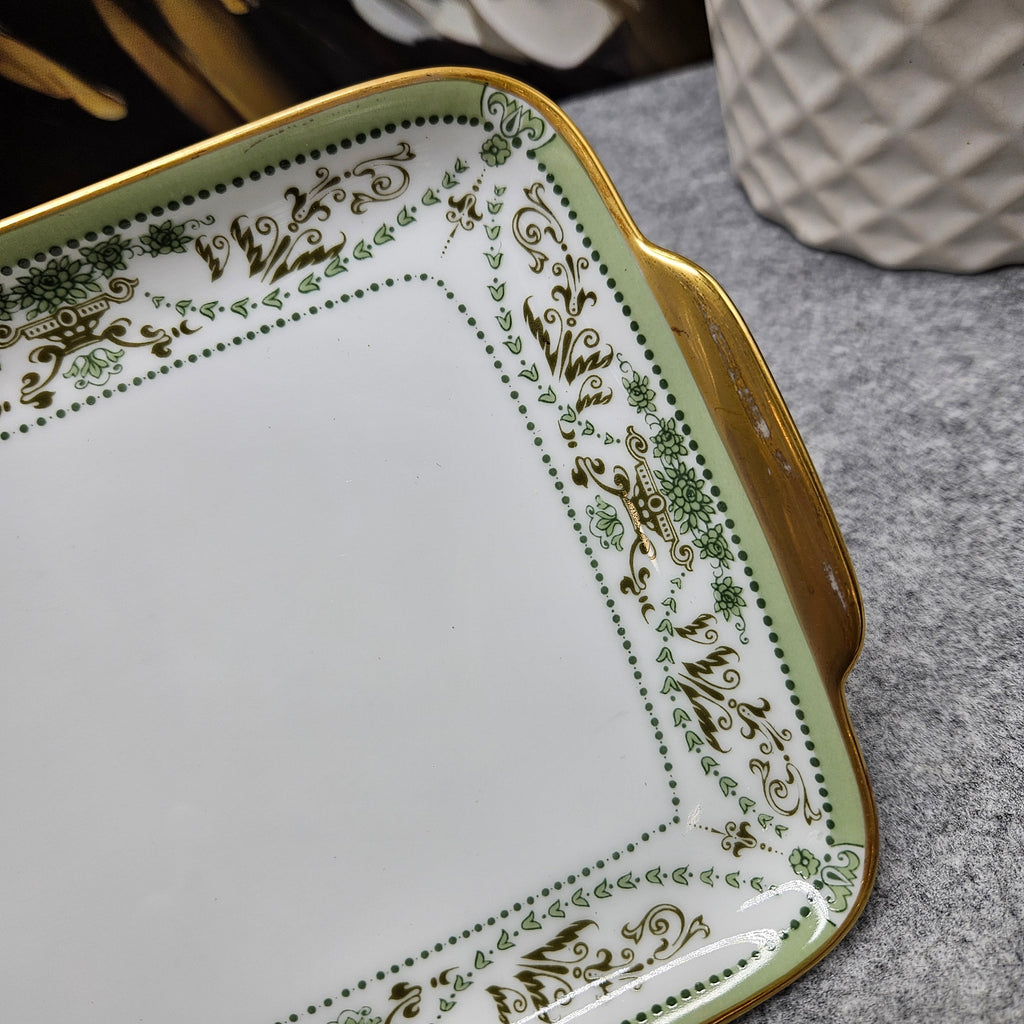 Sehr guter Zustand. Keine Chips oder Risse. Minimales Verblassen der Goldverzierung an den Griffen des Tabletts (siehe Fotos).