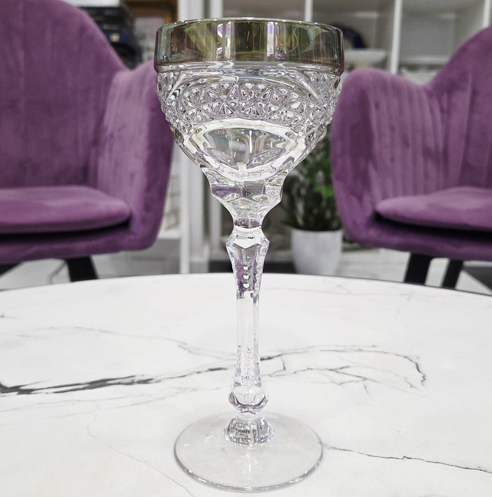 Der Kelch ist aus hochwertigem , echtem Bleikristall mit mehr als 24% PbO gefertigt und mit einem tiefen, präzisen Brillantschliff verziert, der ein funkelndes Lichtspiel erzeugt und die Klarheit und Farbintensität des Kristalls betont.