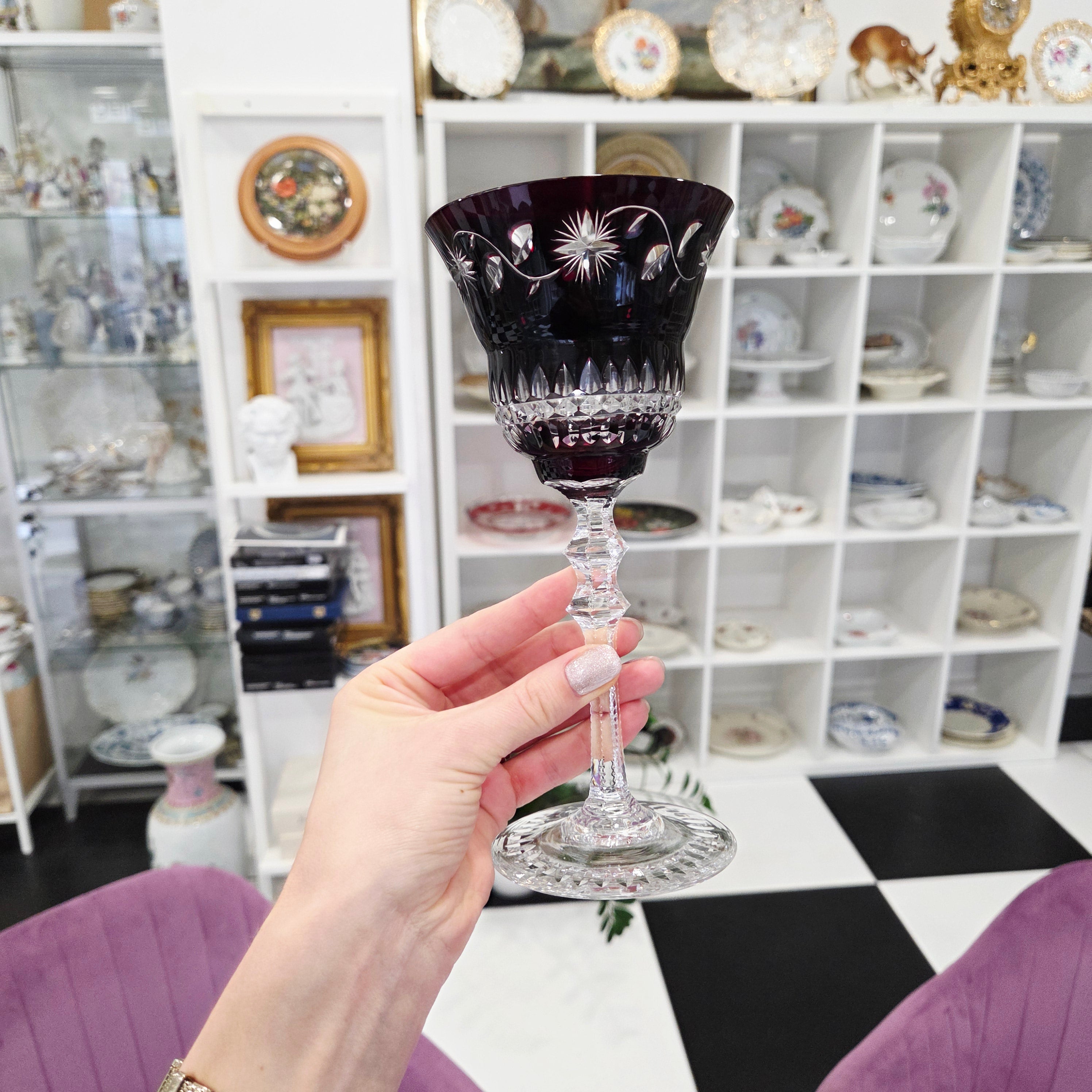 Ein außergewöhnlicher, handgefertigter Kristallkelch mit einem tiefen, satten, dunklen Kirsch-/Burgunderfarbton und einem eleganten, handgeschliffenen Dekor. Die Wände des Kelches sind mit zarten Stern- und Pflanzenmotiven verziert, die ihm einen raffinierten Glanz und eine aristokratische Ästhetik verleihen.