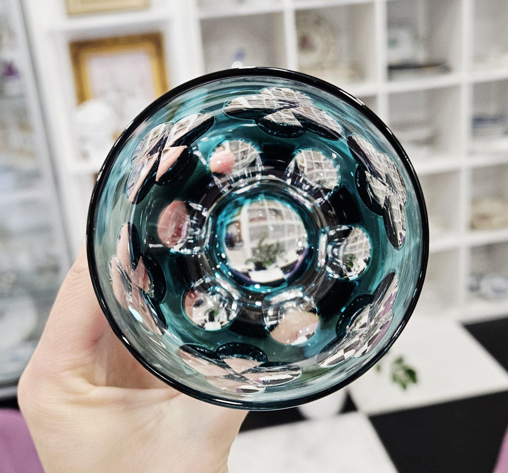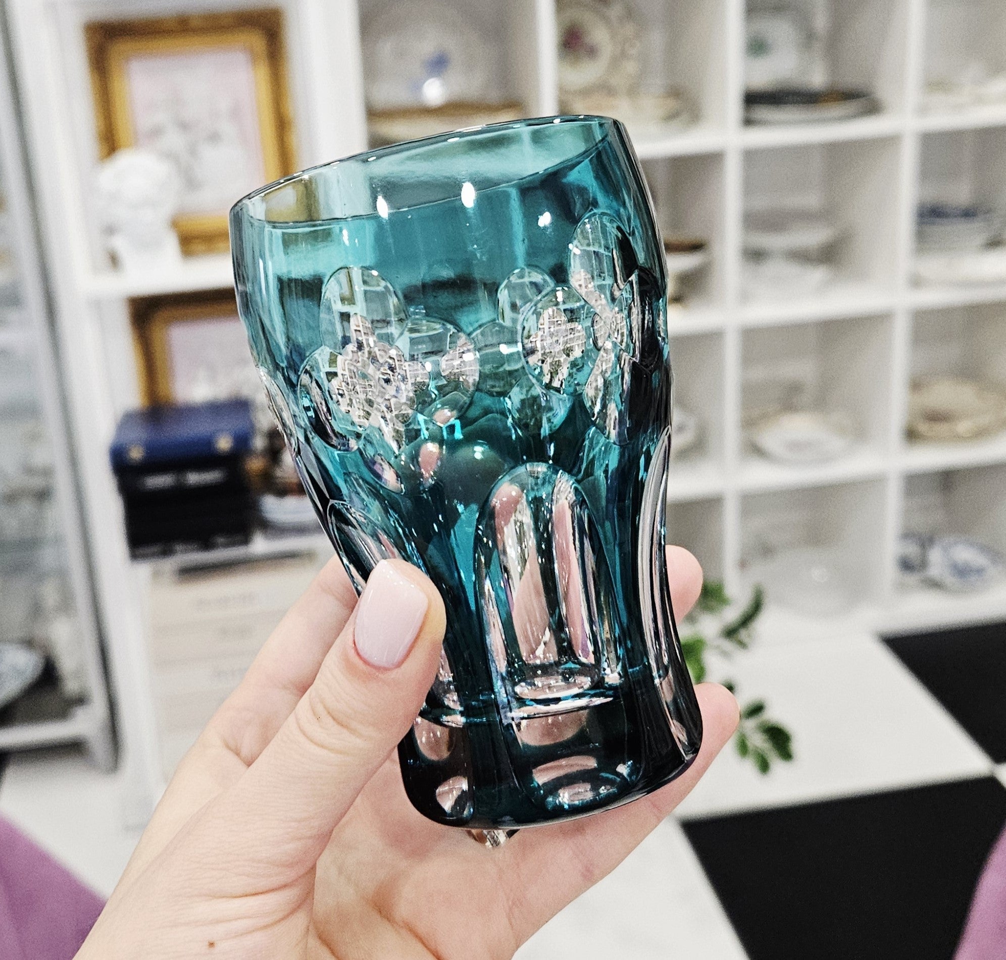 Ein luxuriöses Wasser-/Softdrinkglas aus BOHEMIA-Kristall, das sich durch seine türkise Farbe und seinen tiefen, handgeschliffenen Schliff auszeichnet. Die Kristallfenster erzeugen ein spektakuläres Lichtspiel, während die dekorativen Muster der Form des Bechers Eleganz und klassische böhmische Opulenz verleihen.