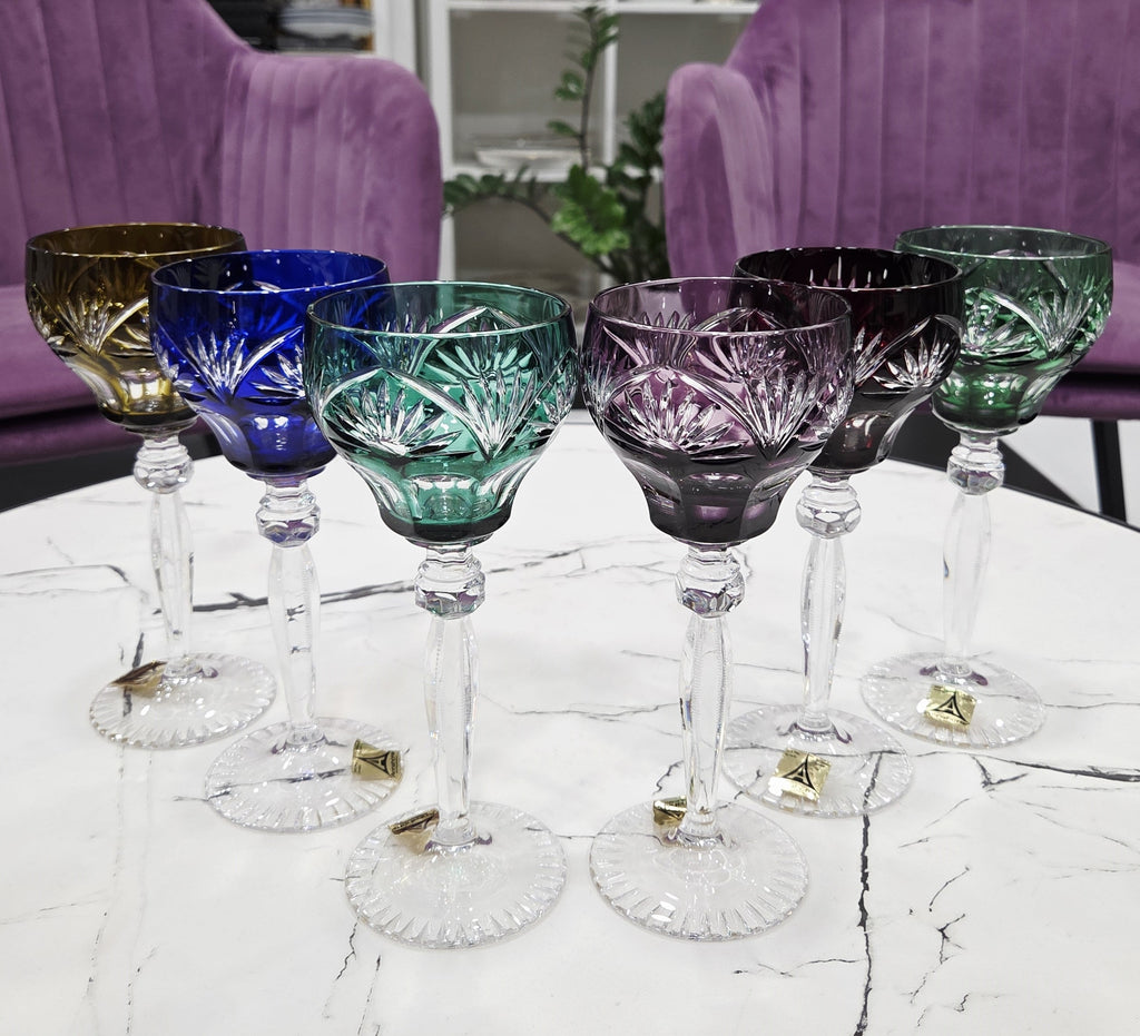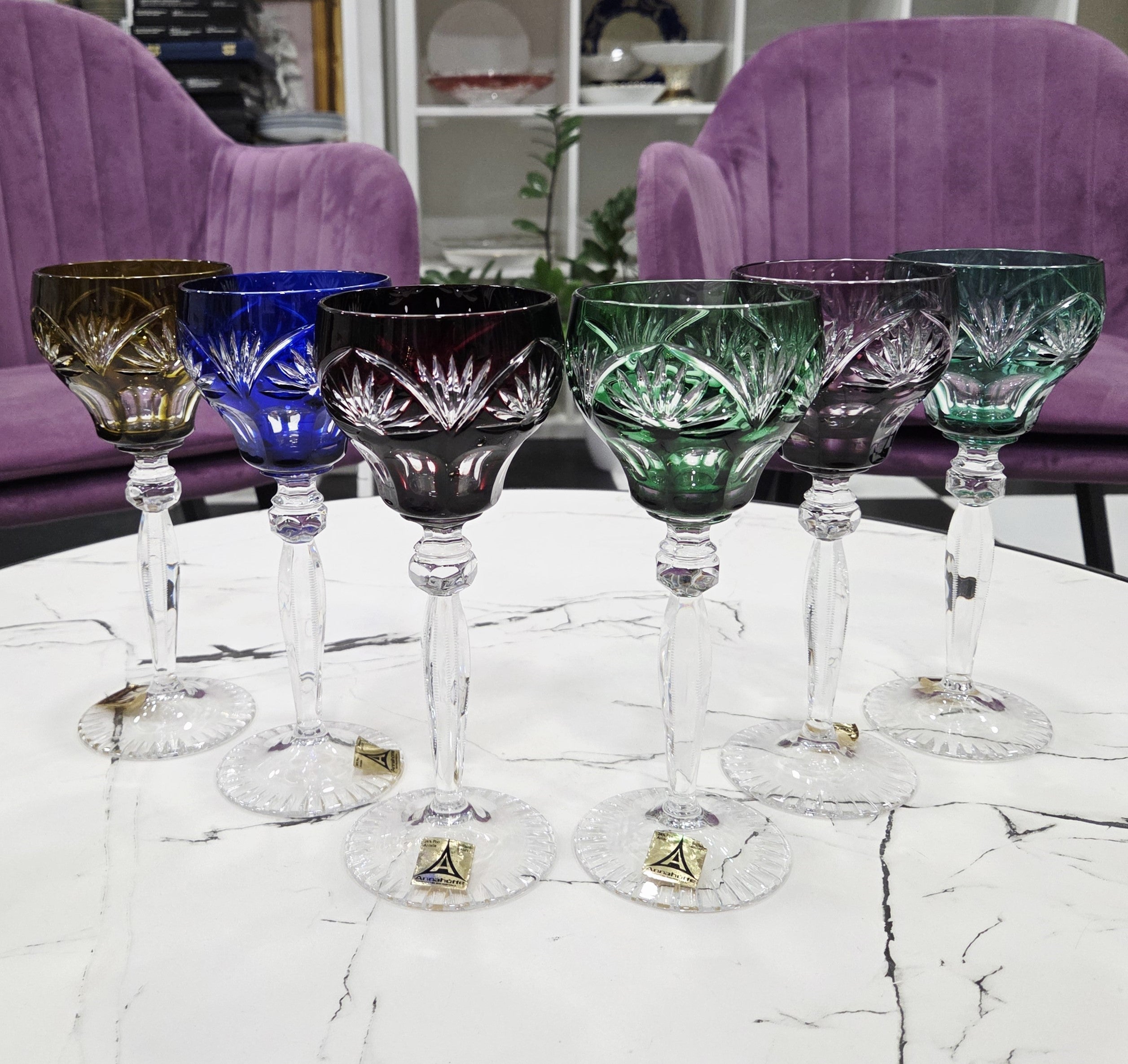 Das Set besteht aus 6 farbigen Weingläsern, jedes in einem einzigartigen Farbton: tiefblau, grün, violett, rubinrot, fliederfarben und oliv. Die farbenfrohen Teile der Schale harmonieren mit den transparenten, elegant geprägten Füßen und den dekorativen, massiven Sockeln.