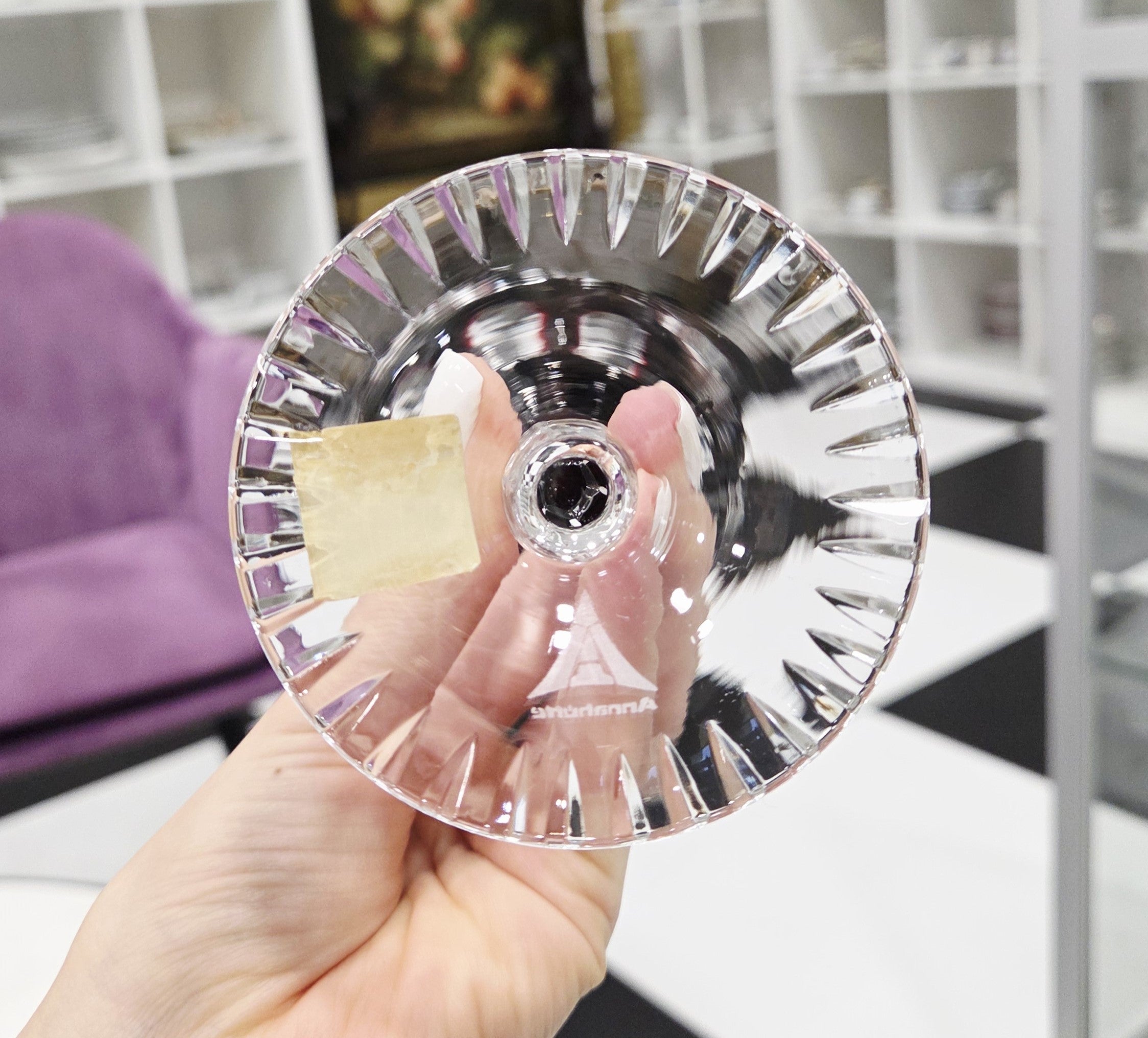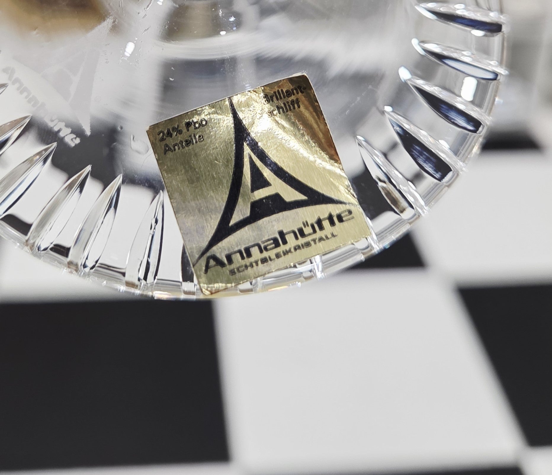 Ein exklusives Set handgefertigter Weingläser von ANNAHÜTTE (Westdeutschland), hergestellt aus hochwertigem echtem Bleikristall mit über 24% PbO. Jedes Glas ist mit einem tiefen, präzisen Brillantschliff verziert, der ein brillantes Lichtspiel erzeugt und die Klarheit und Farbintensität des Kristalls hervorhebt.
