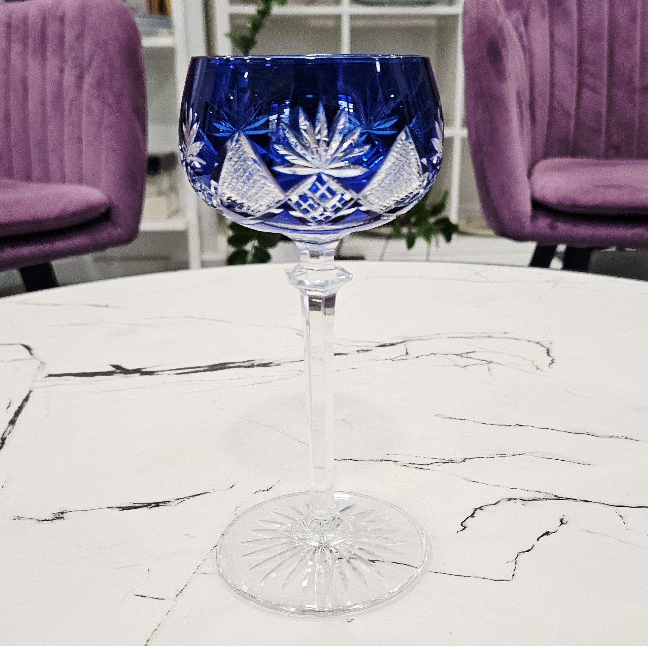 Dieser blaue Kelch, kreiert von Val Saint Lambert, einem der berühmtesten Kristallhersteller der Welt, ist ein wahres Symbol für Eleganz und Luxus. Seine unverwechselbare Farbe erinnert an einen schimmernden Saphir, der mit seinem verspielten Schimmer die Blicke auf sich zieht und einen unverwechselbaren ästhetischen Eindruck vermittelt. Das Kristall im Glas zeichnet sich durch seine makellose Klarheit und Brillanz aus und verleiht jedem Getränk ein besonderes Aussehen.
