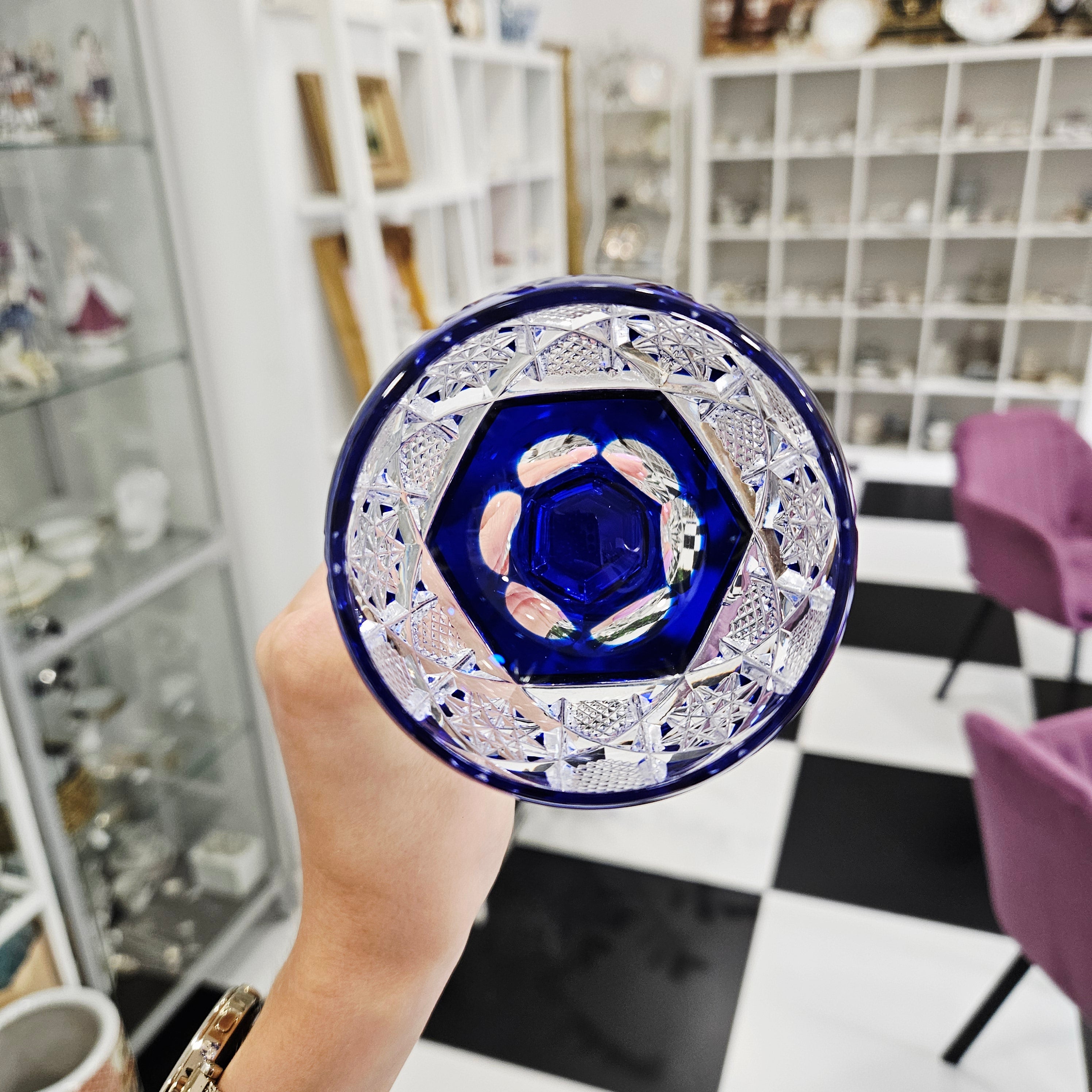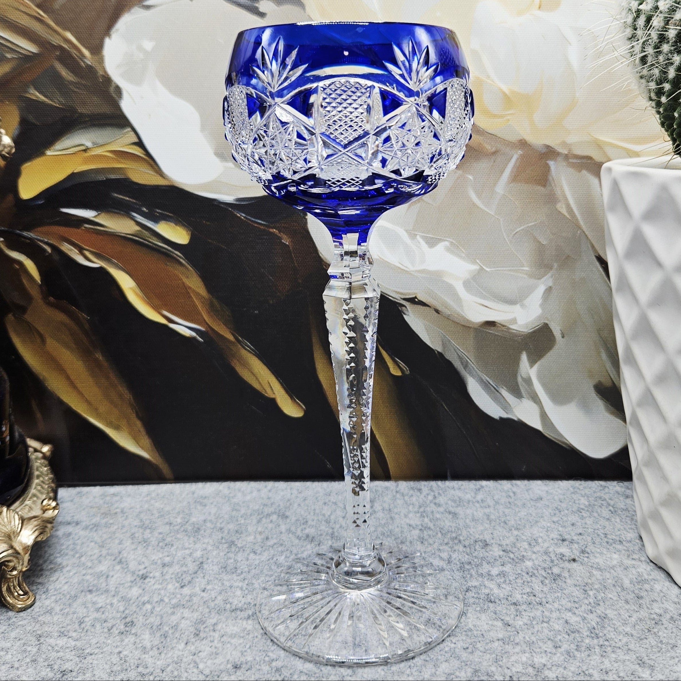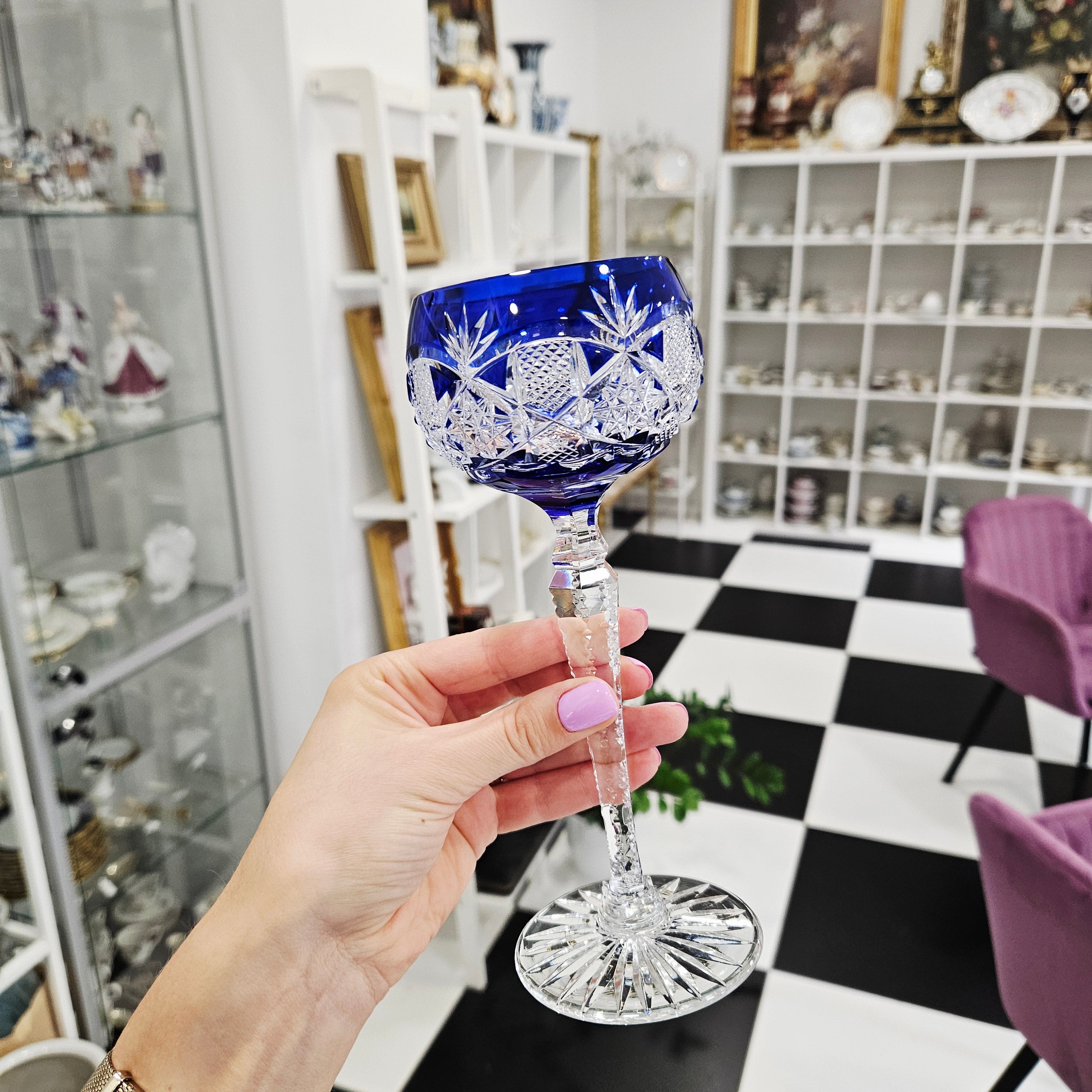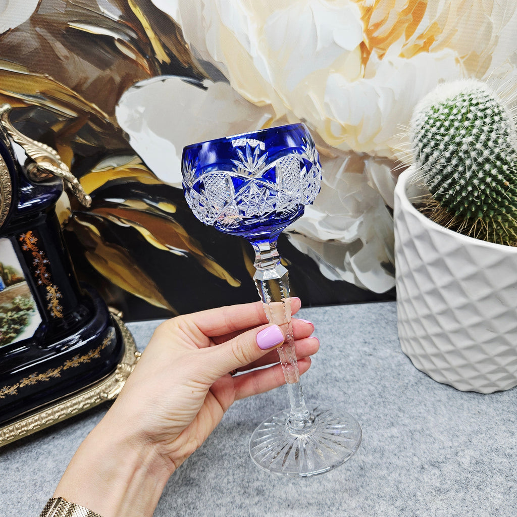 Dieses blaue Weinglas, das von Val Saint Lambert, einem der berühmtesten Kristallhersteller der Welt, entworfen wurde, ist ein wahres Symbol für Eleganz und Luxus. Seine unverwechselbare Farbe erinnert an einen glitzernden Smaragd, der mit seinem verspielten Funkeln die Blicke auf sich zieht und einen einzigartigen ästhetischen Eindruck vermittelt. Das Kristall im Glas zeichnet sich durch seine makellose Klarheit und Brillanz aus und verleiht jedem Getränk ein besonderes Aussehen.