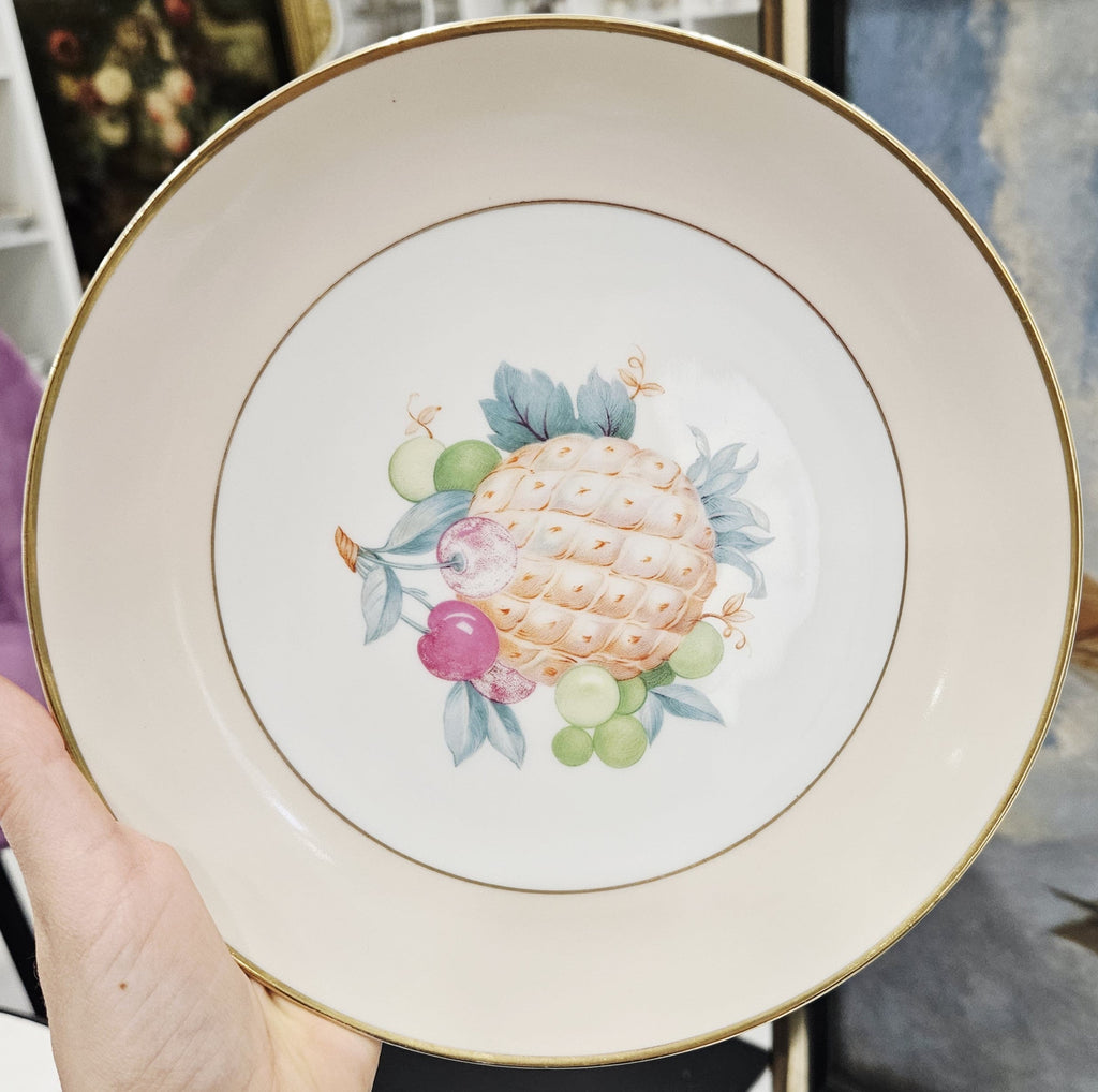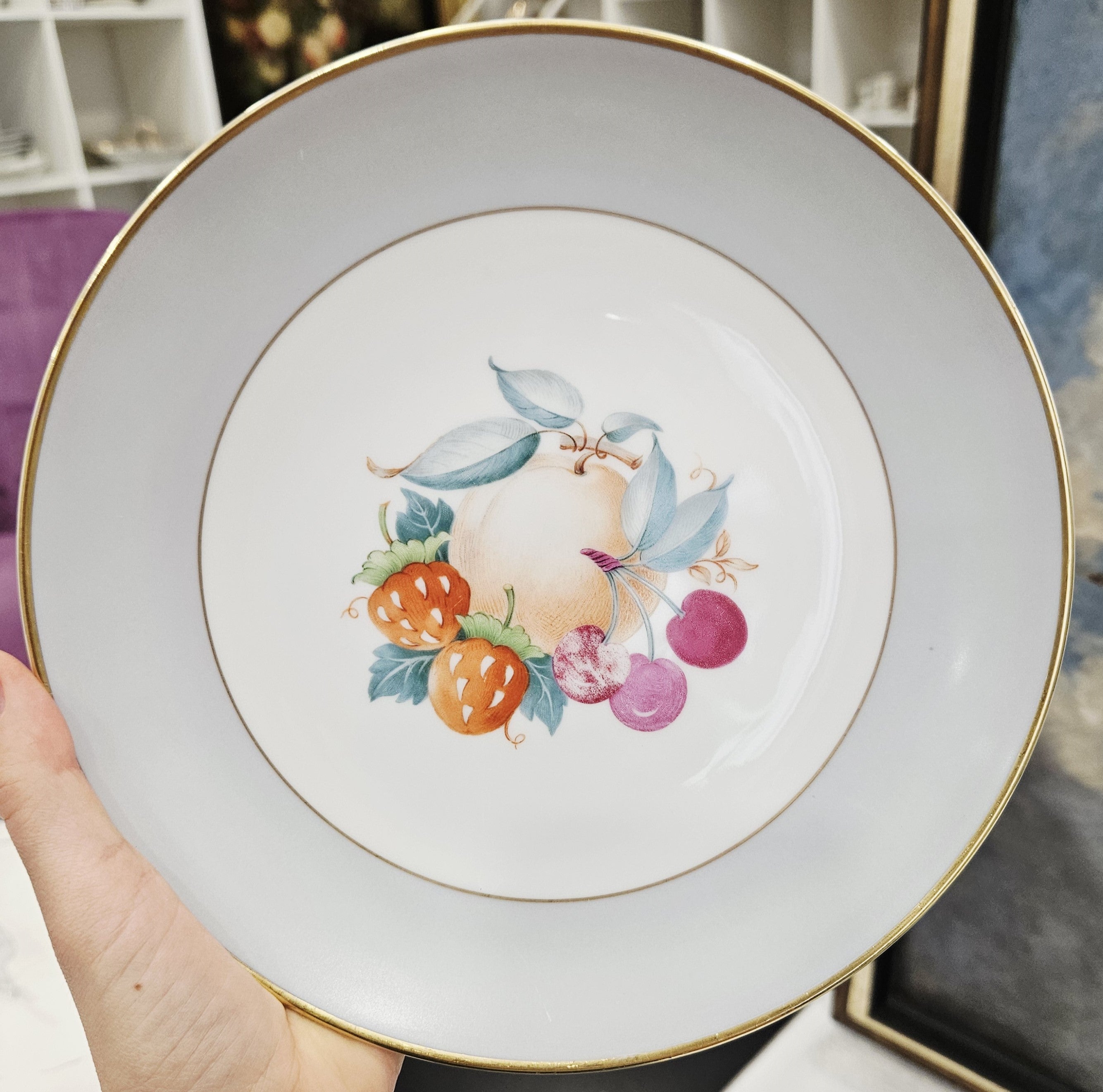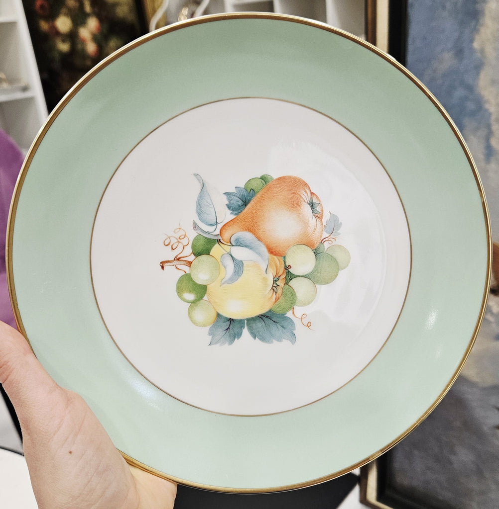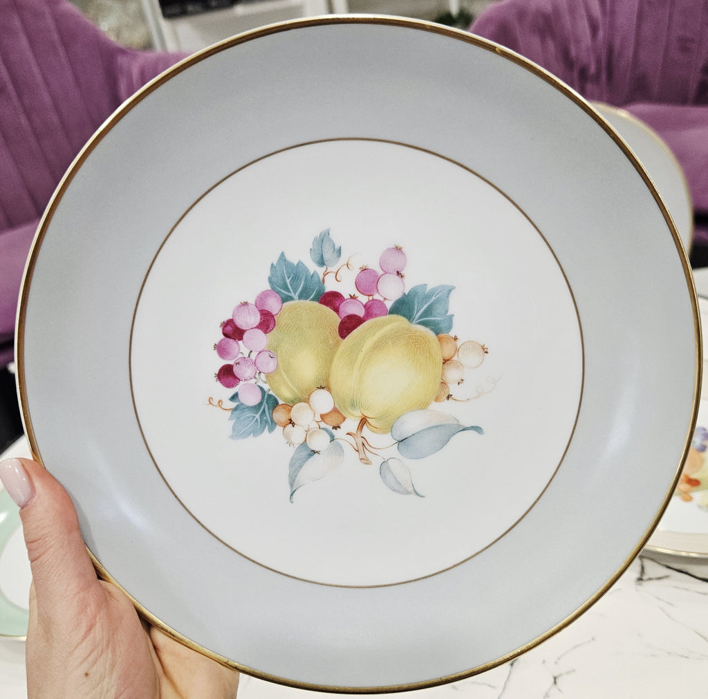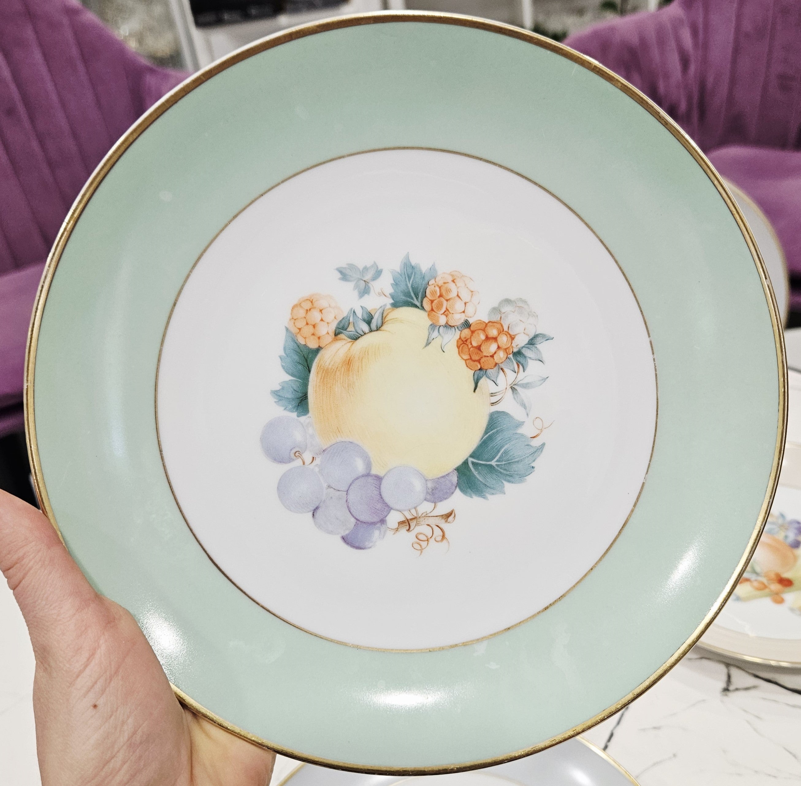 Königl. pr. Tettau Porzellanteller von außergewöhnlicher Schönheit, verziert mit verschiedenen Obst- und Beerenmotiven. Jeder Teller zeigt eine andere Fruchtkomposition und die Ränder sind mit pastellfarbenen (grün, blau und creme) Bändern und goldenen Linien verziert.