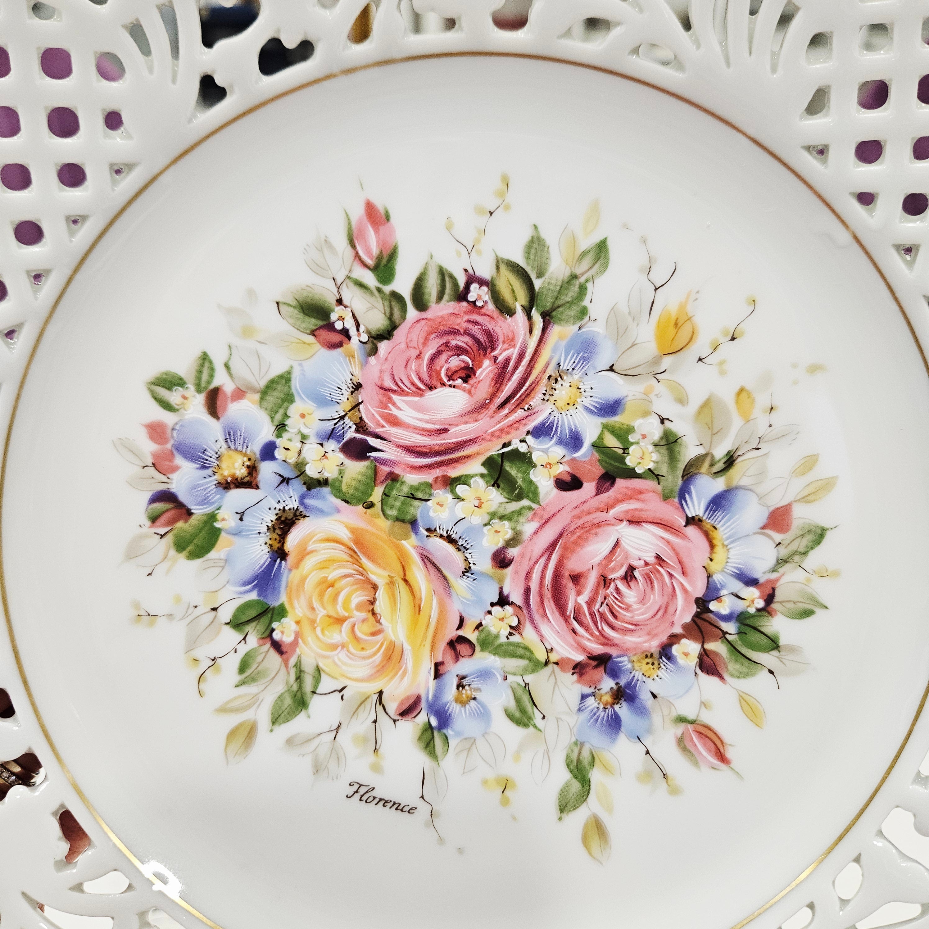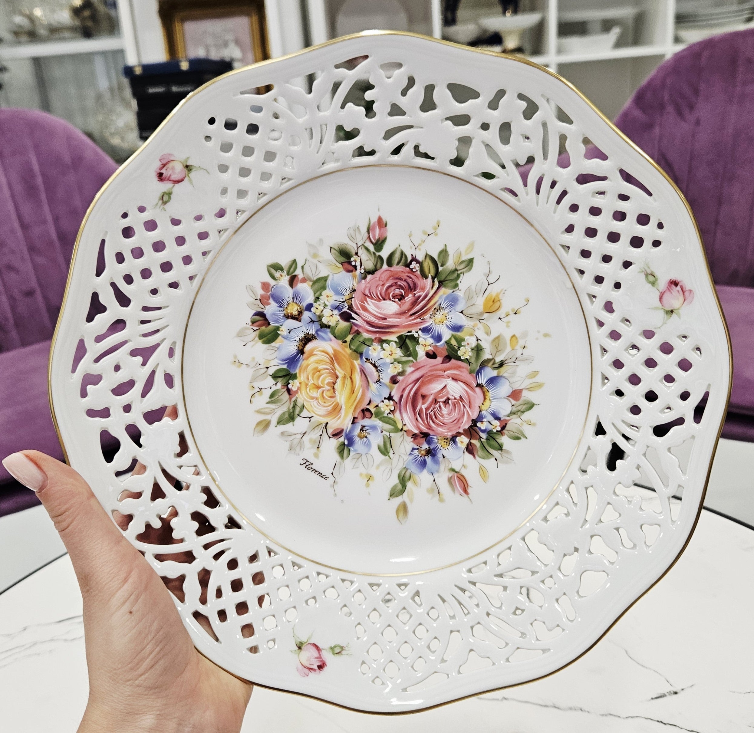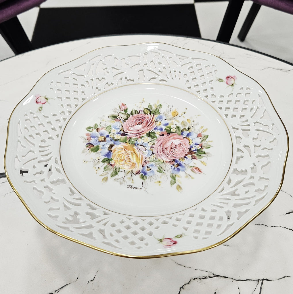 In der Mitte des Tellers ist ein bezauberndes Motiv eines handgemalten Rosen- und Blumenstraußes zu sehen, während die Ränder mit fachmännisch geschliffenem durchbrochenem Porzellan verziert sind, was ihm Leichtigkeit, Eleganz und Sammlerwert verleiht. Der sanft schimmernde Goldrand unterstreicht die Anmut der Form und die Sorgfalt der bayerischen Handwerker zusätzlich.