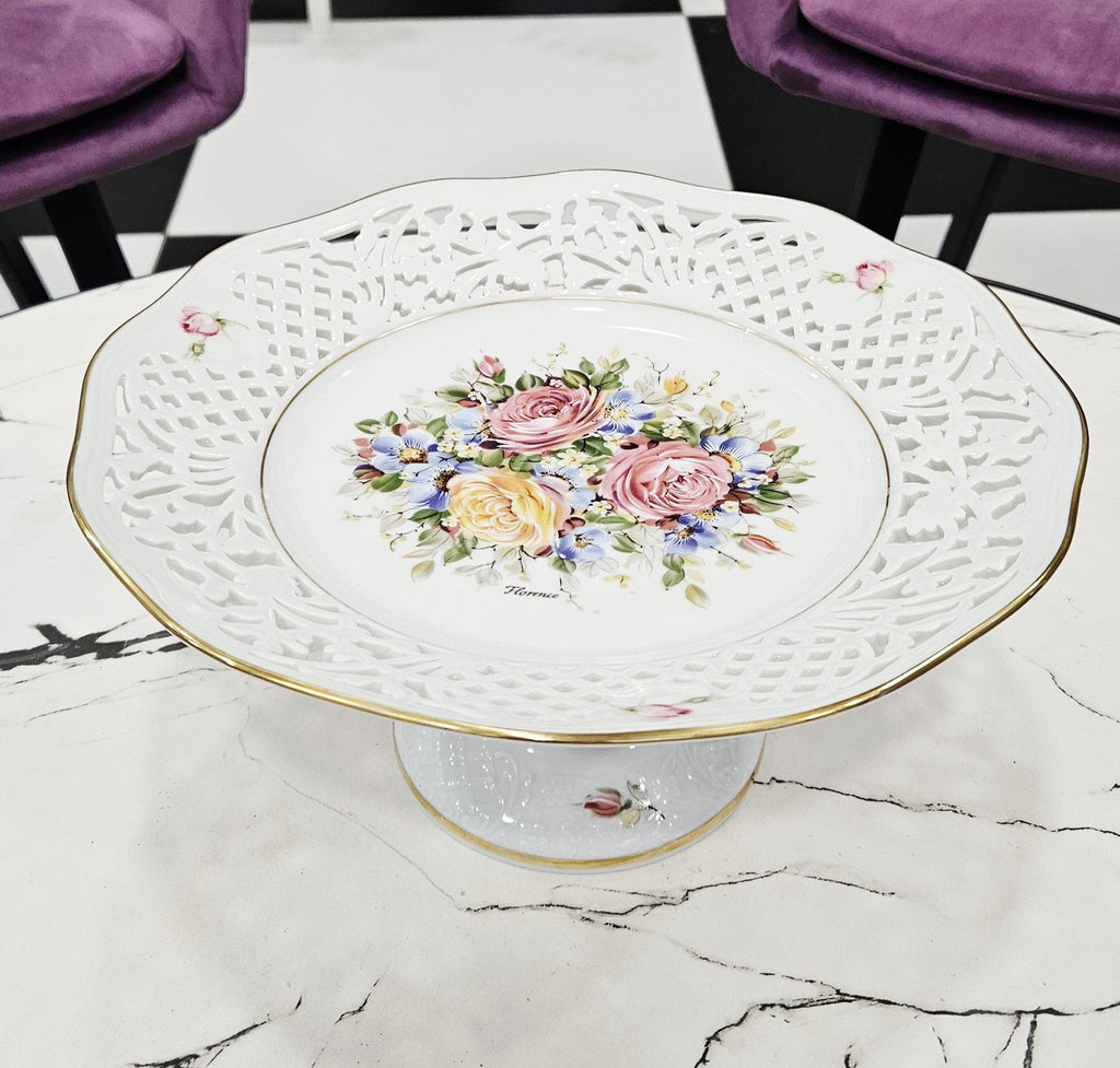 Der Dessertteller aus Porzellan von Schumann Arzberg Germany von außergewöhnlicher Schönheit auf einem hohen, anmutigen Fuß ist ein wahrer Akzent von Vintage-Luxus, der in der berühmten bayerischen Porzellanmanufaktur hergestellt wird. Der Teller gehört zu der prestigeträchtigen Kollektion Florence - Die Meisterklasse, die für ihre außergewöhnliche Qualität, ihre zarten durchbrochenen Ornamente und ihr unvergleichliches handgefertigtes Dekor bekannt ist.