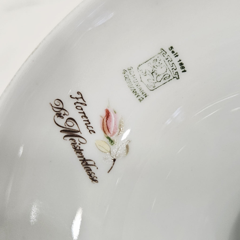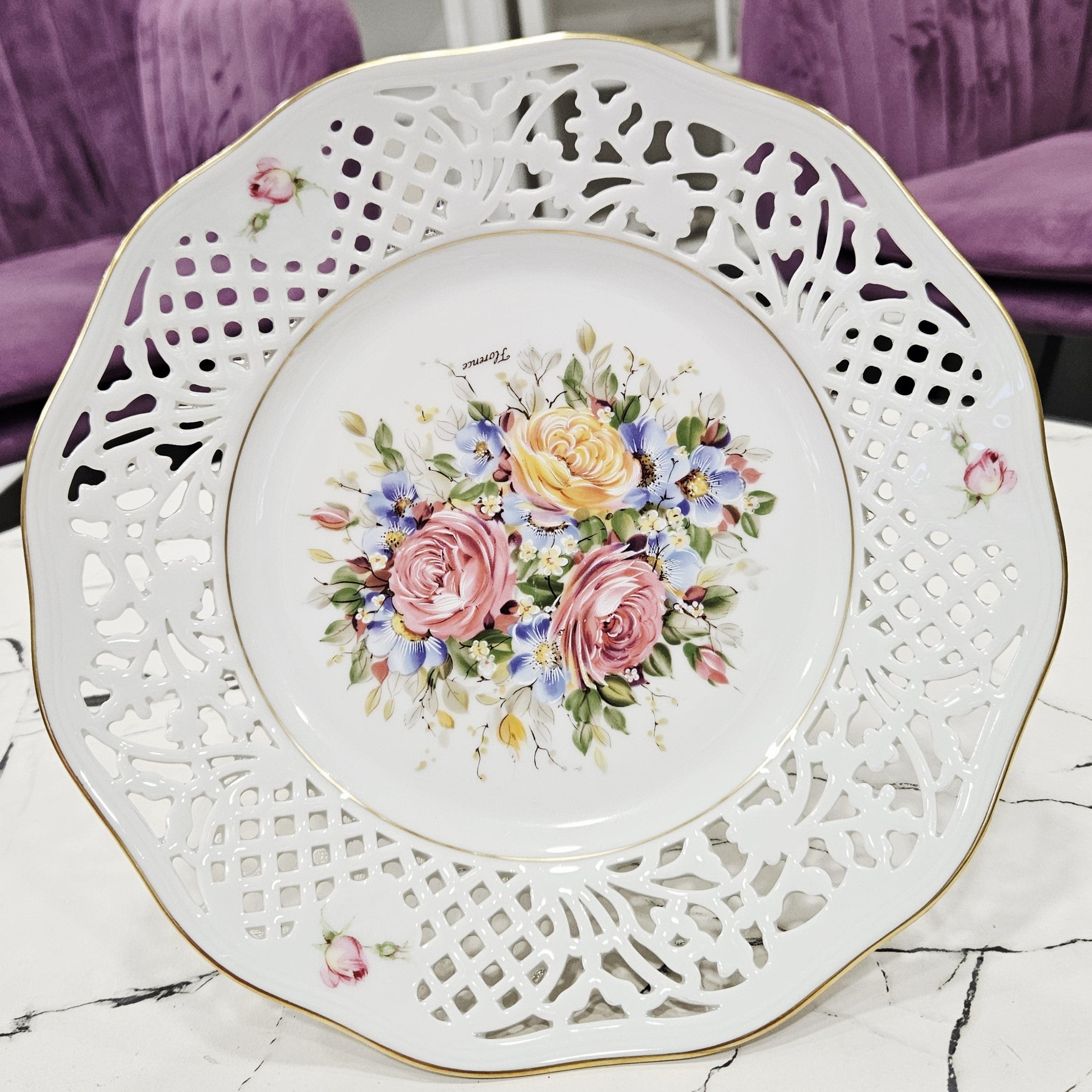 In der Mitte des Tellers ist ein bezauberndes Motiv eines handgemalten Rosen- und Blumenstraußes zu sehen, während die Ränder mit fachmännisch geschliffenem durchbrochenem Porzellan verziert sind, was ihm Leichtigkeit, Eleganz und Sammlerwert verleiht. Der sanft schimmernde Goldrand unterstreicht die Anmut der Form und die Sorgfalt der bayerischen Handwerker zusätzlich.