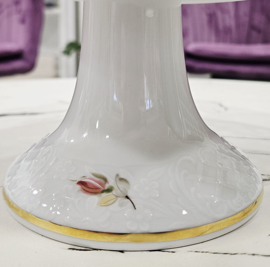 Der Dessertteller aus Porzellan von Schumann Arzberg Germany von außergewöhnlicher Schönheit auf einem hohen, anmutigen Fuß ist ein wahrer Akzent von Vintage-Luxus, der in der berühmten bayerischen Porzellanmanufaktur hergestellt wird. Der Teller gehört zu der prestigeträchtigen Kollektion Florence - Die Meisterklasse, die für ihre außergewöhnliche Qualität, ihre zarten durchbrochenen Ornamente und ihr unvergleichliches handgefertigtes Dekor bekannt ist.