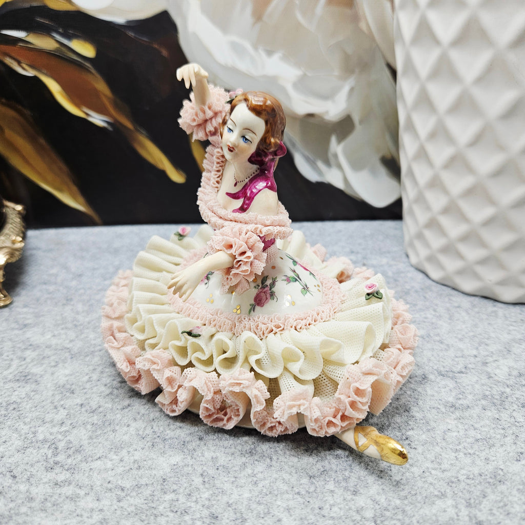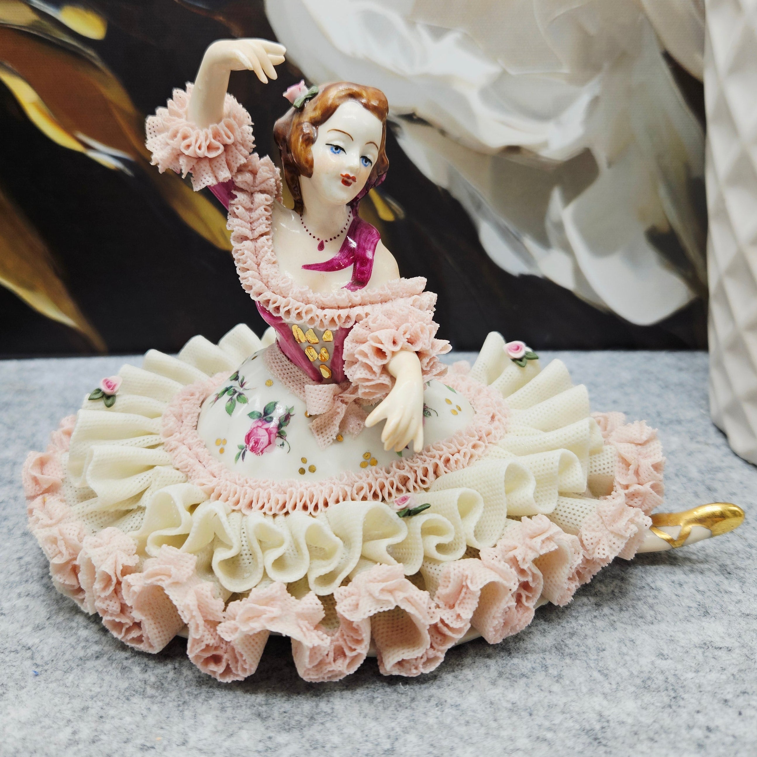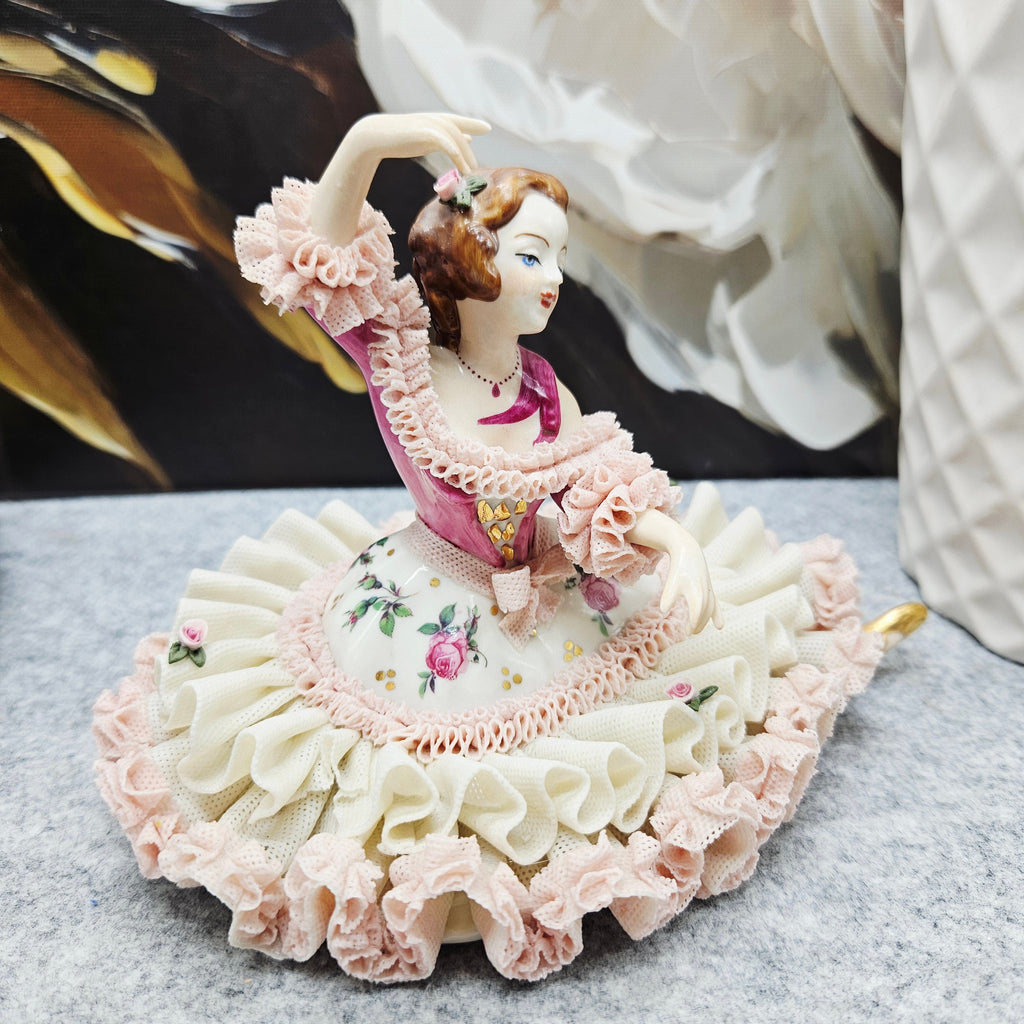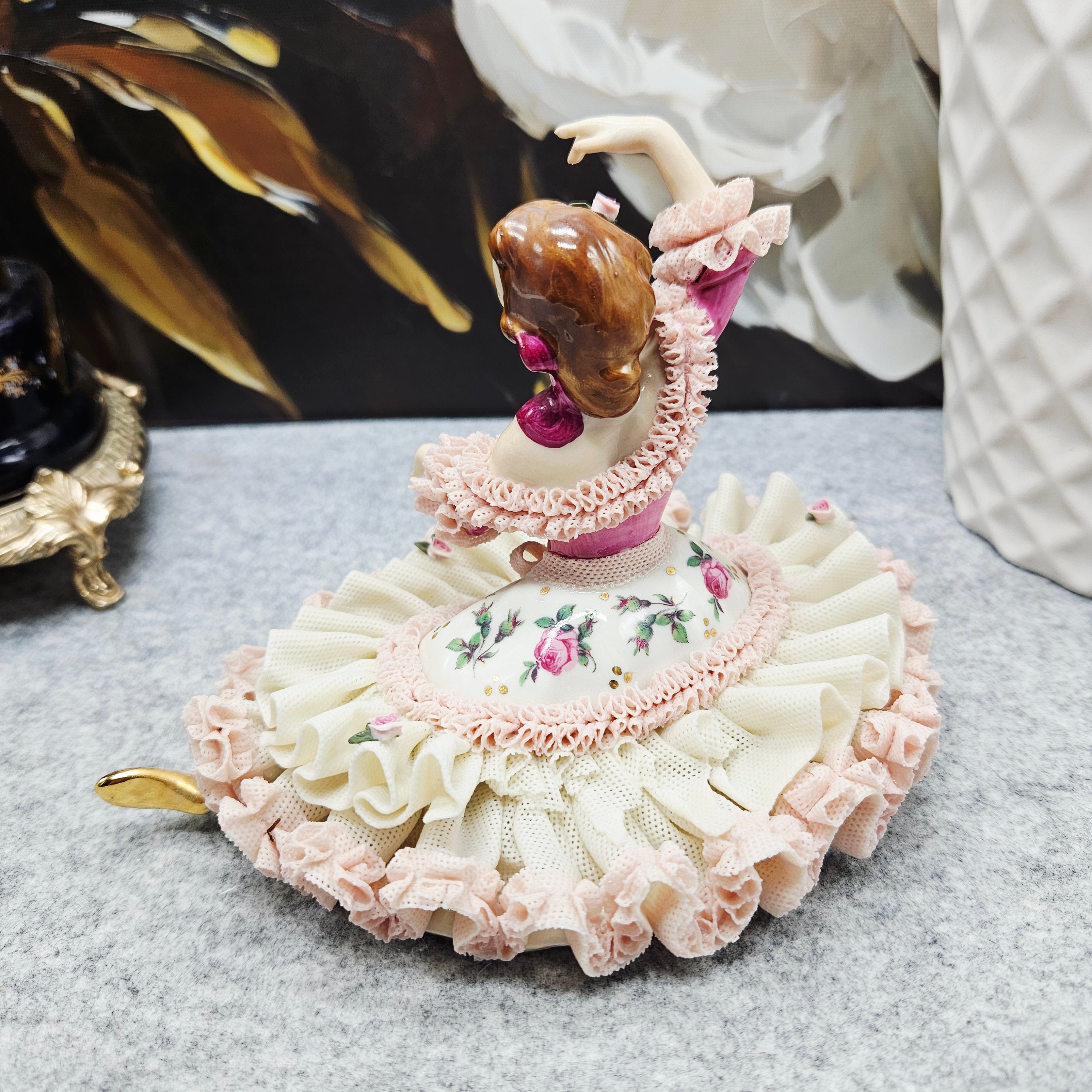 Die Manufaktur Gisela Keilhauer ist eine historisch bedeutende bayerische Porzellanmanufaktur, die für ihre exquisiten handgeformten Porzellanfiguren berühmt ist. Jede Figur wurde von Hand gefertigt, wobei die durchbrochene Spitze mit größter Sorgfalt aus der Porzellanmasse geformt wurde, und hat daher bis heute einen sehr hohen Wert und Sammlerwert. Diese elegante Figur spiegelt die Handwerkskunst der Manufaktur perfekt wider. Die zart modellierte Dame trägt einen reich gefalteten Spitzenrock, der mit Rüschen in zarten Pastelltönen und handgemalten Rosenakzenten verziert ist. Die anmutige Pose, die ausdrucksstarken Details, die satten Farben und die goldenen Akzente sorgen für einen luxuriösen und romantischen visuellen Eindruck. Sie ist nicht nur ein dekoratives Einrichtungsstück, sondern auch ein von Sammlern weltweit geschätztes Fragment der Geschichte der hohen Porzellankultur.