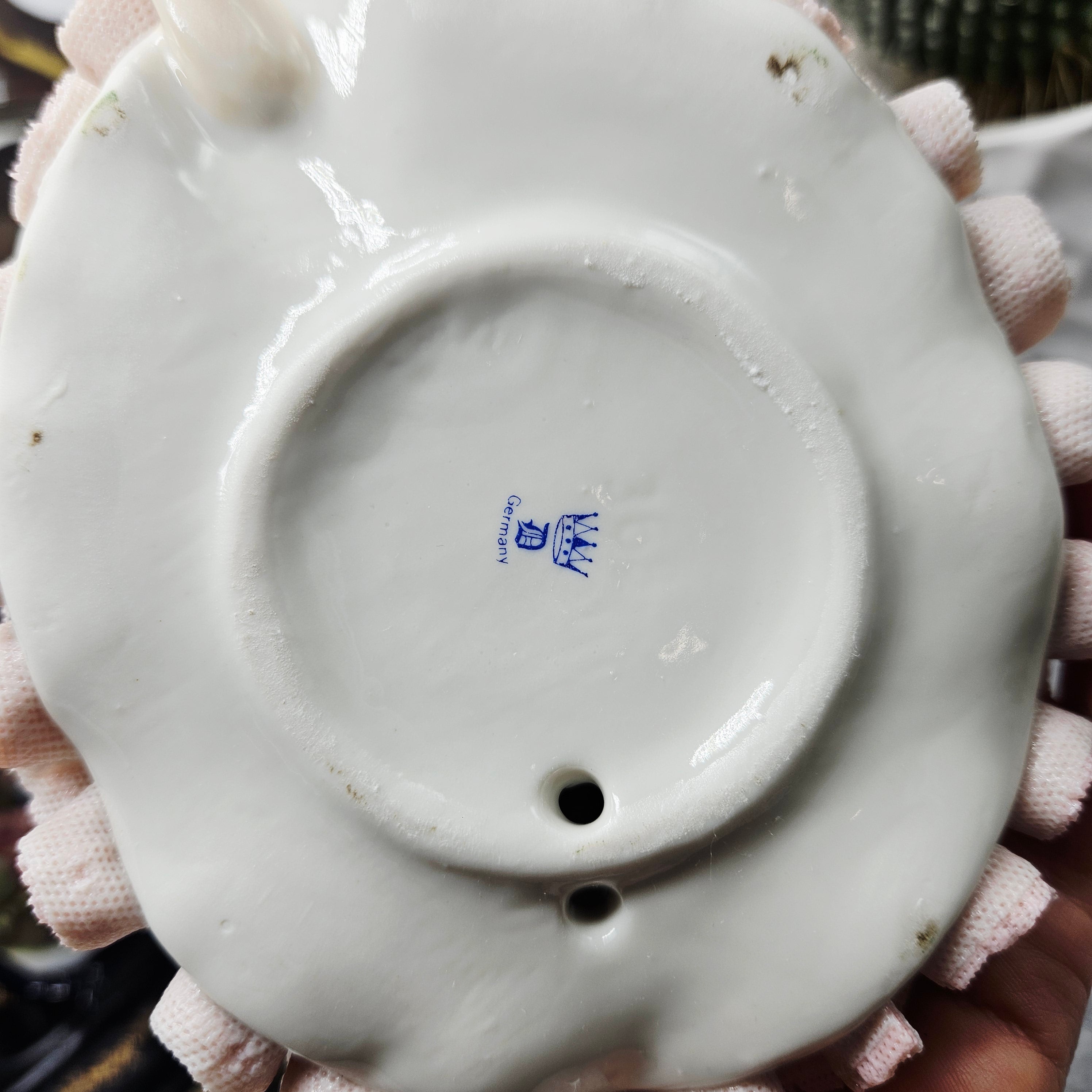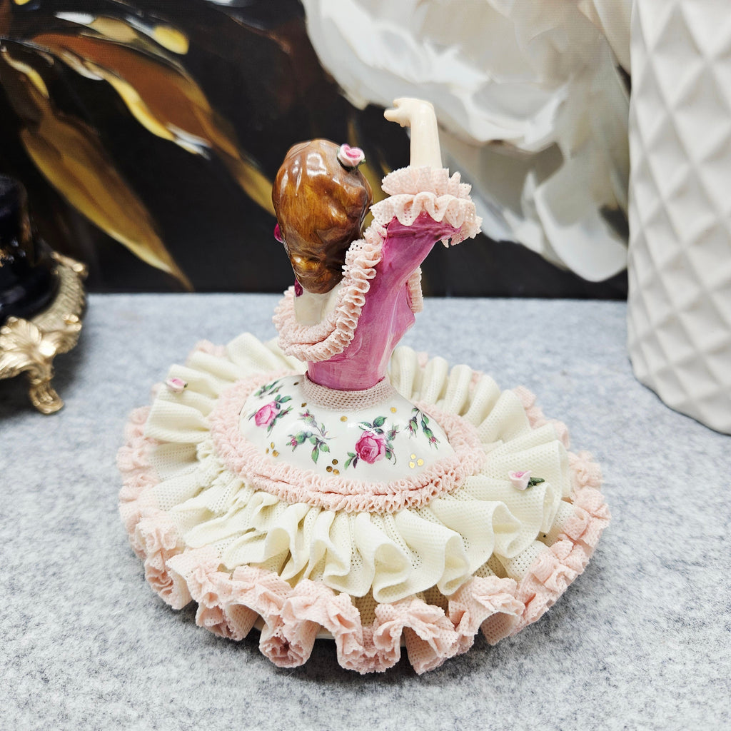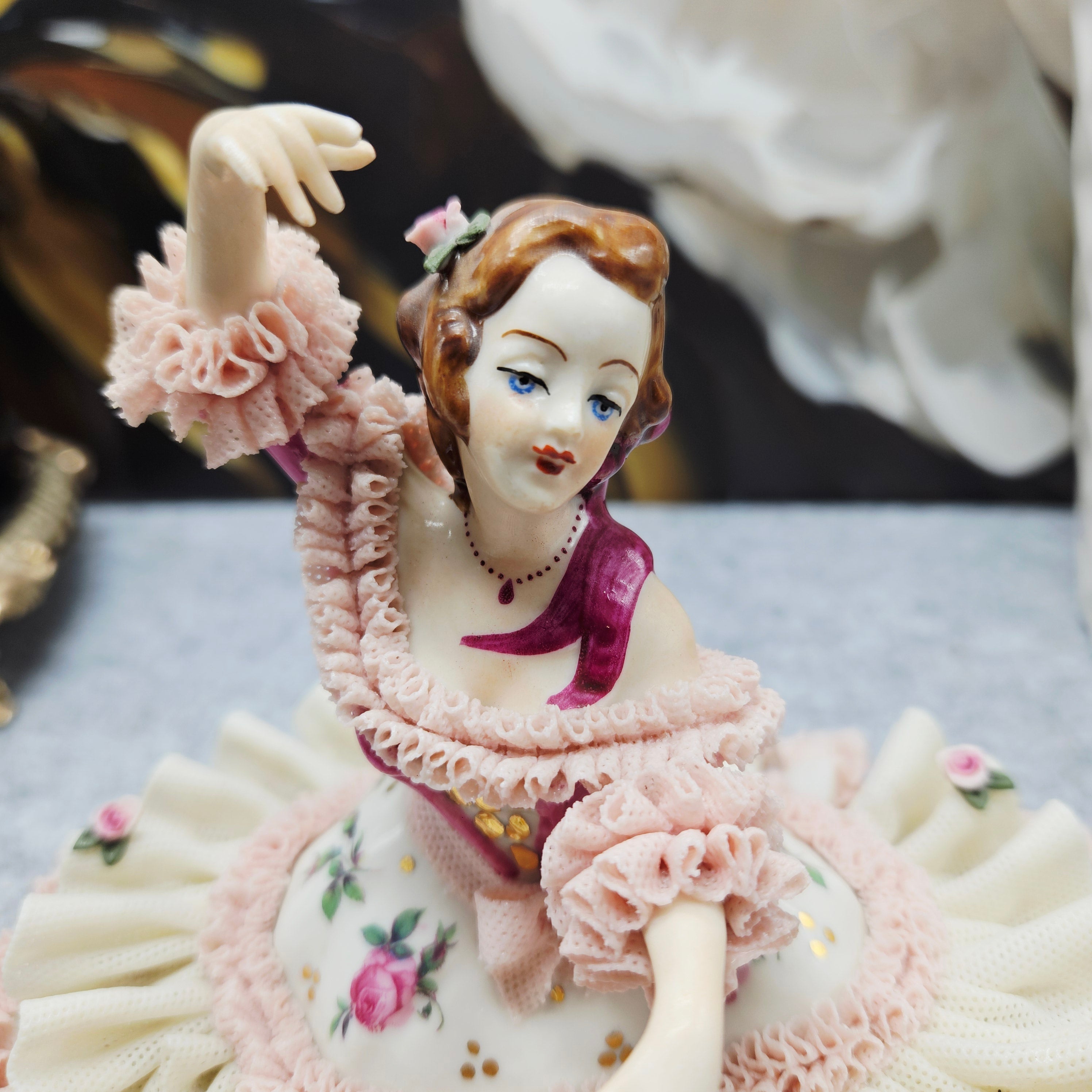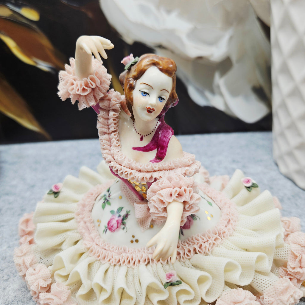 Die Manufaktur Gisela Keilhauer ist eine historisch bedeutende bayerische Porzellanmanufaktur, die für ihre exquisiten handgeformten Porzellanfiguren berühmt ist. Jede Figur wurde von Hand gefertigt, wobei die durchbrochene Spitze mit größter Sorgfalt aus der Porzellanmasse geformt wurde, und hat daher bis heute einen sehr hohen Wert und Sammlerwert. Diese elegante Figur spiegelt die Handwerkskunst der Manufaktur perfekt wider. Die zart modellierte Dame trägt einen reich gefalteten Spitzenrock, der mit Rüschen in zarten Pastelltönen und handgemalten Rosenakzenten verziert ist. Die anmutige Pose, die ausdrucksstarken Details, die satten Farben und die goldenen Akzente sorgen für einen luxuriösen und romantischen visuellen Eindruck. Sie ist nicht nur ein dekoratives Einrichtungsstück, sondern auch ein von Sammlern weltweit geschätztes Fragment der Geschichte der hohen Porzellankultur.