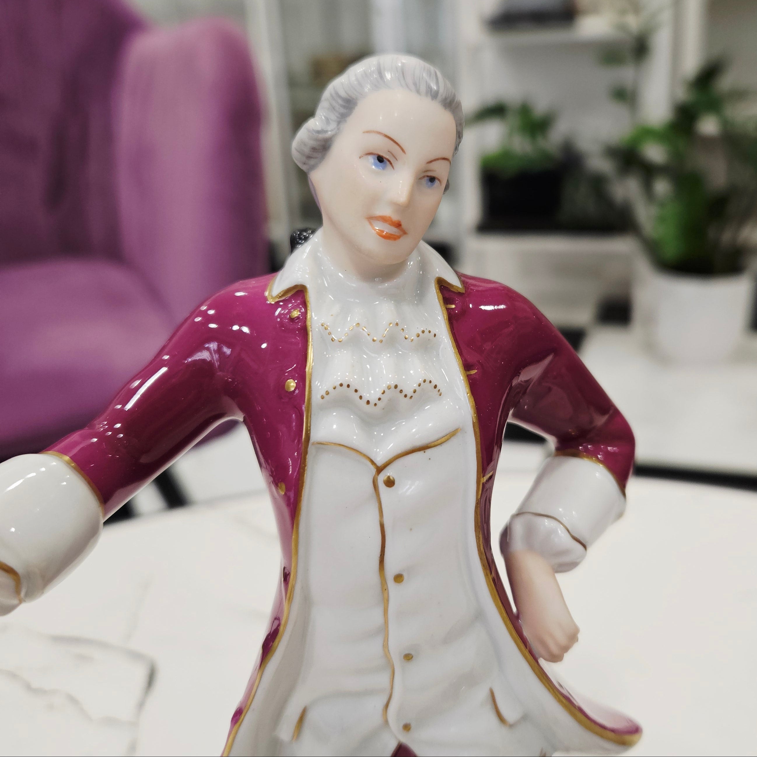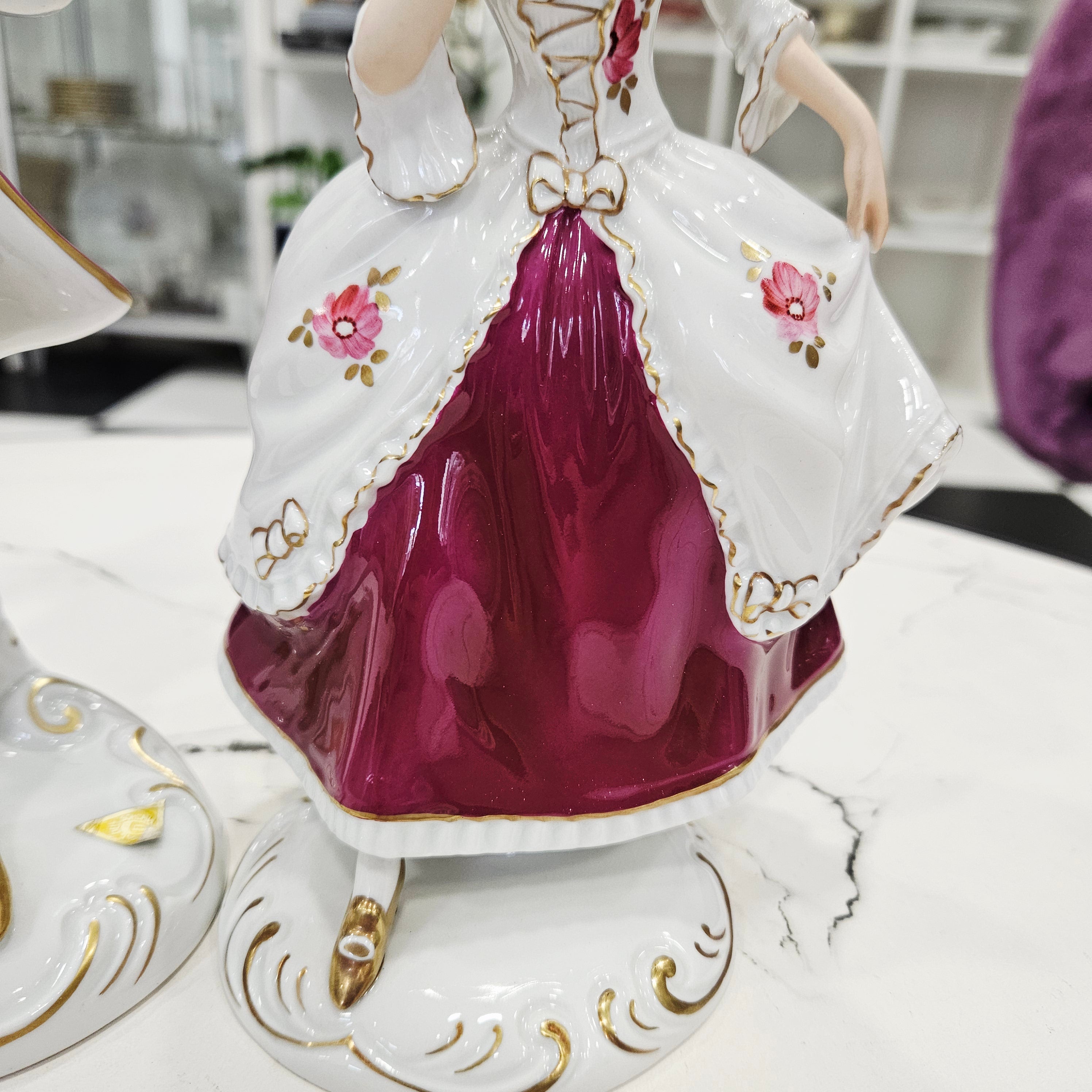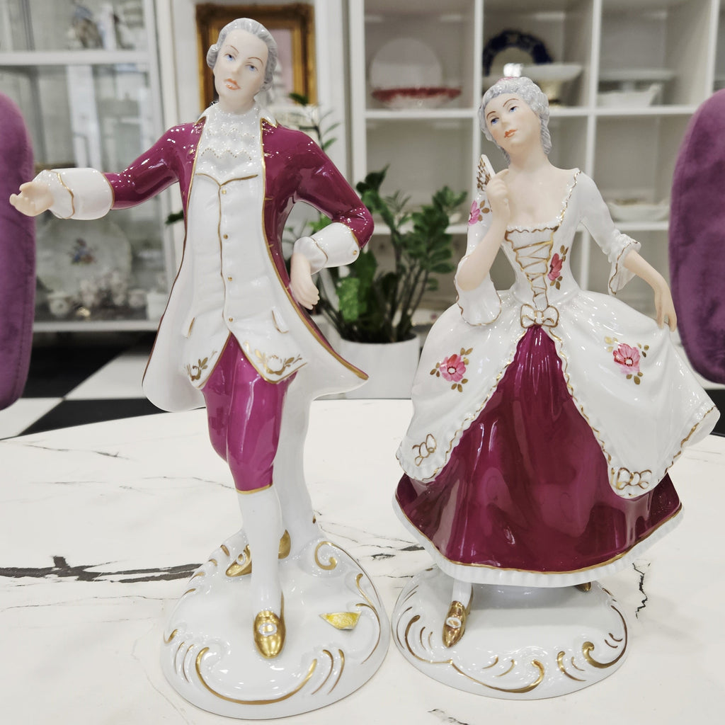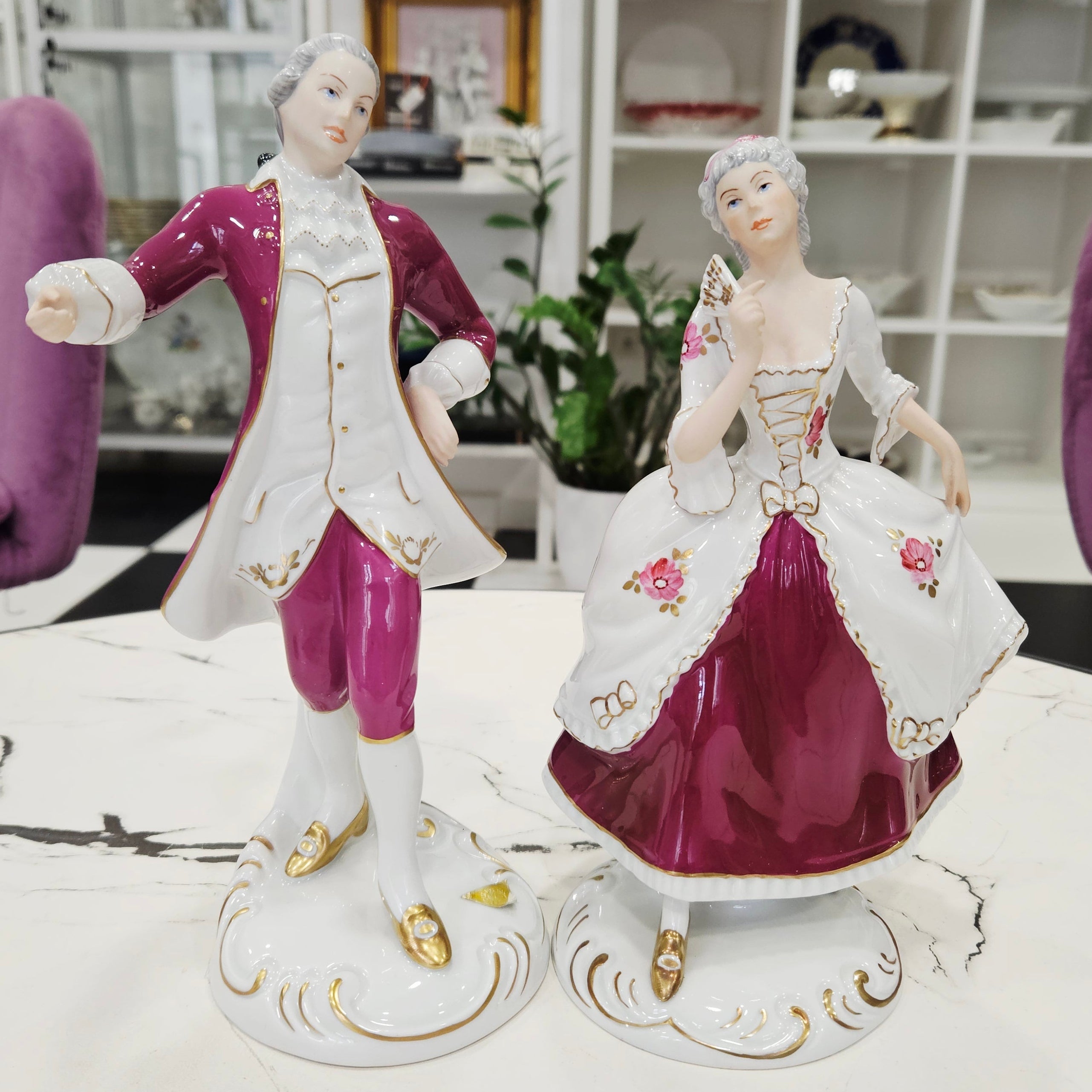 Das Kleid der Dame ist mit handgemalten floralen Motiven, zarten Falten und sorgfältig wiedergegebener Textur verziert, während die Pose des Herrn anmutige Bewegung und aristokratische Haltung vermittelt. Die Gesichtszüge sind fein und präzise modelliert und unterstreichen die Handwerkskunst der Royal Dux Manufaktur.
