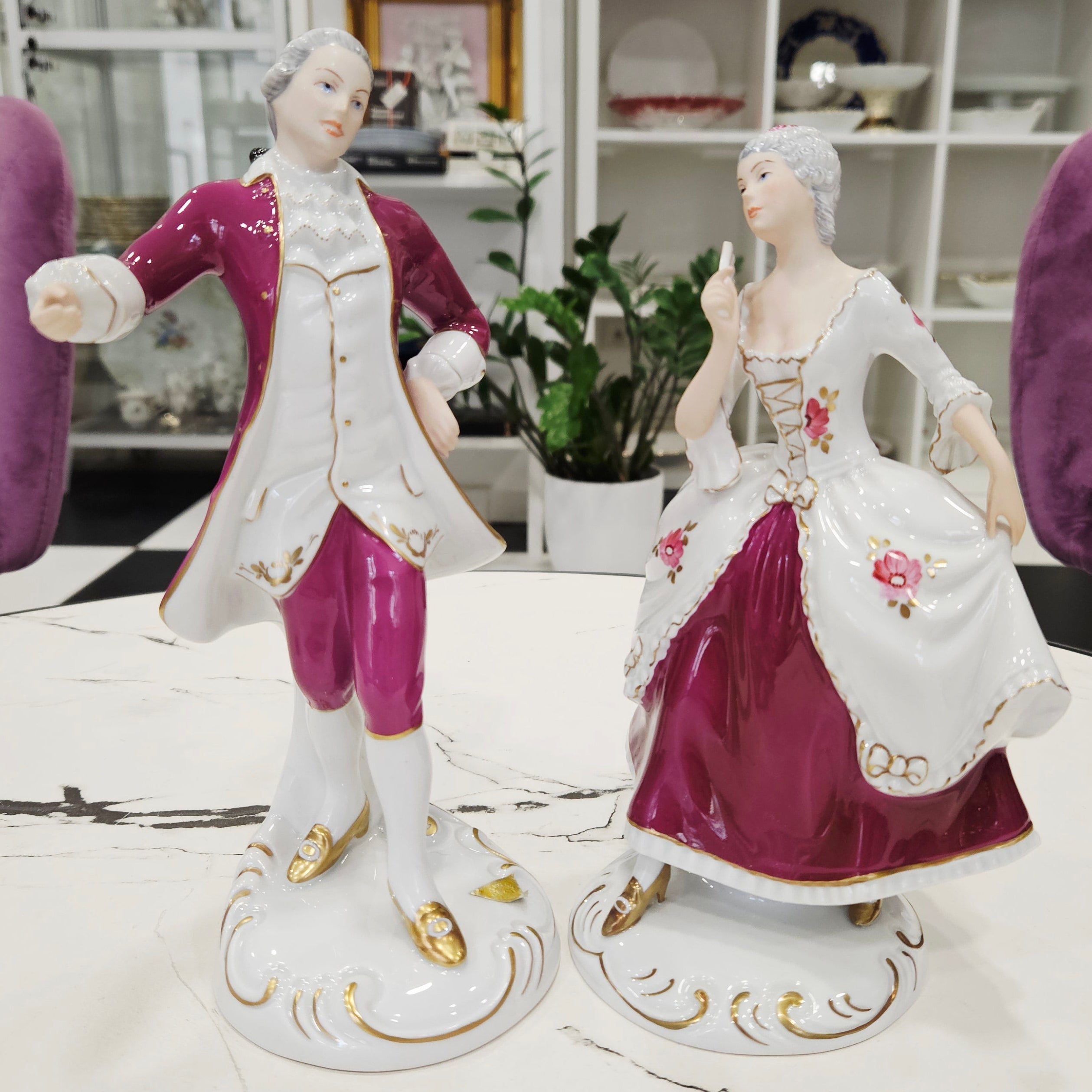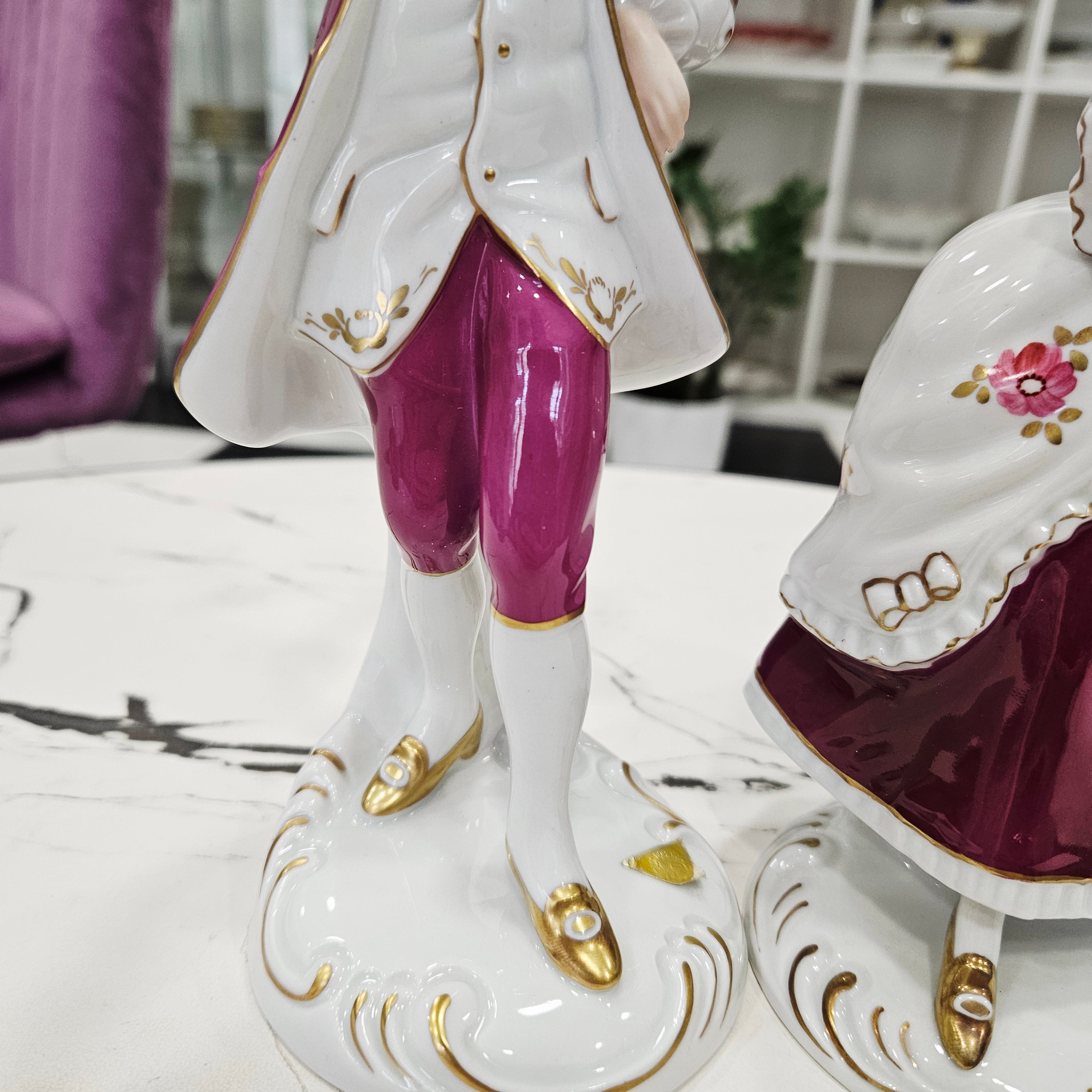 Ein Paar Royal Dux Bohemia Porzellan von außergewöhnlicher Schönheit, das mondäne Rokokotänzer darstellt. Die Figuren sind als elegante Tanzpartner geformt - ein Herr und eine Dame - und tragen die prächtigen Kostüme der Epoche mit reicher violetter Glasur und Goldakzenten.