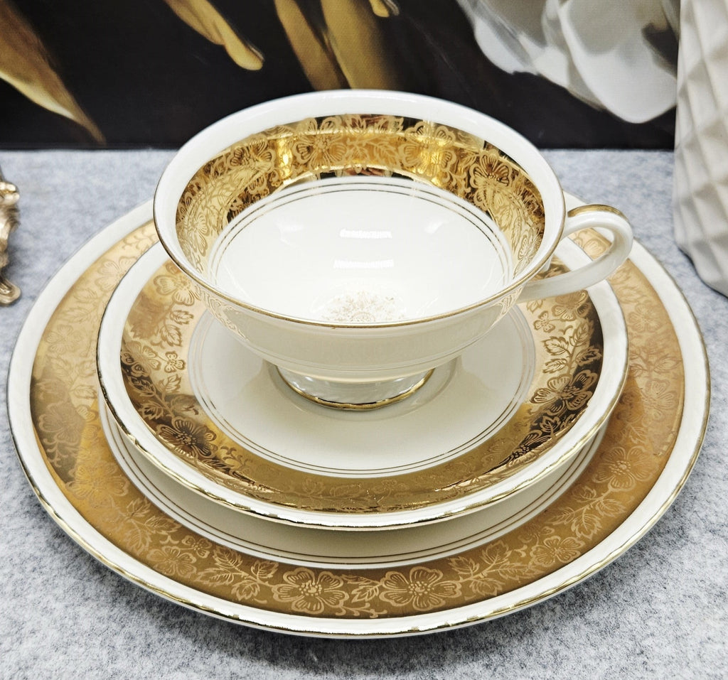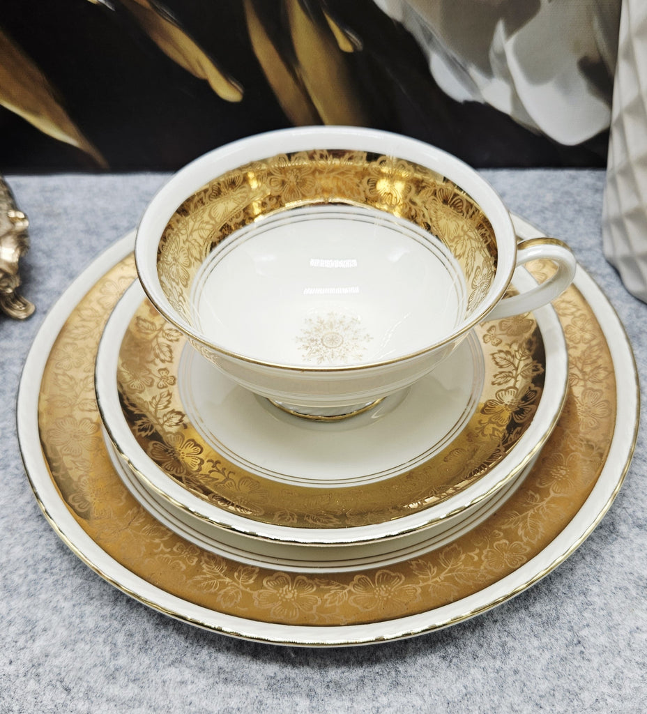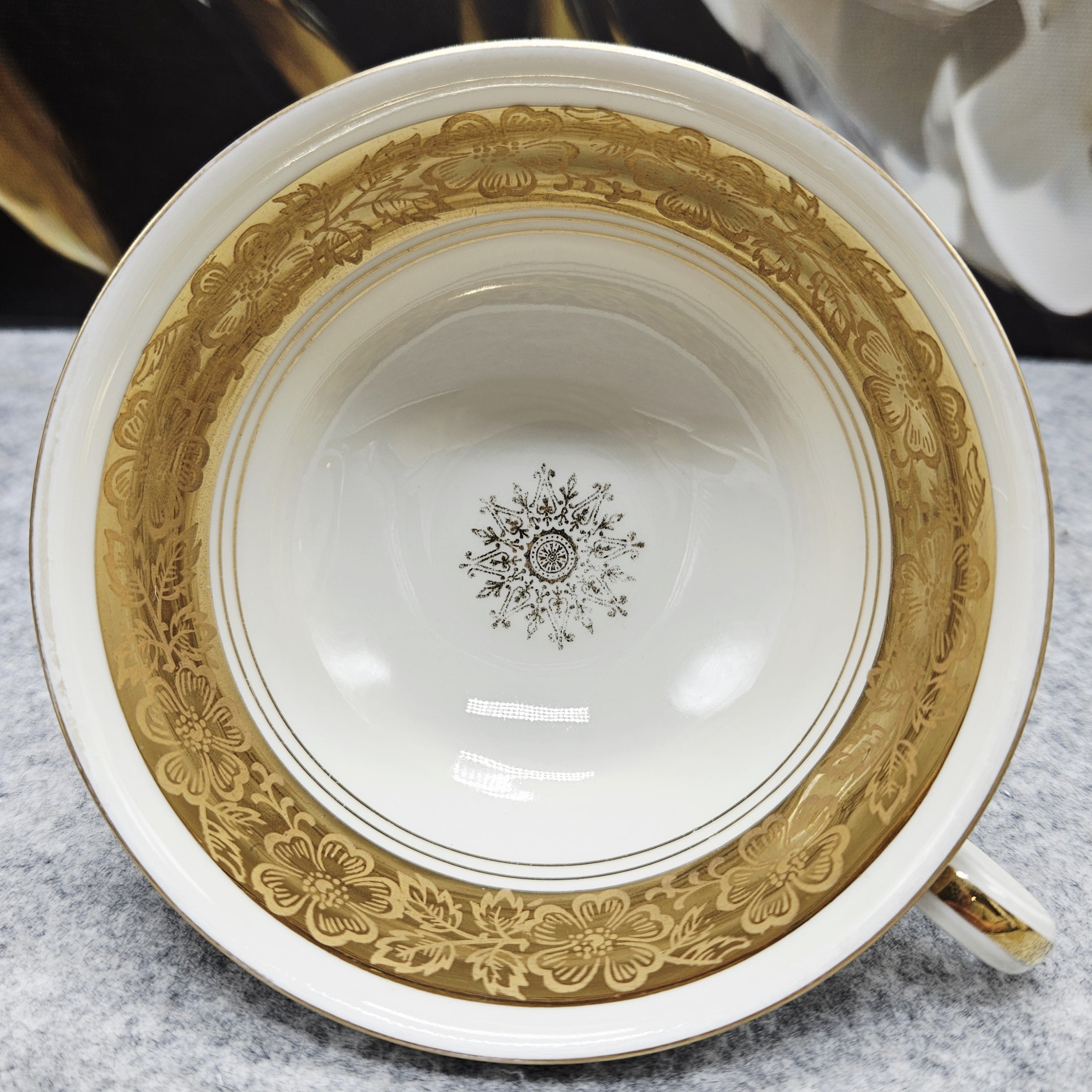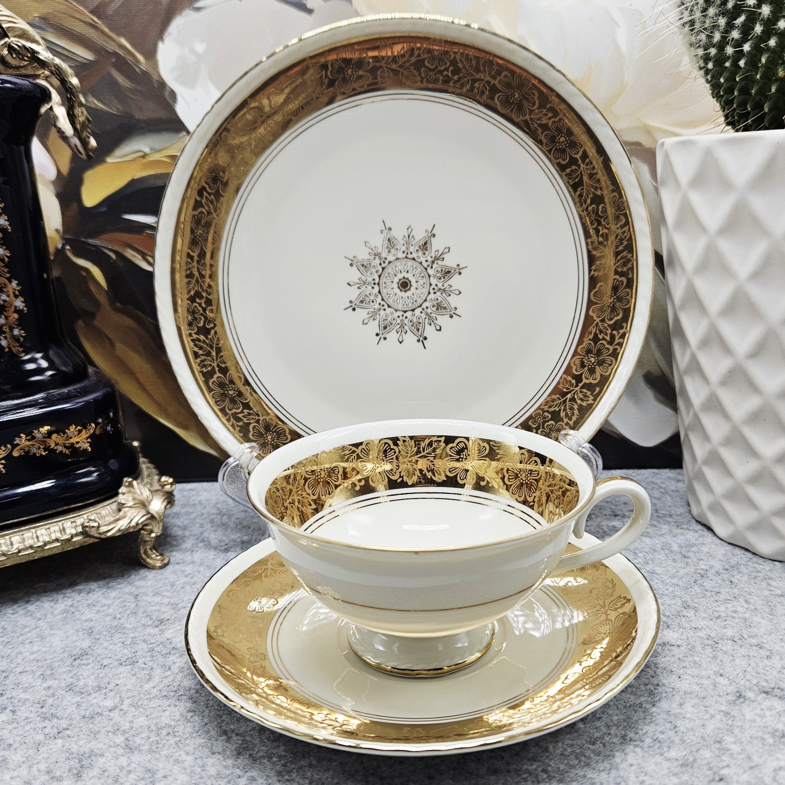 Eleganter Winterling Röslau Bavaria Porzellanbecher mit zwei Untertassen, verziert mit goldenen Details und Blumen.