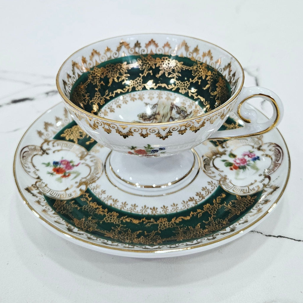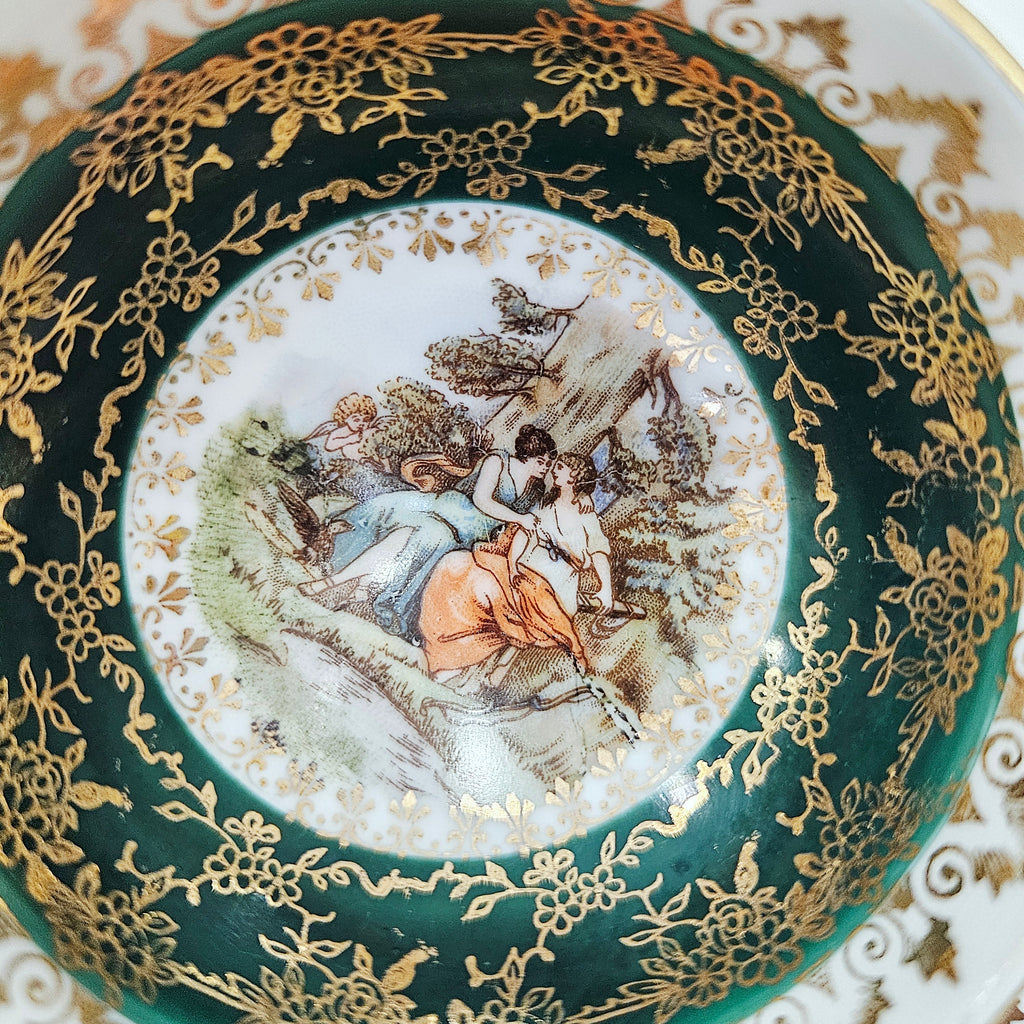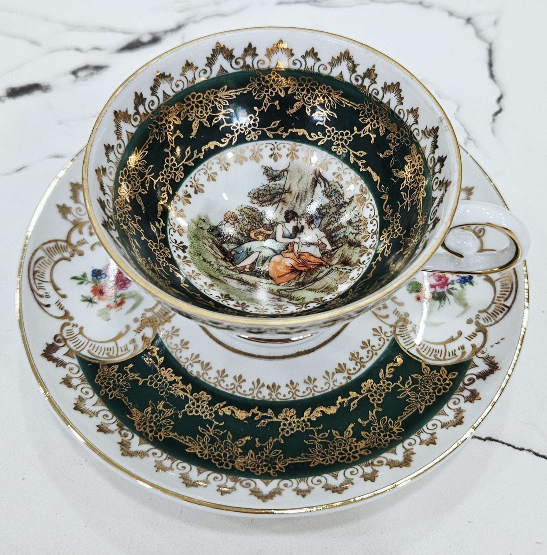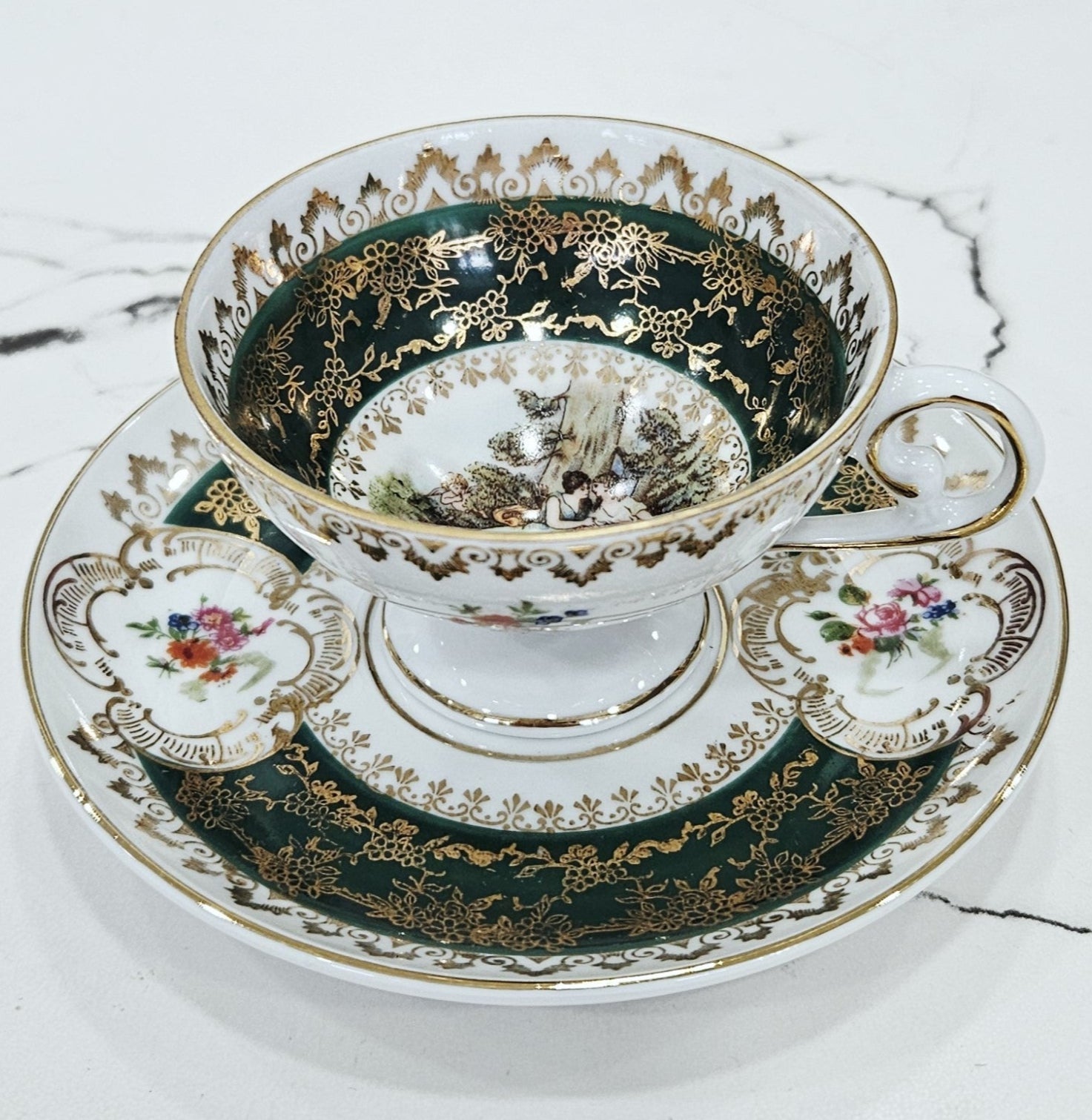 Dieses elegante Set ist in sattem Königsblau gehalten und mit zarten Goldornamenten und handgemalten Blumenmotiven verziert. Das Innere der Tasse zeigt eine romantische Szene, die den Geist der damaligen Zeit und einen klassischen Sinn für Schönheit widerspiegelt. Die vergoldeten Ränder und der verschnörkelte Henkel heben die Form des Stücks subtil hervor.