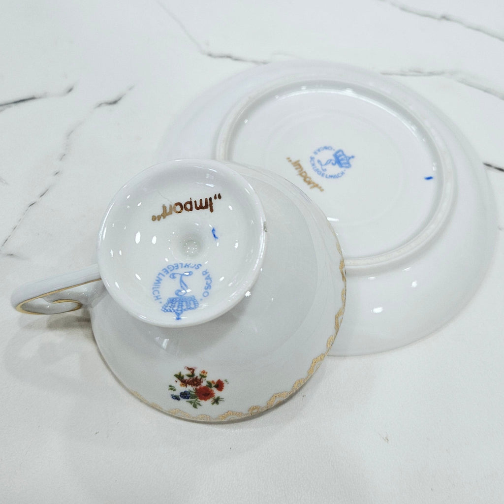 Eine Mokkatasse mit Untertasse aus Porzellan von außergewöhnlicher Schönheit, hergestellt in der berühmten Manufaktur Oscar Schlegelmilch. Der blaue Unterglasur-Stempel mit einer Krone und dem Buchstaben "L" bestätigt die Echtheit der Provenienz, während die zusätzliche Aufschrift "Import" darauf hinweist, dass das Stück speziell für den Export in ausländische Märkte, in der Regel die USA oder England, bestimmt war.