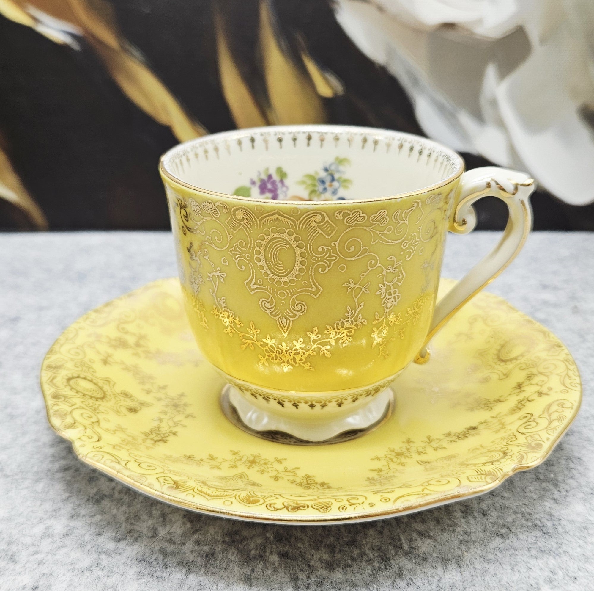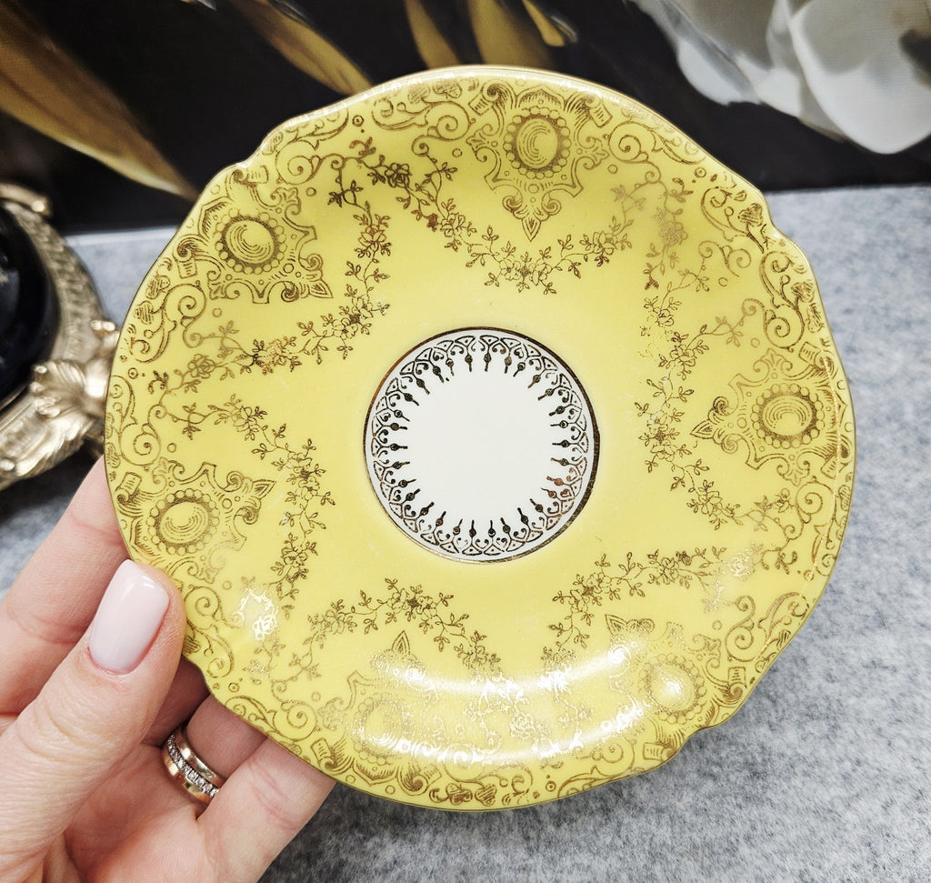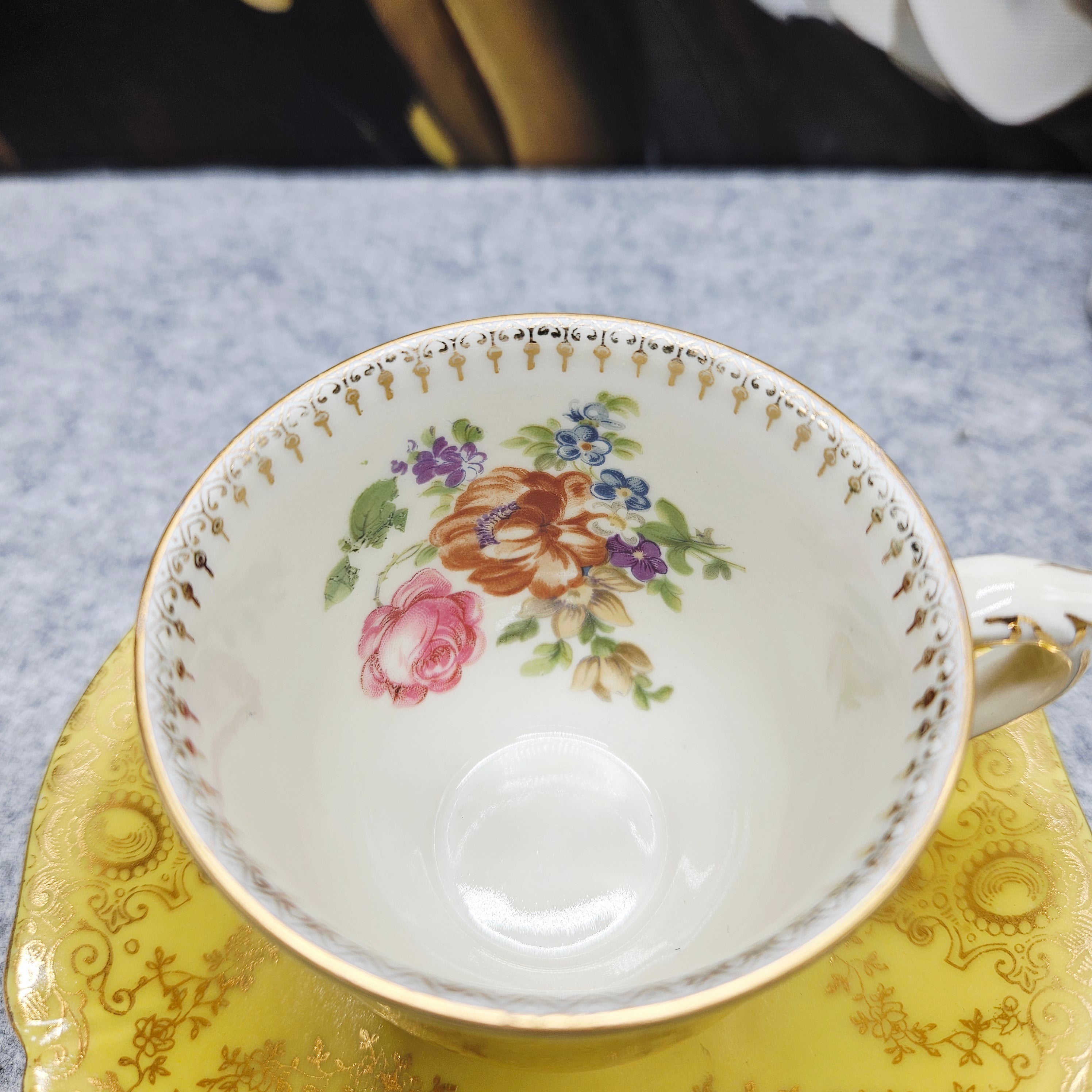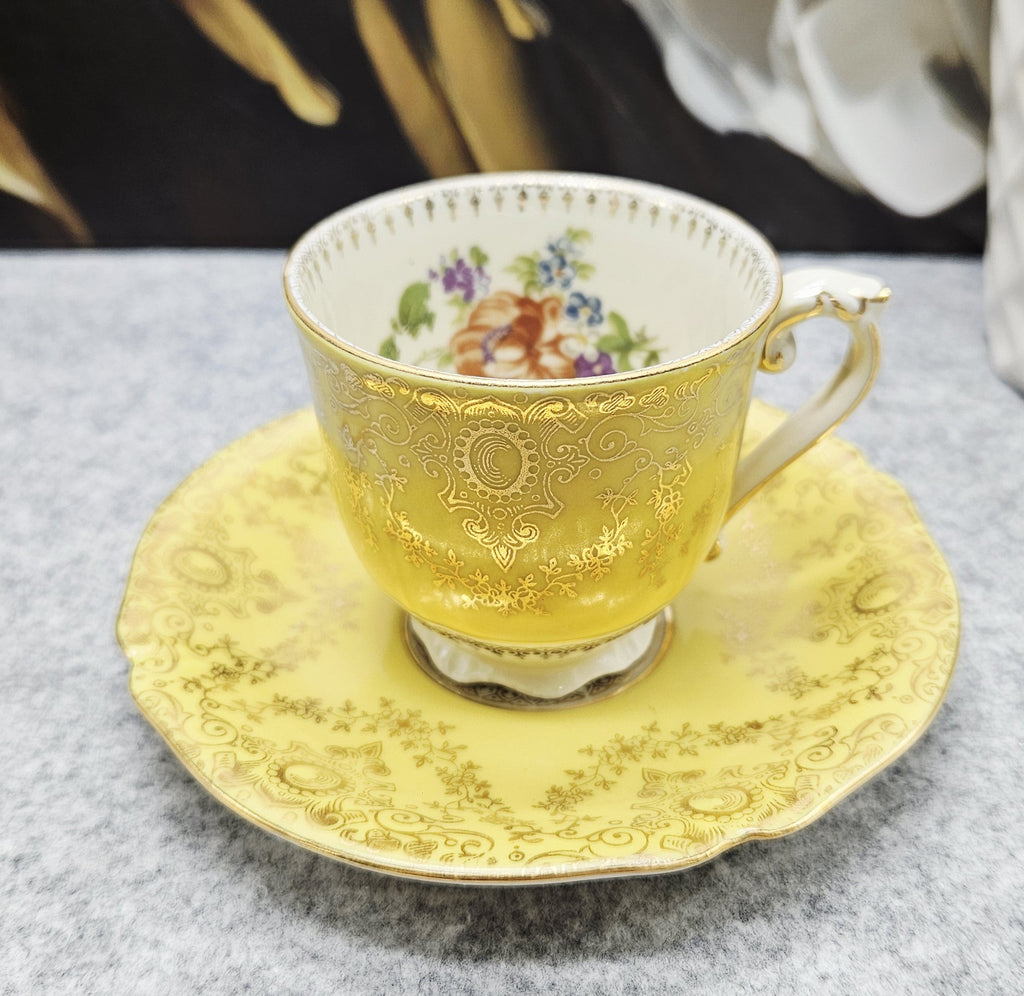 Diese außergewöhnliche Porzellantasse mit Untertasse aus der Zeit um 1940 ist ein elegantes Beispiel für deutsches Design aus der Zeit, in der die Produkte mit der für die deutsche Besatzung typischen Aufschrift "Deutschland" versehen waren. Das Set zeichnet sich durch eine besonders luxuriöse zitronengelbe Glasur, eine reiche Goldverzierung und fein geprägte Details aus. Das Innere der Tasse ist mit einer handgemalten Blumenkomposition verziert, die ihren aristokratischen Charme noch verstärkt.