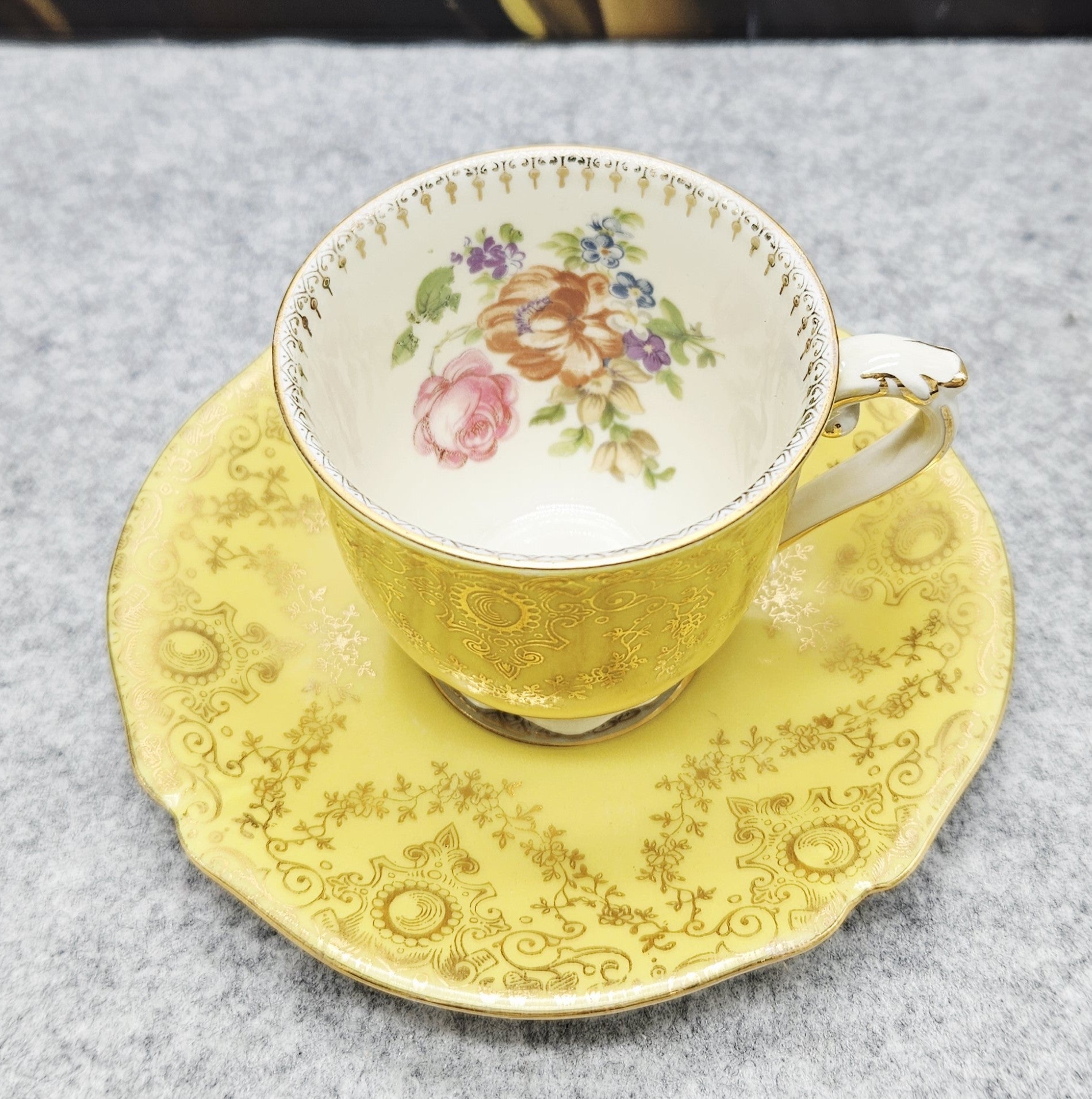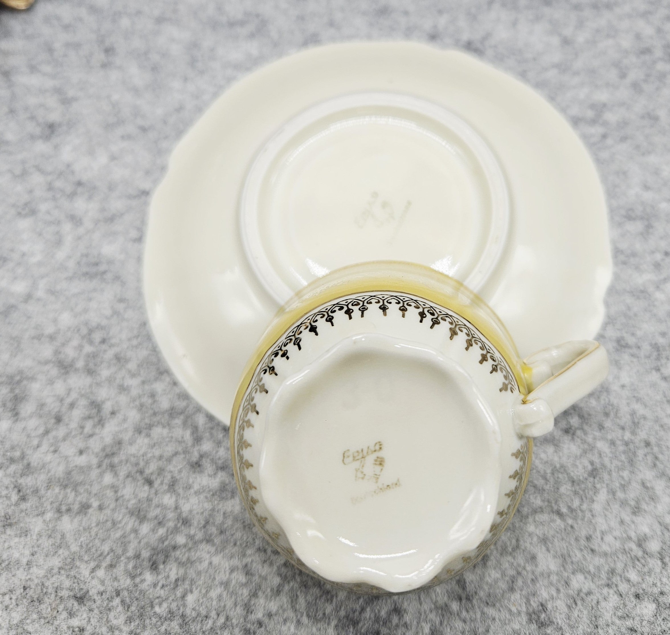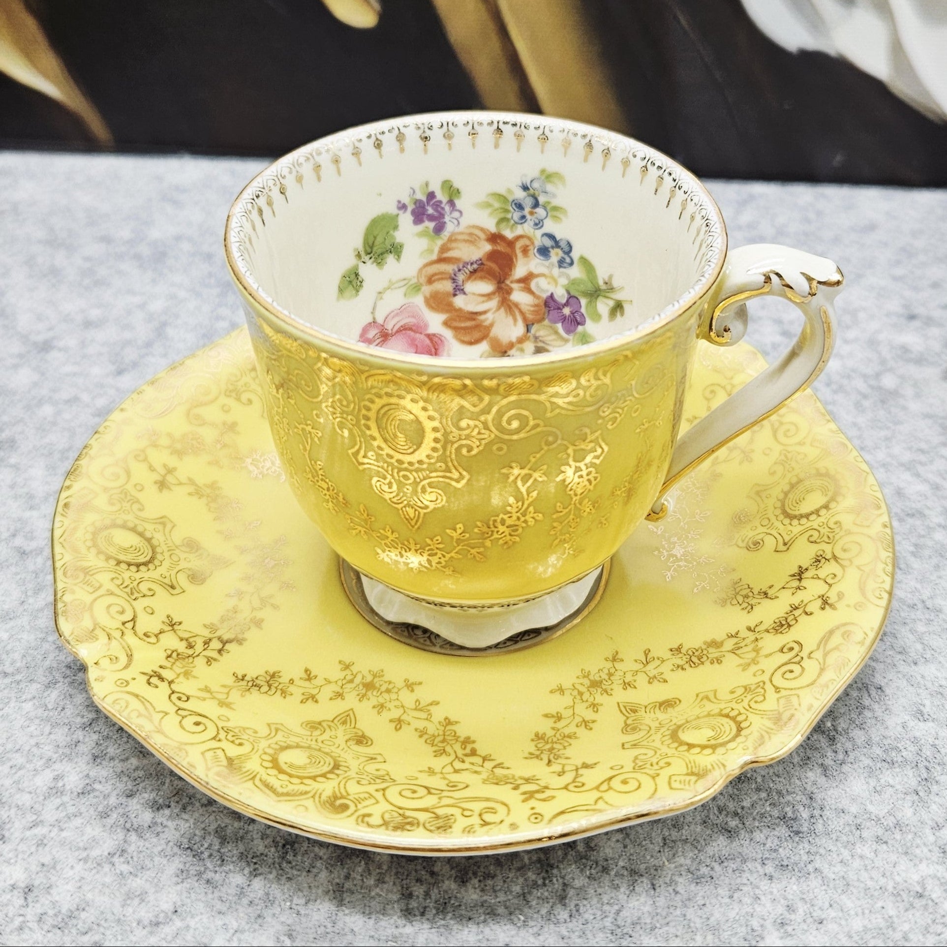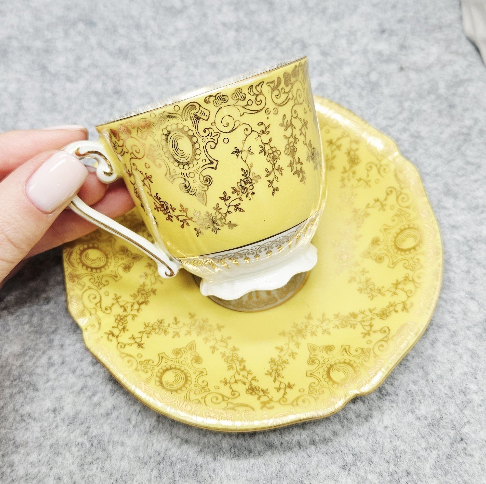 Diese außergewöhnliche Porzellantasse mit Untertasse aus der Zeit um 1940 ist ein elegantes Beispiel für deutsches Design aus der Zeit, in der die Produkte mit der für die deutsche Besatzung typischen Aufschrift "Deutschland" versehen waren. Das Set zeichnet sich durch eine besonders luxuriöse zitronengelbe Glasur, eine reiche Goldverzierung und fein geprägte Details aus. Das Innere der Tasse ist mit einer handgemalten Blumenkomposition verziert, die ihren aristokratischen Charme noch verstärkt.