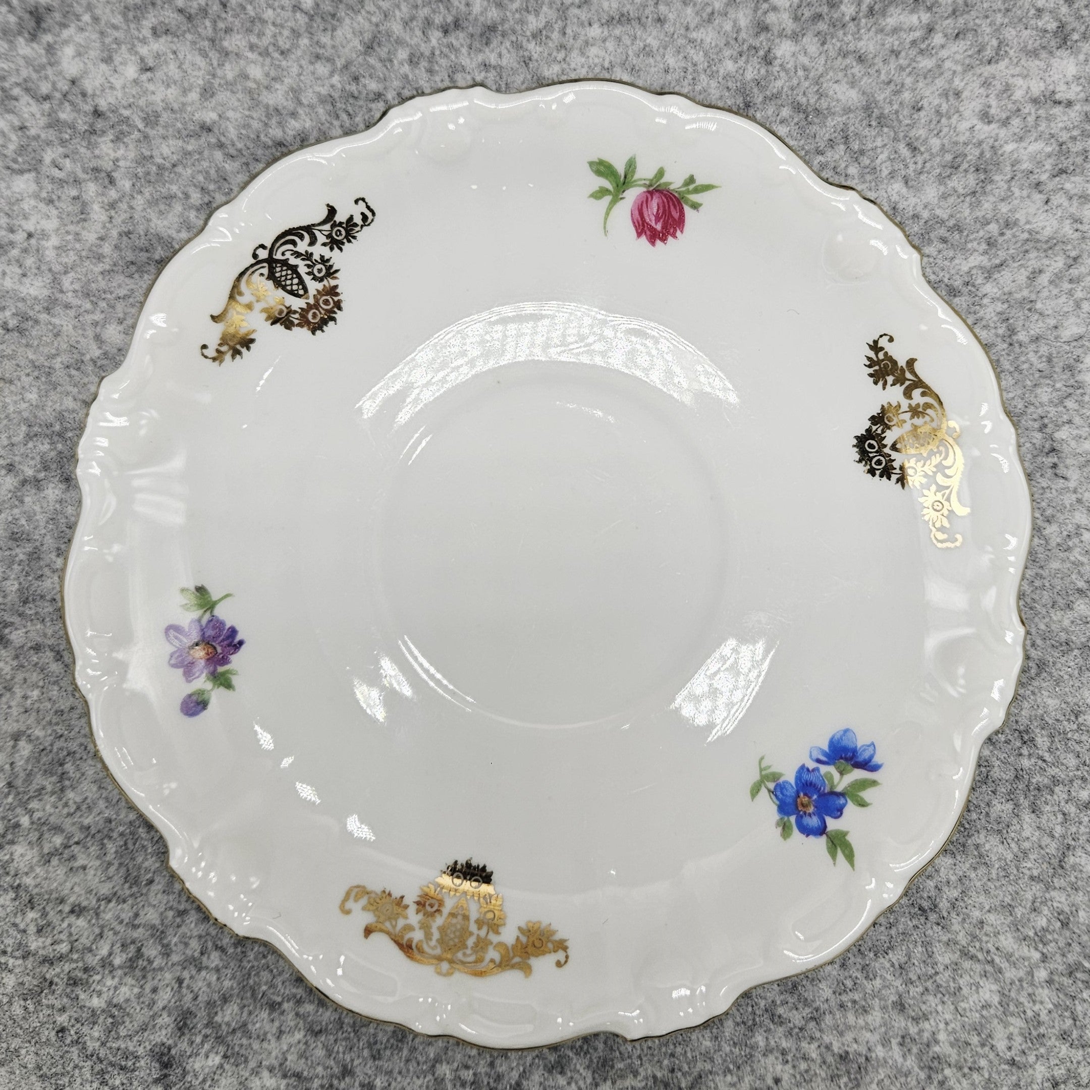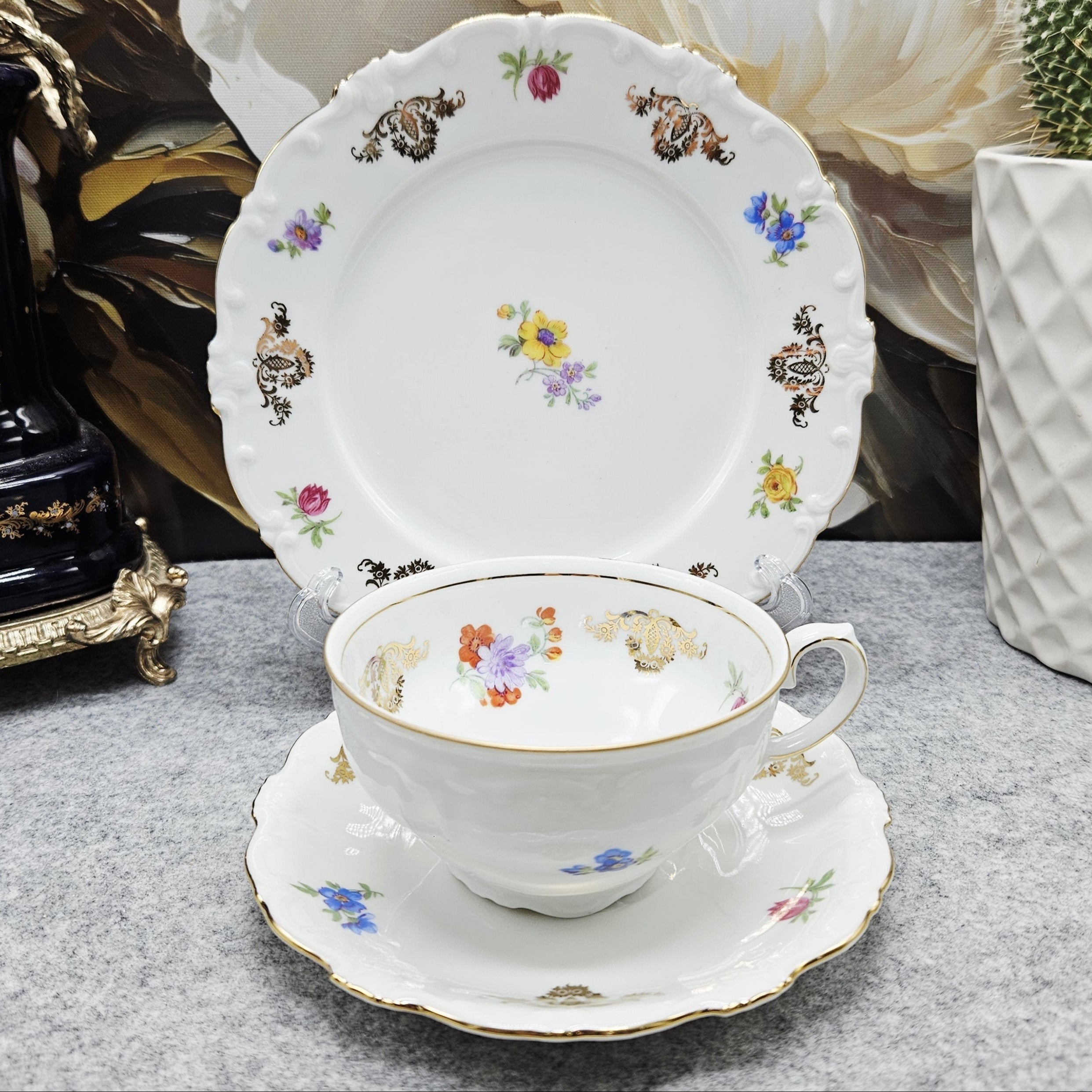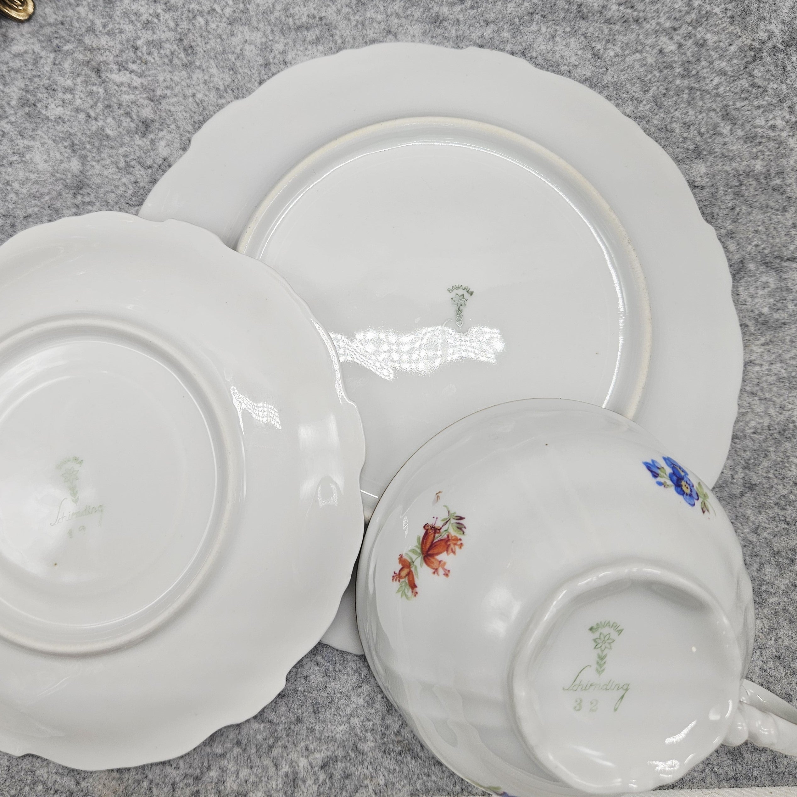 Ein klassisches Trio aus Schirnding Bavaria Porzellan, das sich durch seine Eleganz und sein feines Dekor auszeichnet. Das Set besteht aus einer Teetasse, einer Untertasse und einem Dessertteller aus hochwertigem weißen bayerischen Porzellan. Die Formen sind anmutig, mit sanft gewellten Rändern, typisch für den traditionellen deutschen Stil.