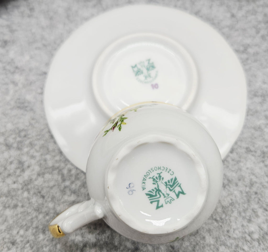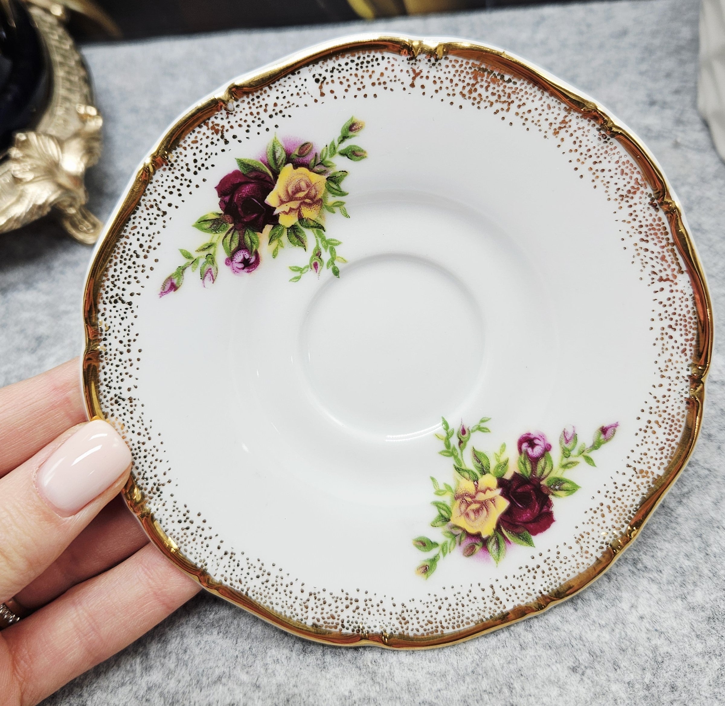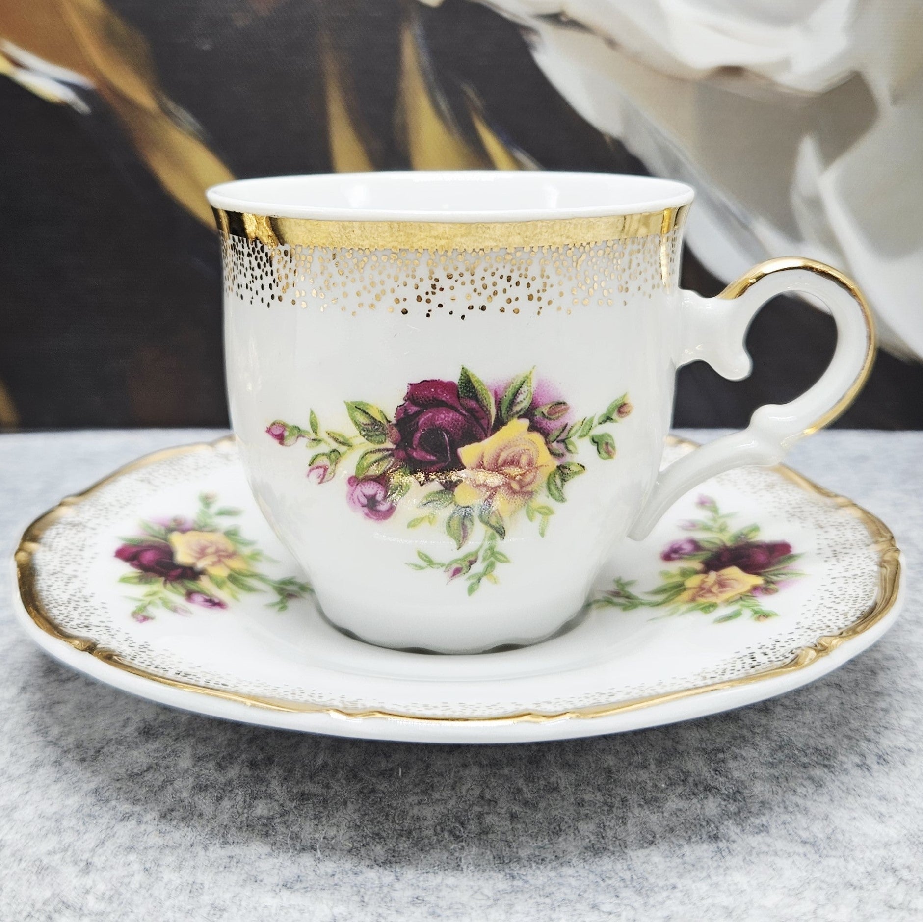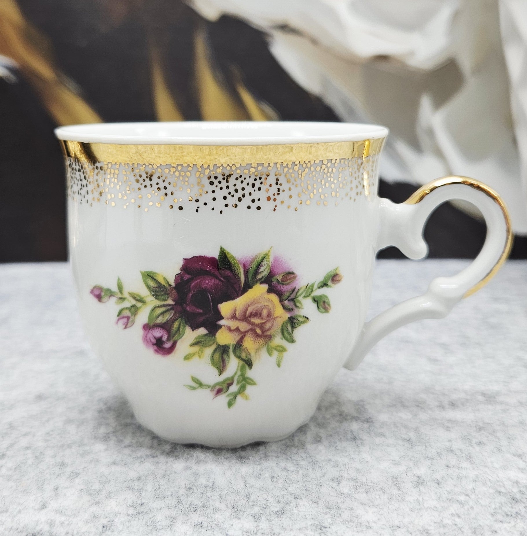 Dieses elegante Porzellan-Set mit Tasse und Untertasse hat einen klassisch-romantischen Stil. Das Design des Sets ist mit leuchtenden Rosenbouquets verziert, die satte burgunderrote, rosa und gelbe Farben kombinieren. Die Ränder der Tasse und der Untertasse sind mit einem goldenen, gepunkteten Ornament verziert, das in eine zarte Prägeform übergeht und dem Set eine luxuriöse und zarte Raffinesse verleiht.