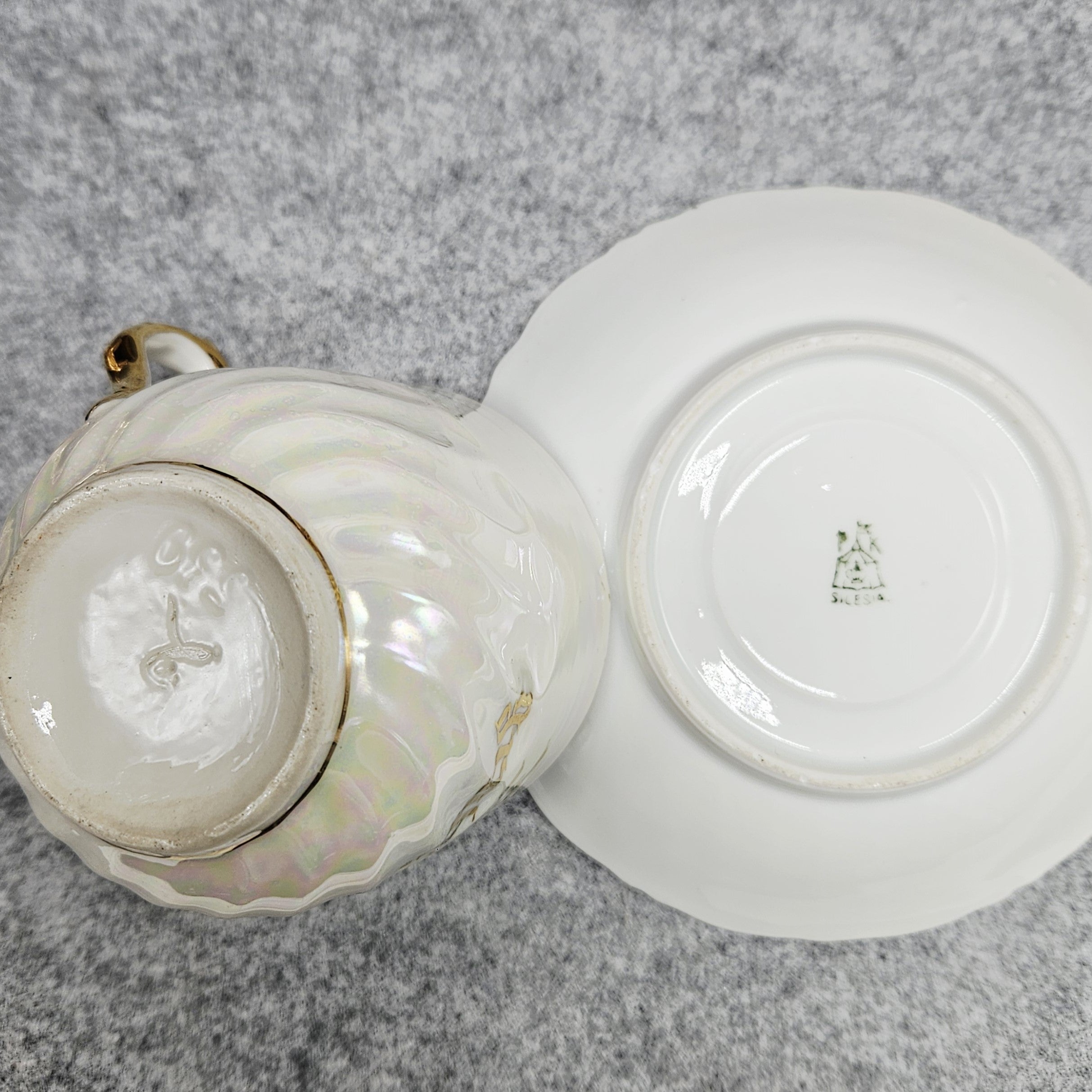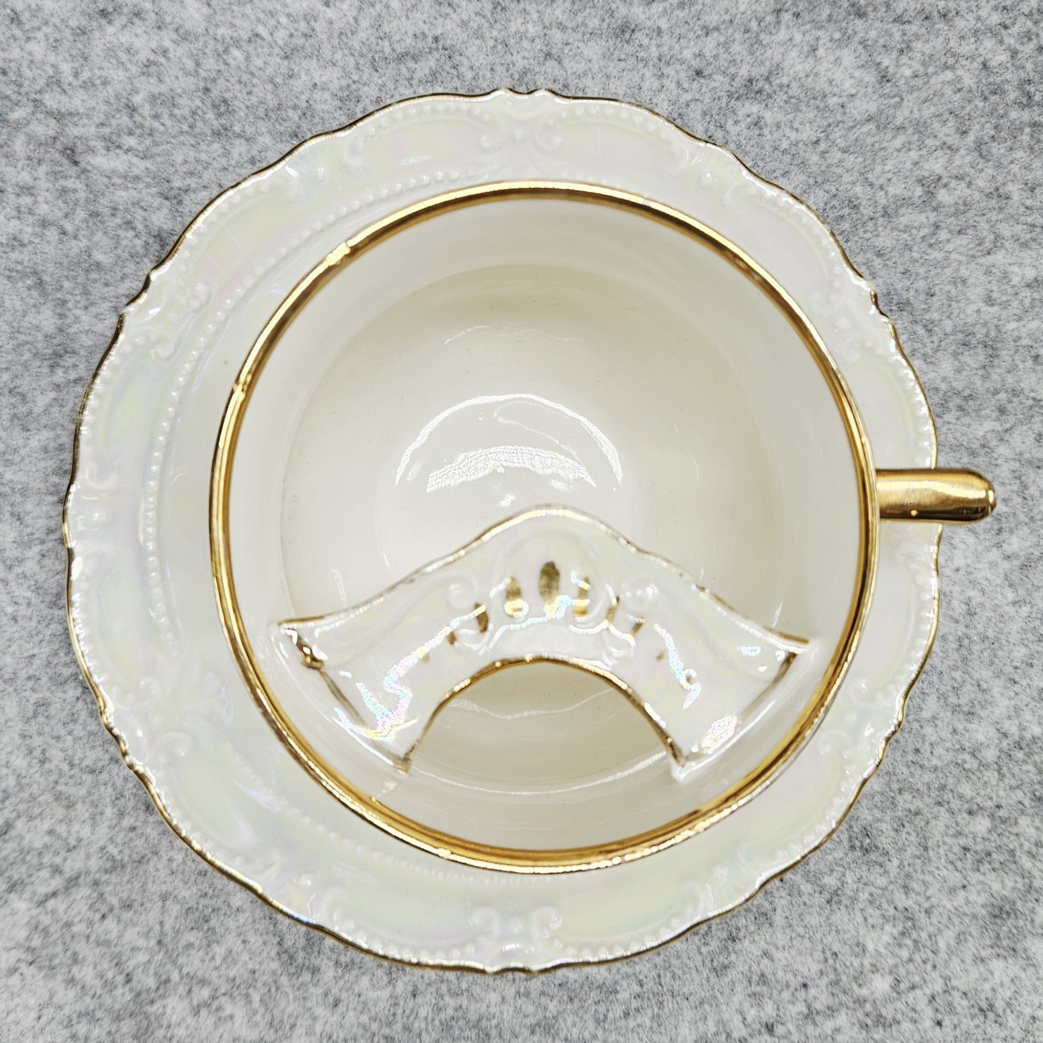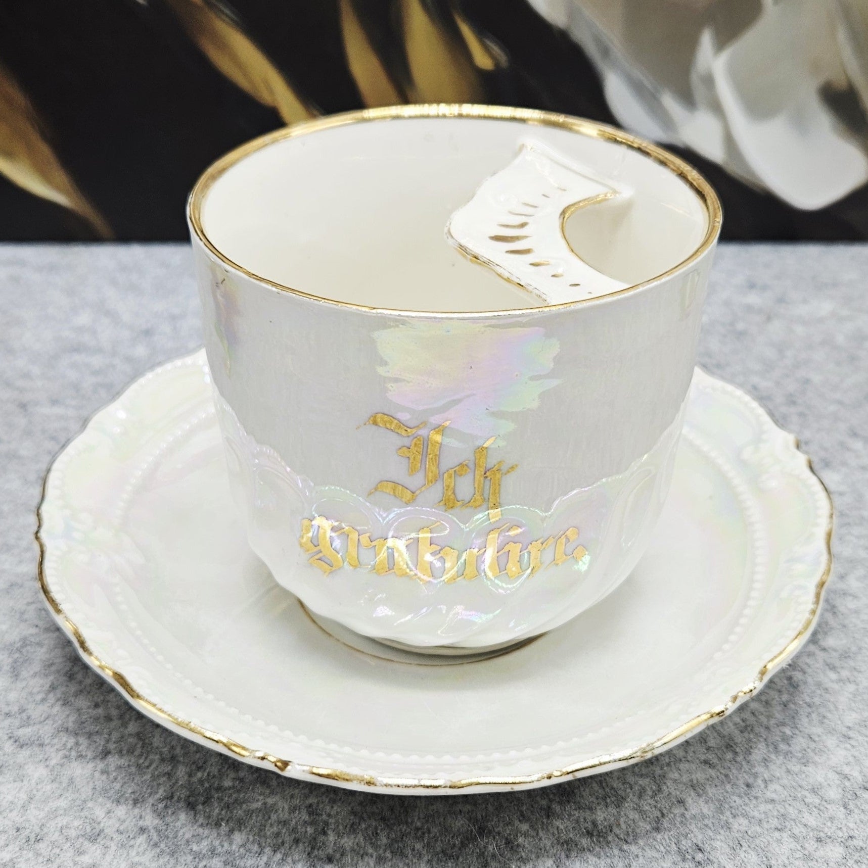 Die Tasse besteht aus weißem Porzellan mit einer dünnen Schicht Perlmutt, die im Licht sanft ihre Schattierungen verändert. Die Vorderseite ist mit der deutschen Inschrift Ich gratulire" in Gold verziert, die für Gedenkteller typisch ist. Die Ränder sind zart vergoldet, und die wellenförmige Kontur des Tellers verleiht ihm eine leichte dekorative Note.