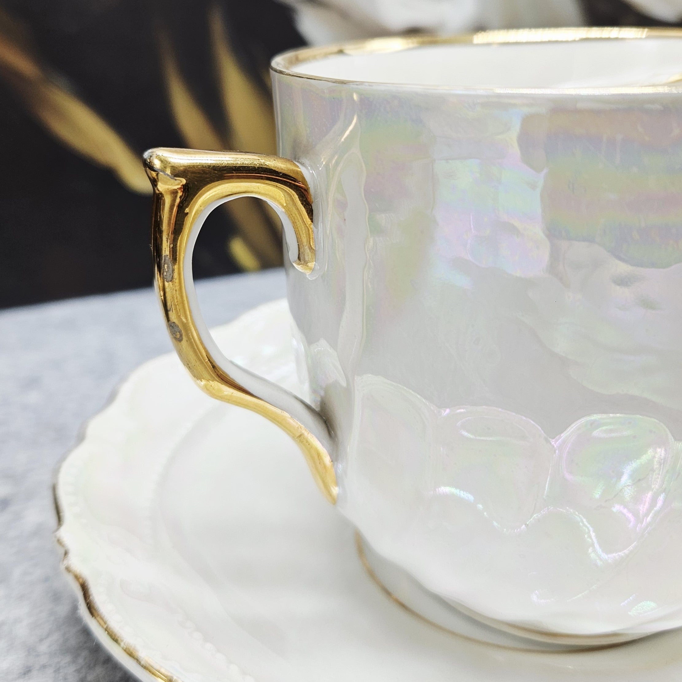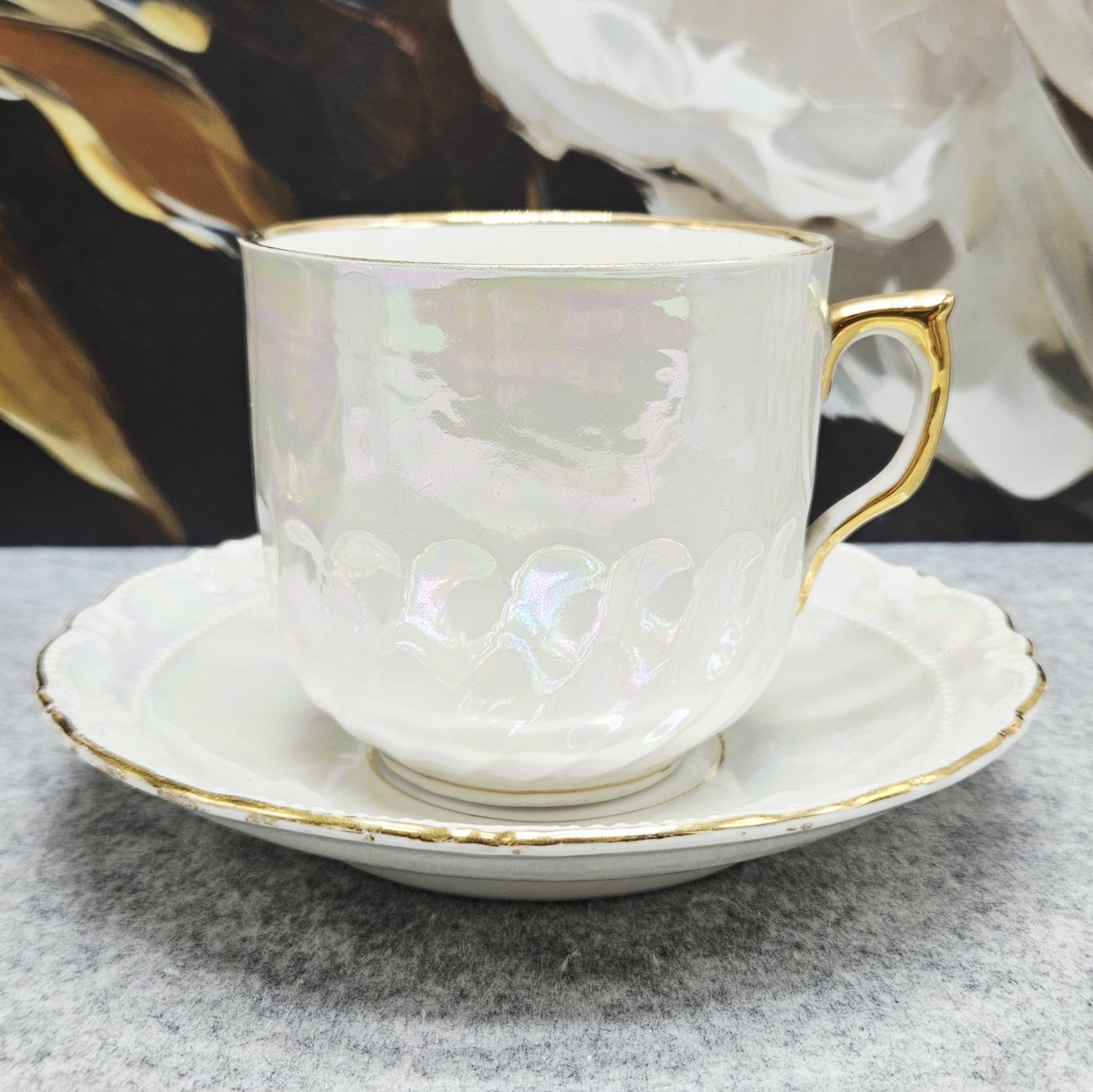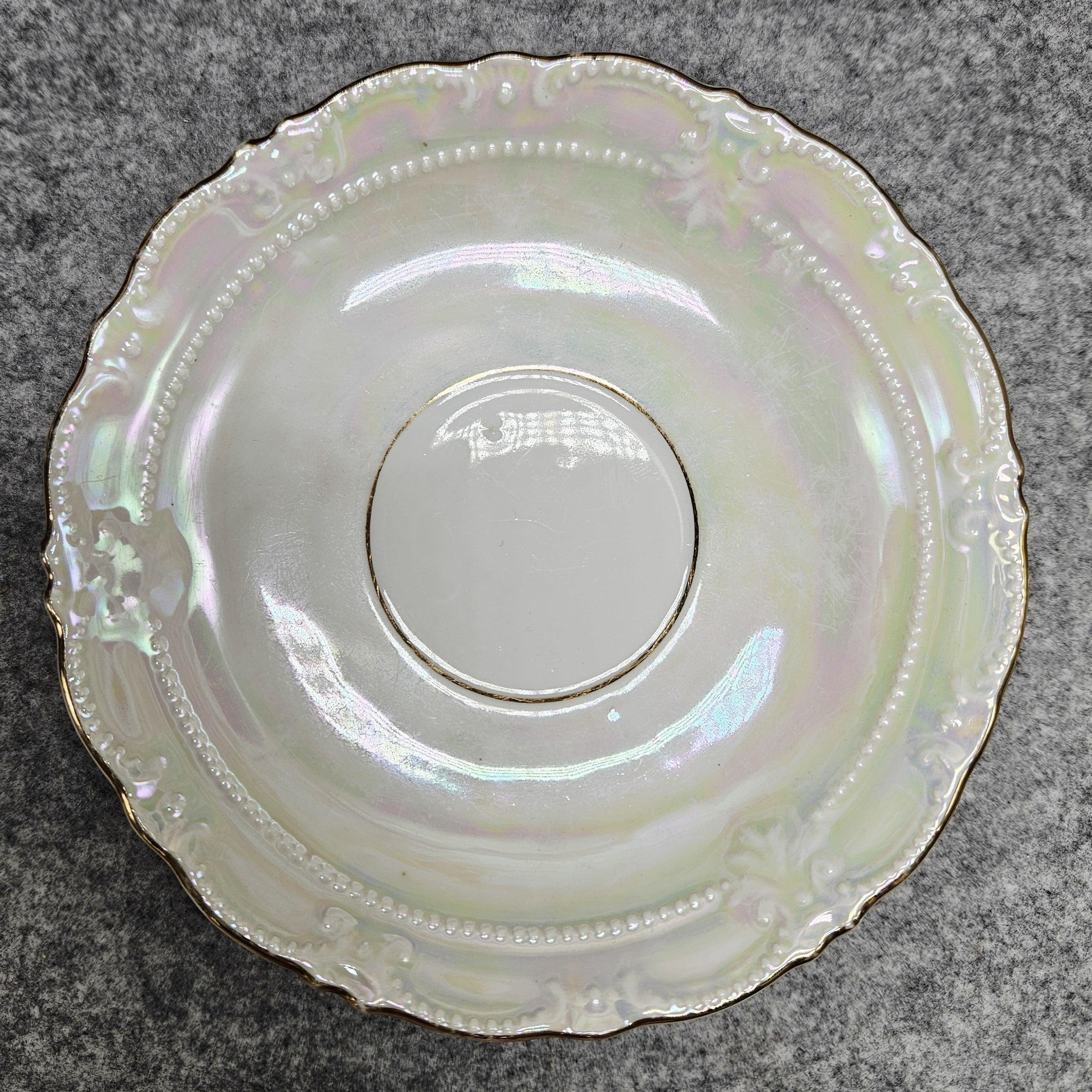 Die Tasse besteht aus weißem Porzellan mit einer dünnen Schicht Perlmutt, die im Licht sanft ihre Schattierungen verändert. Die Vorderseite ist mit der deutschen Inschrift Ich gratulire" in Gold verziert, die für Gedenkteller typisch ist. Die Ränder sind zart vergoldet, und die wellenförmige Kontur des Tellers verleiht ihm eine leichte dekorative Note.