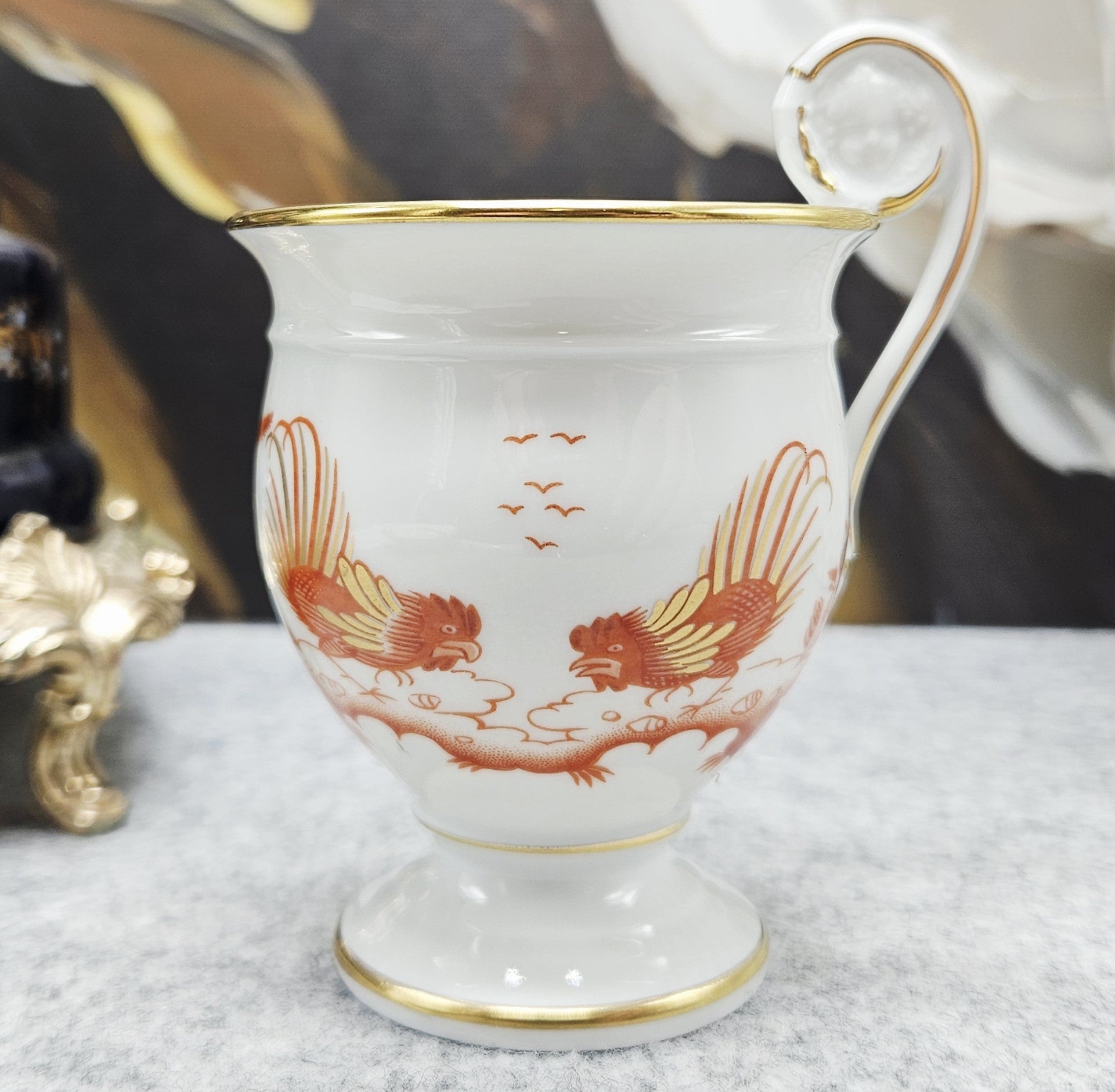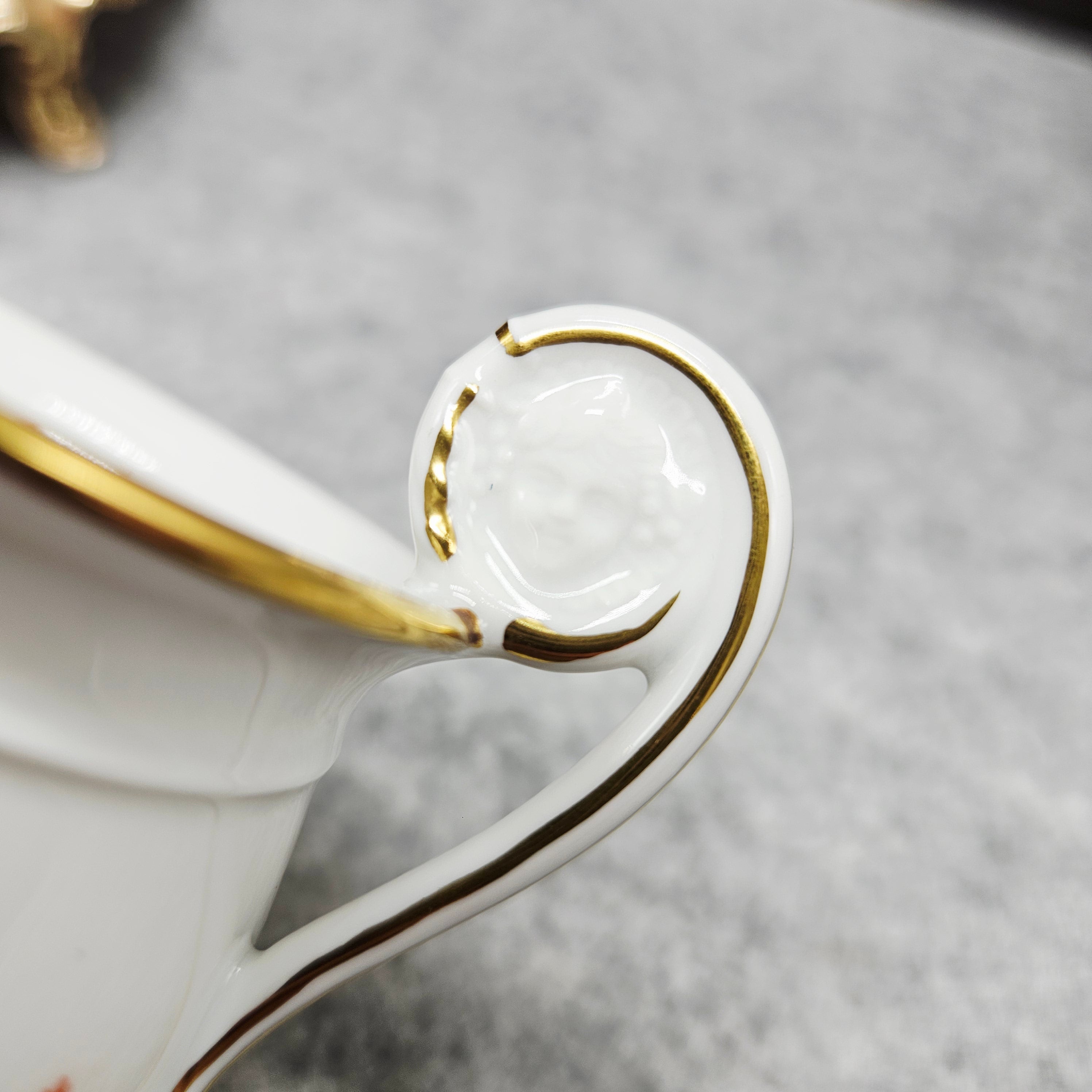 Eine Espressotasse aus Porzellan von Richard Ginori Italien, exklusiv entworfen, verziert mit einer Hahnenkampfszene und goldenen Details. Die Tasse wird durch einen stark verzierten Henkel mit geprägtem Gesicht akzentuiert.