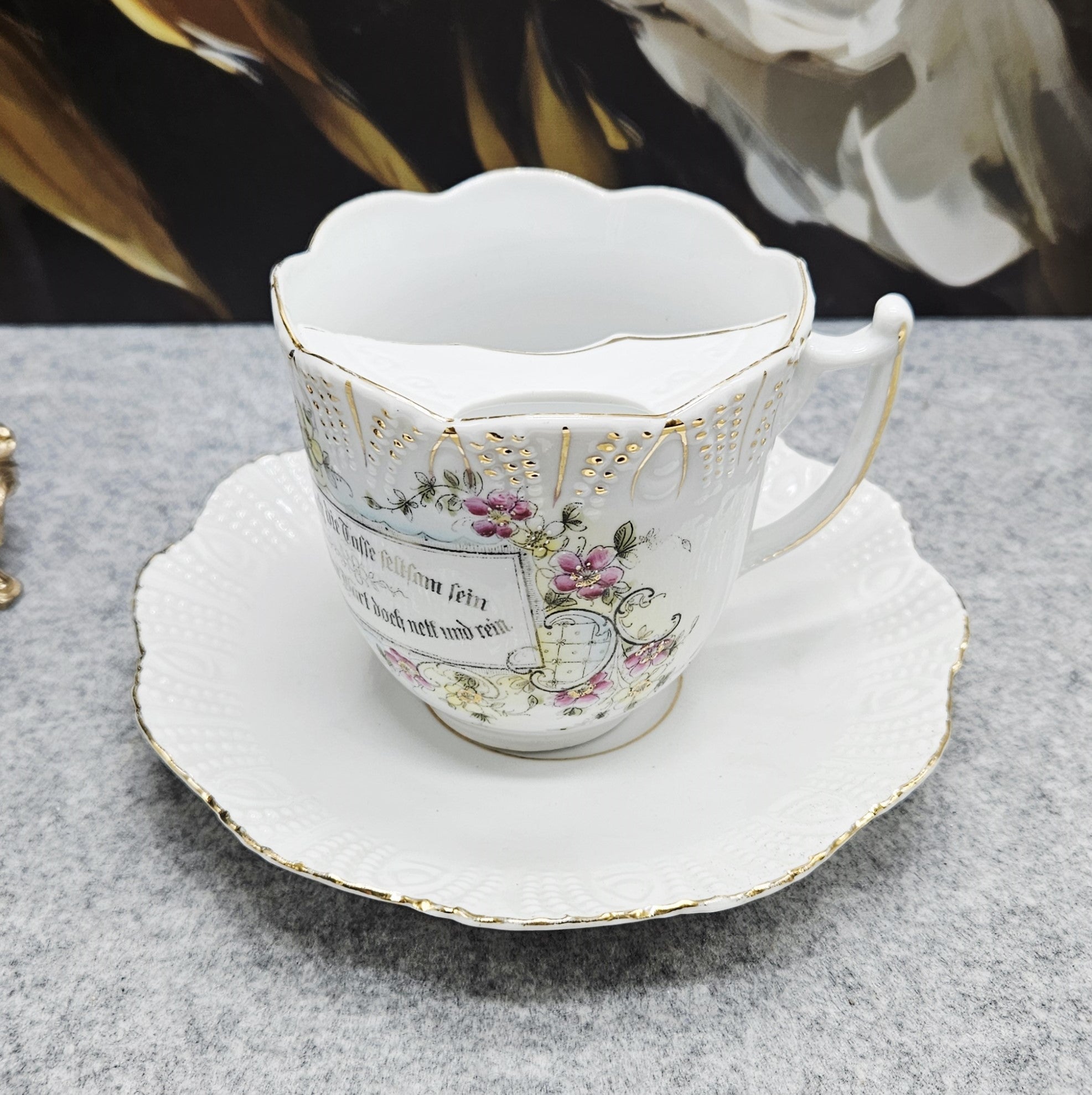 Sammlertasse und Untertasse mit Schnurrbartschutz. Hergestellt zu Begi – meinantik.de