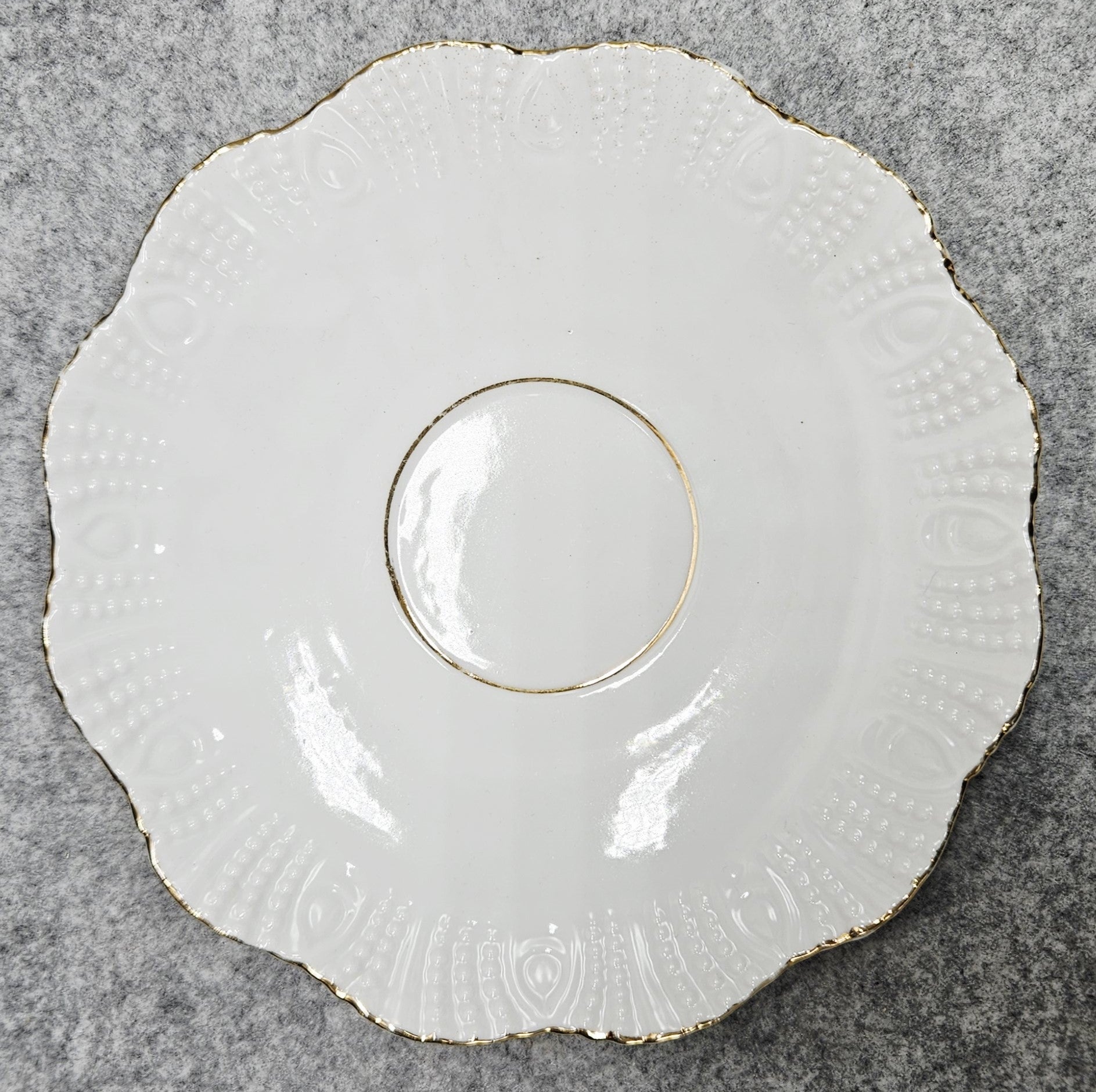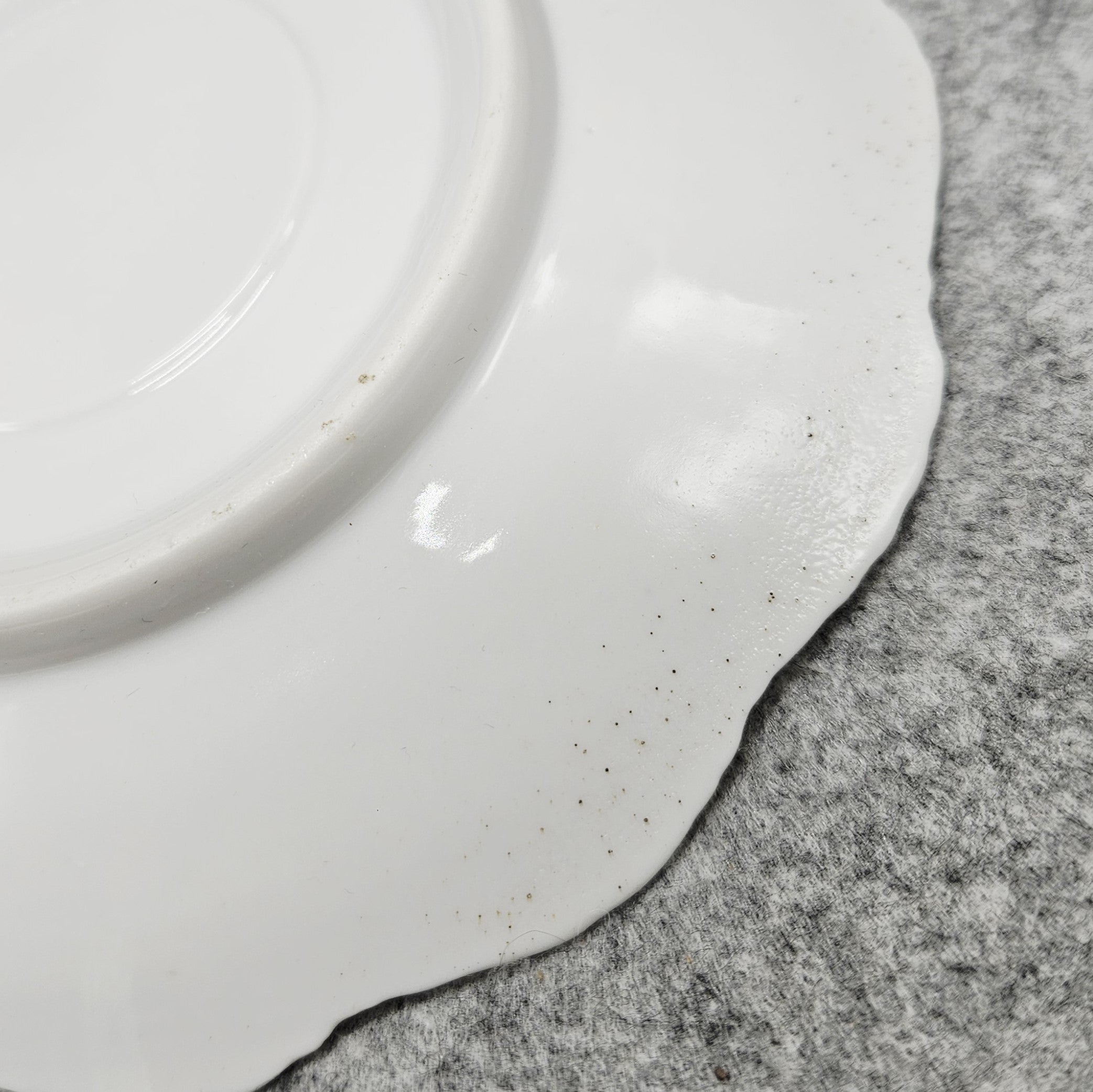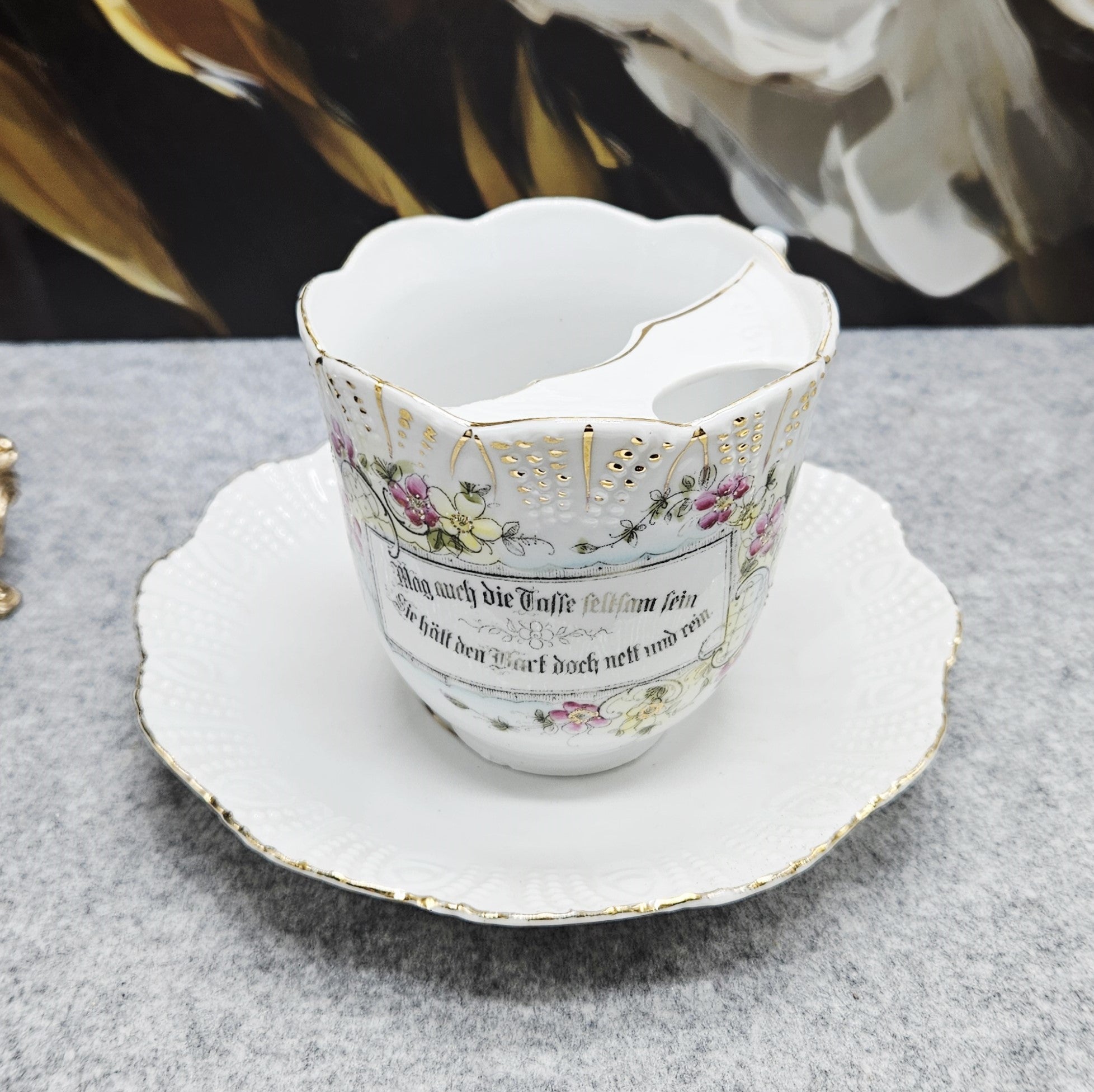 Die Tasse ist aus weißem Porzellan gefertigt und mit rosa und gelblichen Blumen und goldenen Ornamenten verziert. Die Ränder sind zart vergoldet, und die wellenförmige Kontur der Untertasse und das Prägemuster verleihen ihr einen leichten Hauch von Glamour.