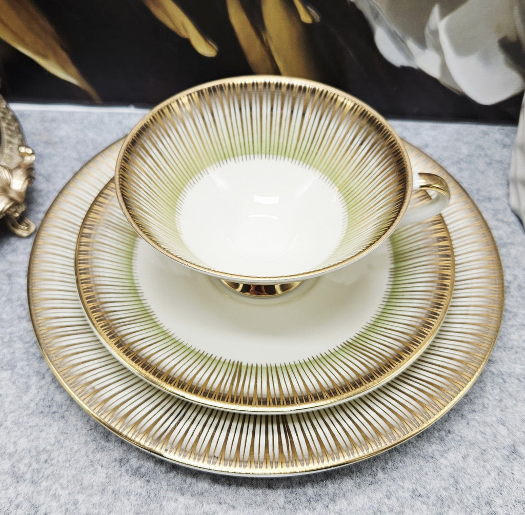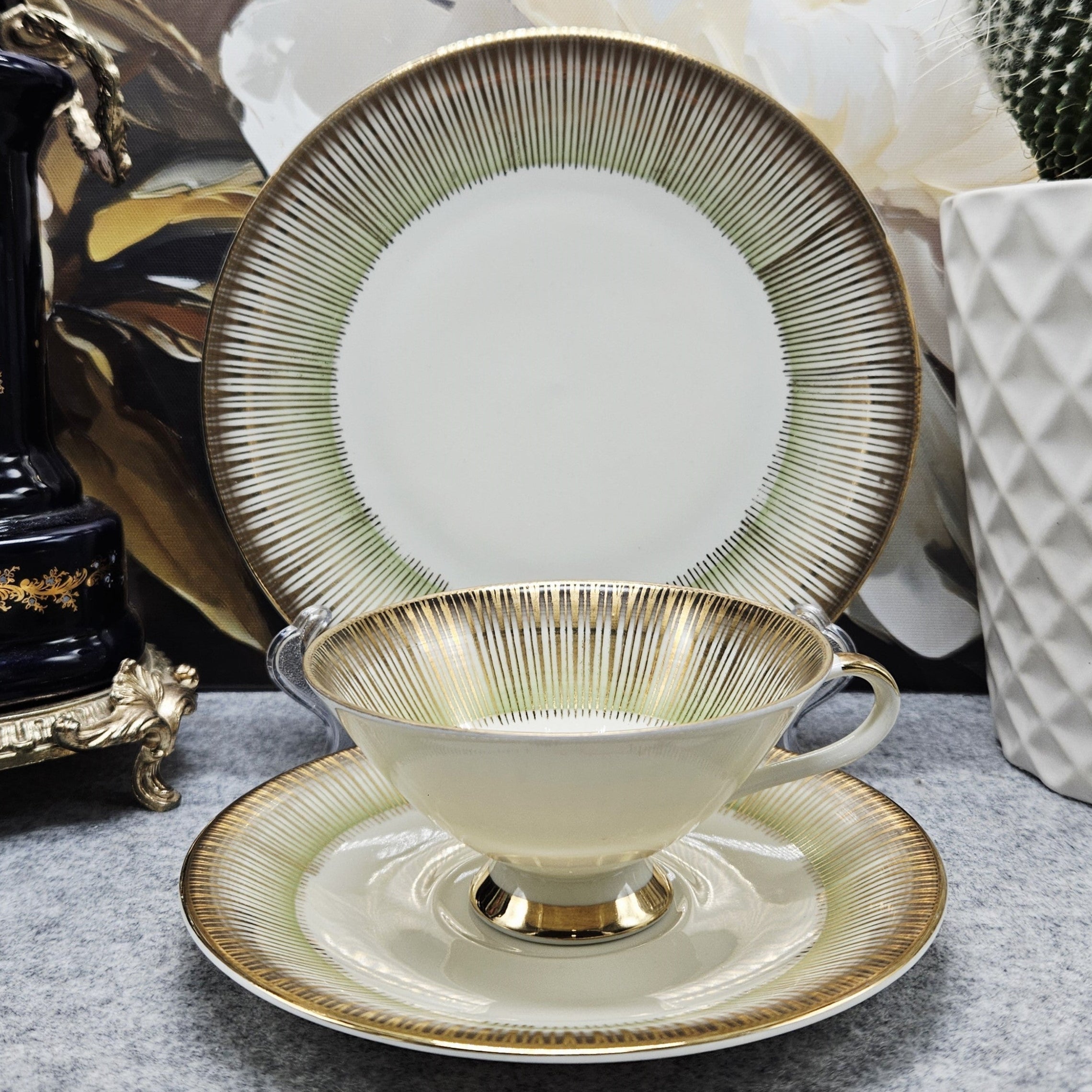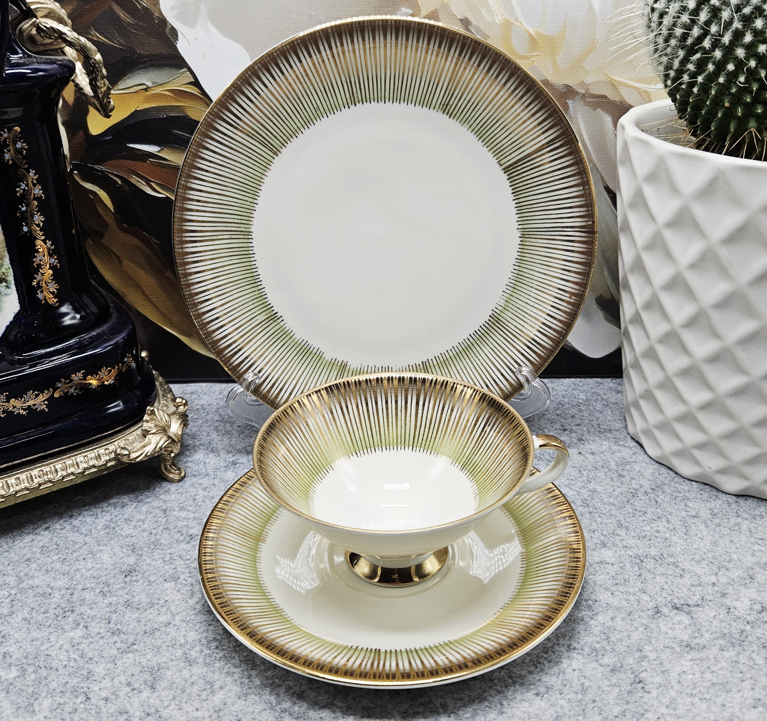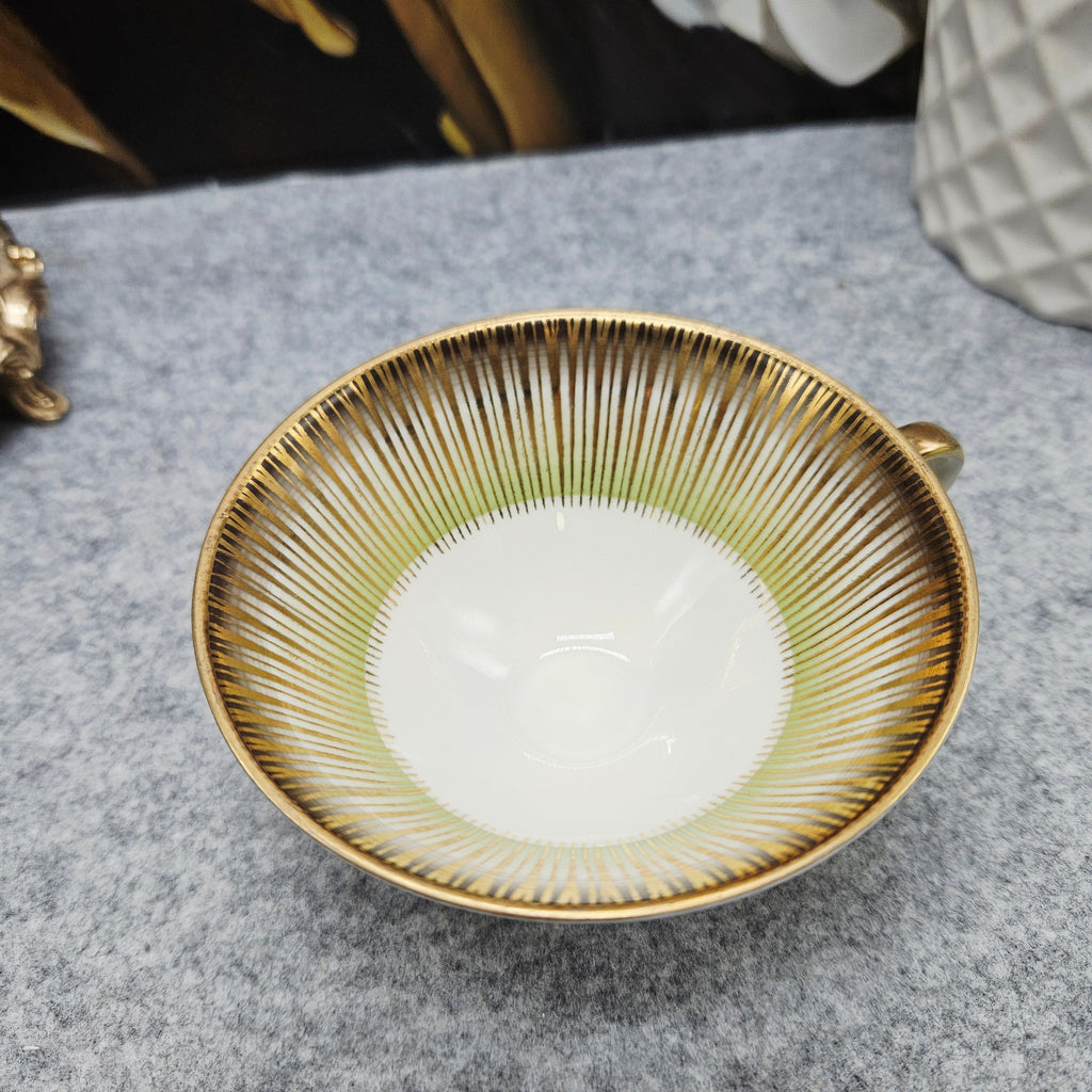 Ein raffiniertes Set aus hochwertigem Porzellan, hergestellt in der Schirndinger Manufaktur QUALITÄTS-PORZELLAN in Deutschland. Es ist eine Kombination aus zarter Klassik und moderner Eleganz - das weiche cremefarbene Porzellan ist mit dichten, präzisen goldenen und zart grünlichen Strahlen verziert, die ein Lichtspiel und eine optische Illusion von Tiefe erzeugen. Jedes Element wird durch einen luxuriösen Goldakzent ergänzt, der am Fuß und am Rand der Tasse besonders schön zur Geltung kommt.