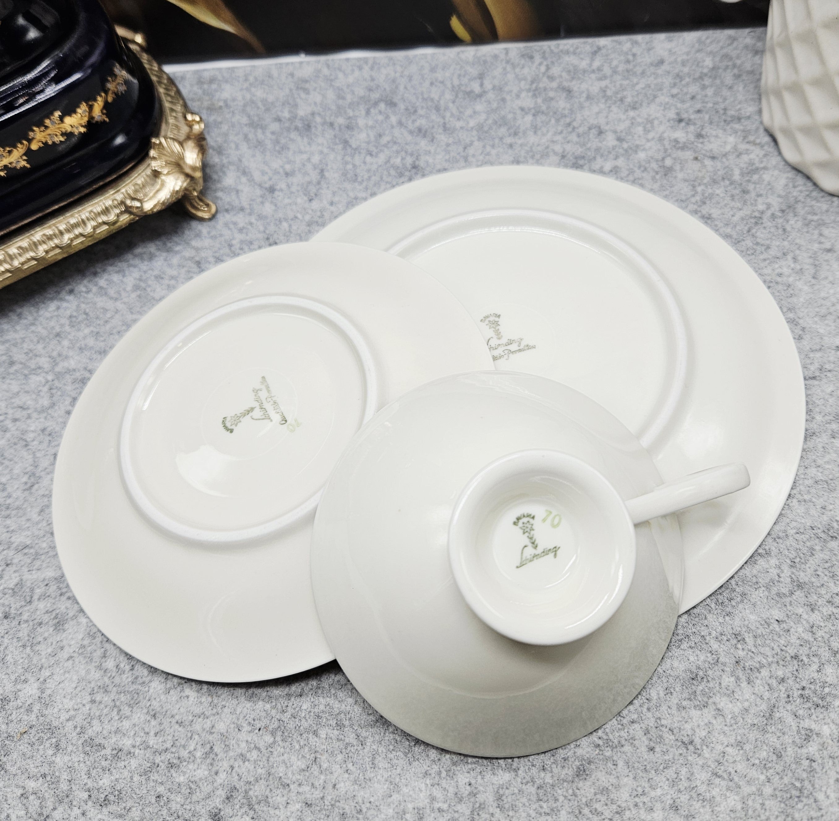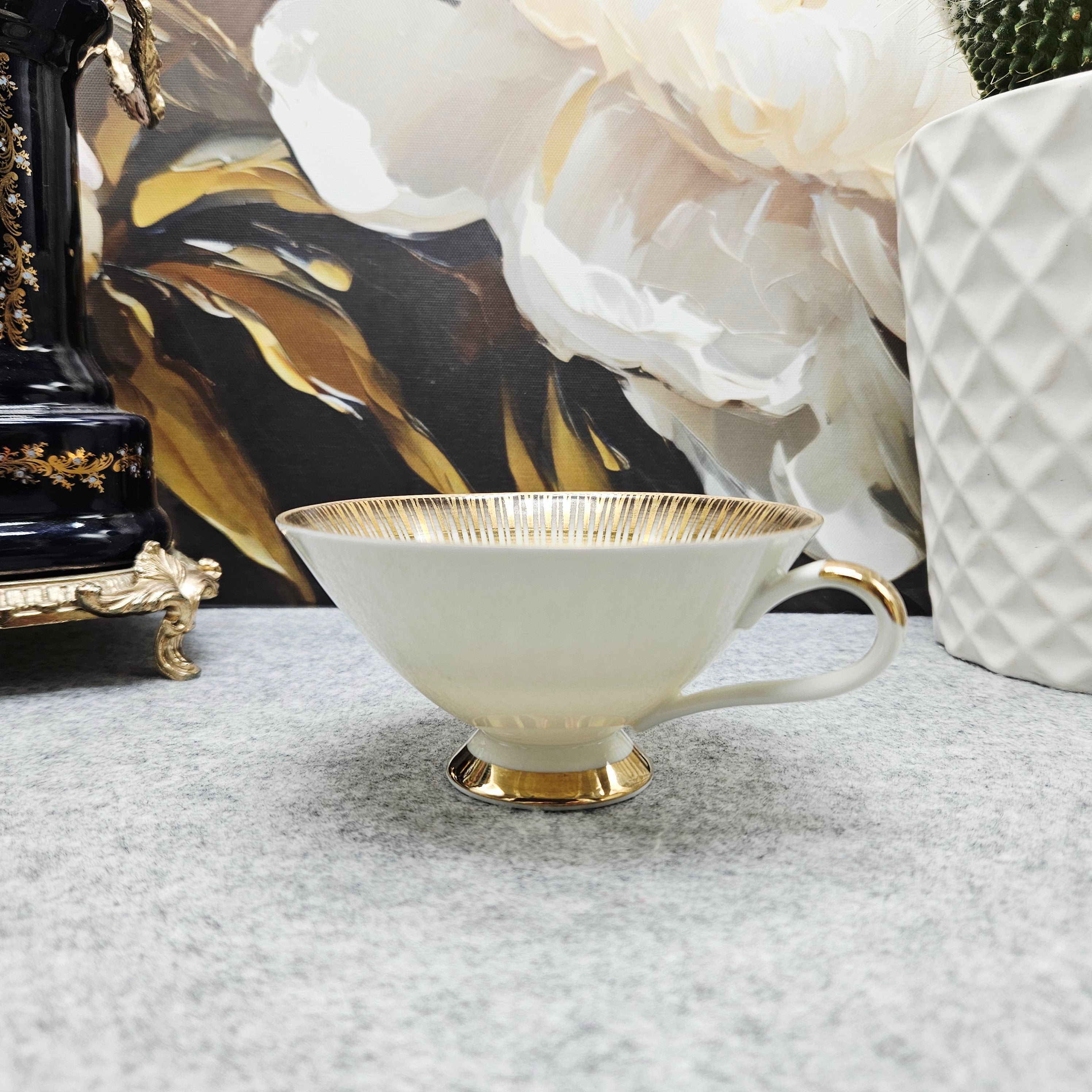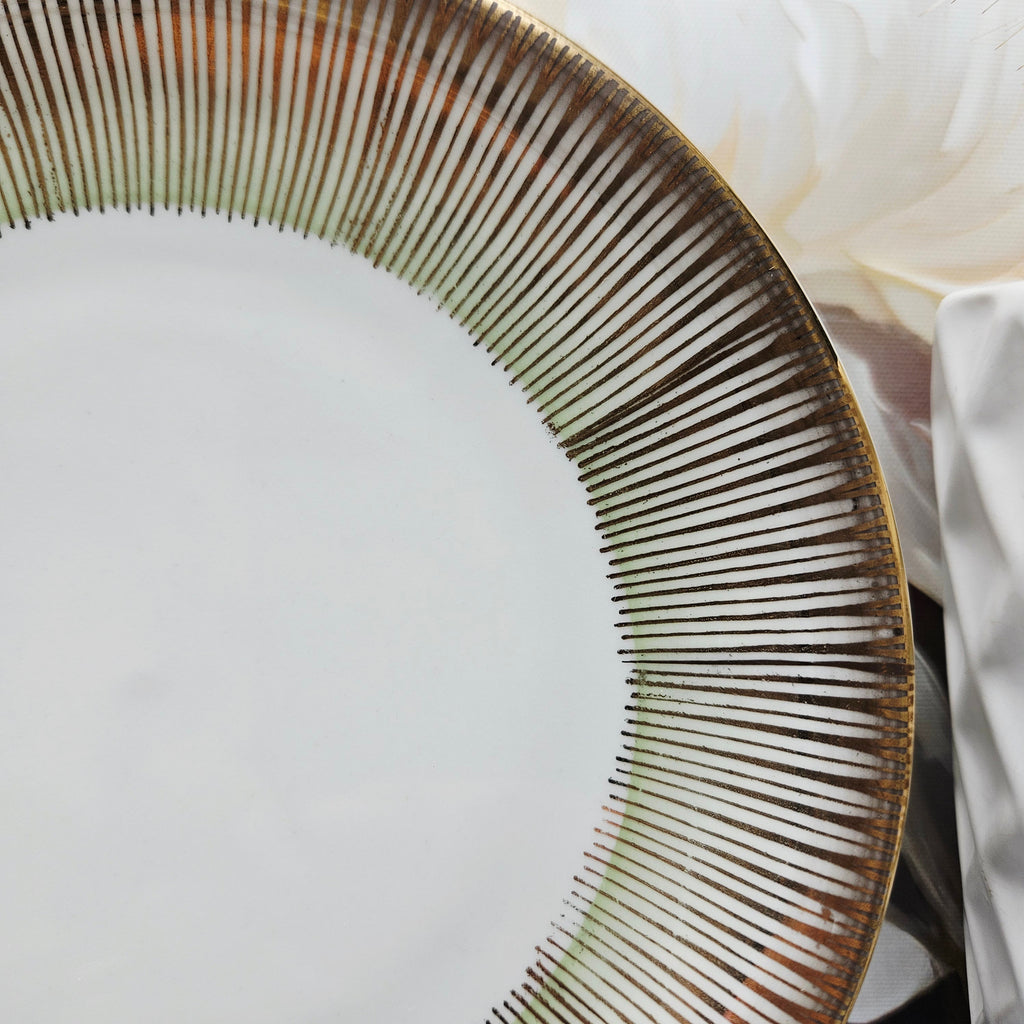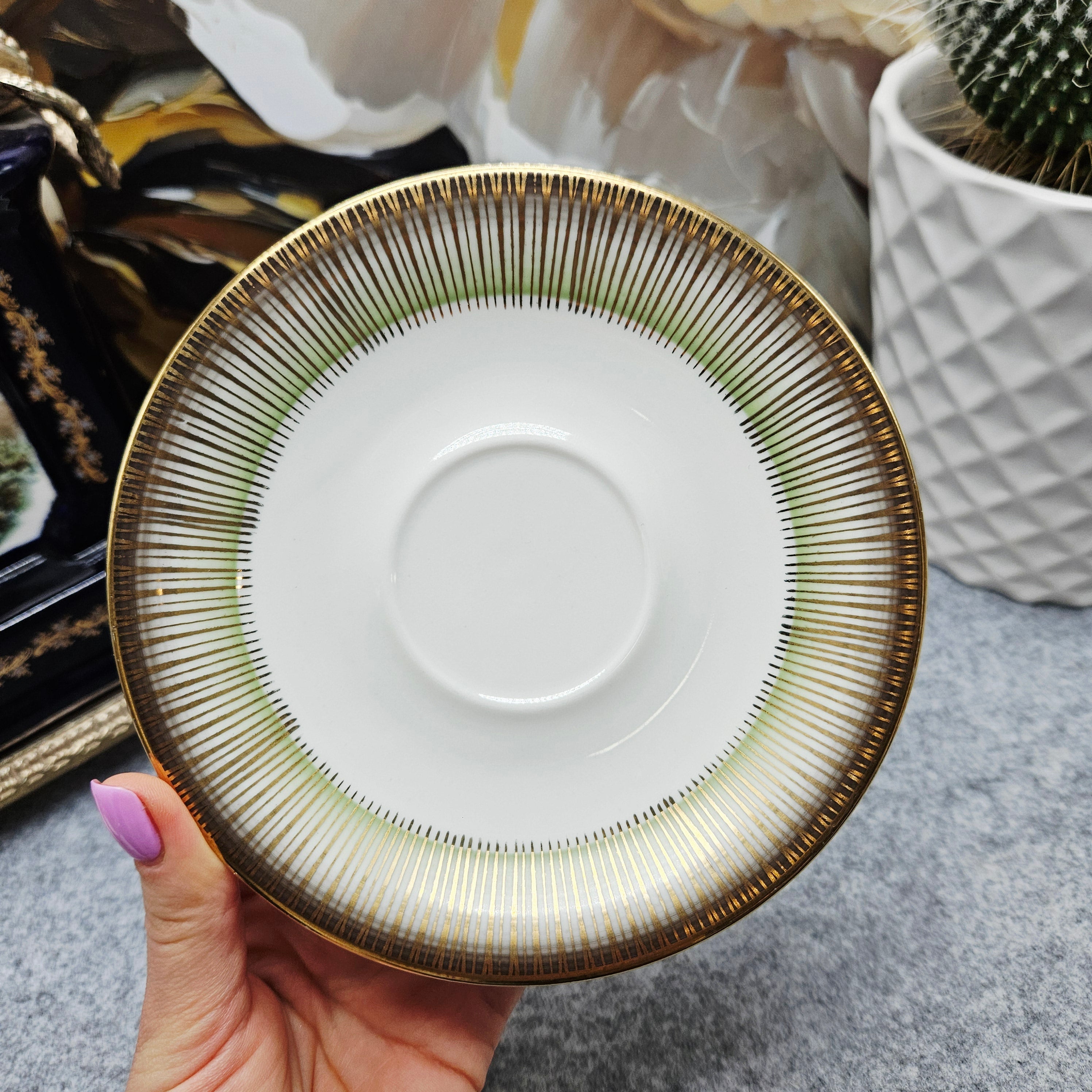 Ein raffiniertes Set aus hochwertigem Porzellan, hergestellt in der Schirndinger Manufaktur QUALITÄTS-PORZELLAN in Deutschland. Es ist eine Kombination aus zarter Klassik und moderner Eleganz - das weiche cremefarbene Porzellan ist mit dichten, präzisen goldenen und zart grünlichen Strahlen verziert, die ein Lichtspiel und eine optische Illusion von Tiefe erzeugen. Jedes Element wird durch einen luxuriösen Goldakzent ergänzt, der am Fuß und am Rand der Tasse besonders schön zur Geltung kommt.